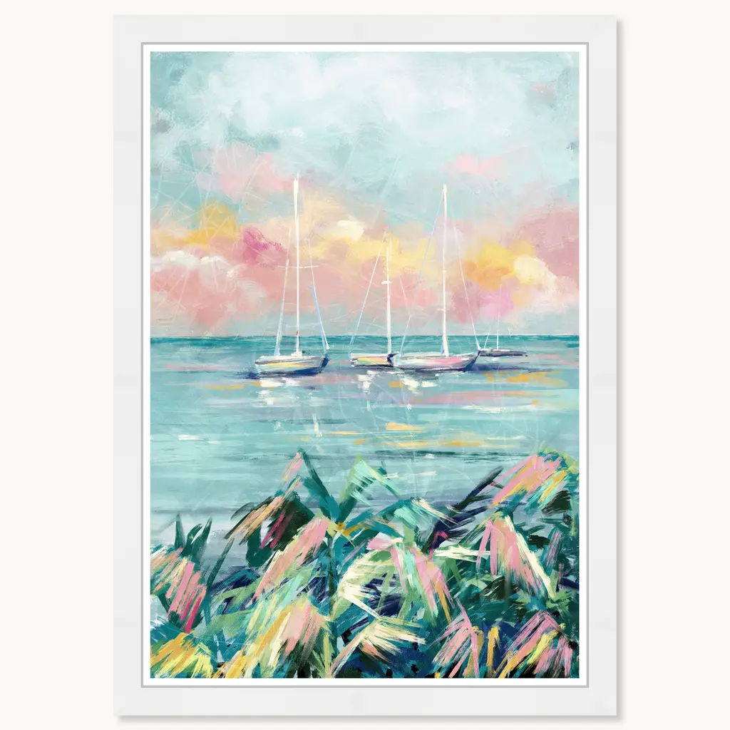 A white sailboat drifts at sea against a vibrant twilight-hour sky in this coastal wall art by Israeli artist Osnat Tzadok. Blending abstract landscapes and modern techniques, Tzadok began their career in painting over 20 years ago and has showcased their work around the world. Printed on canvas, this work of art comes ready to hang in a white frame.