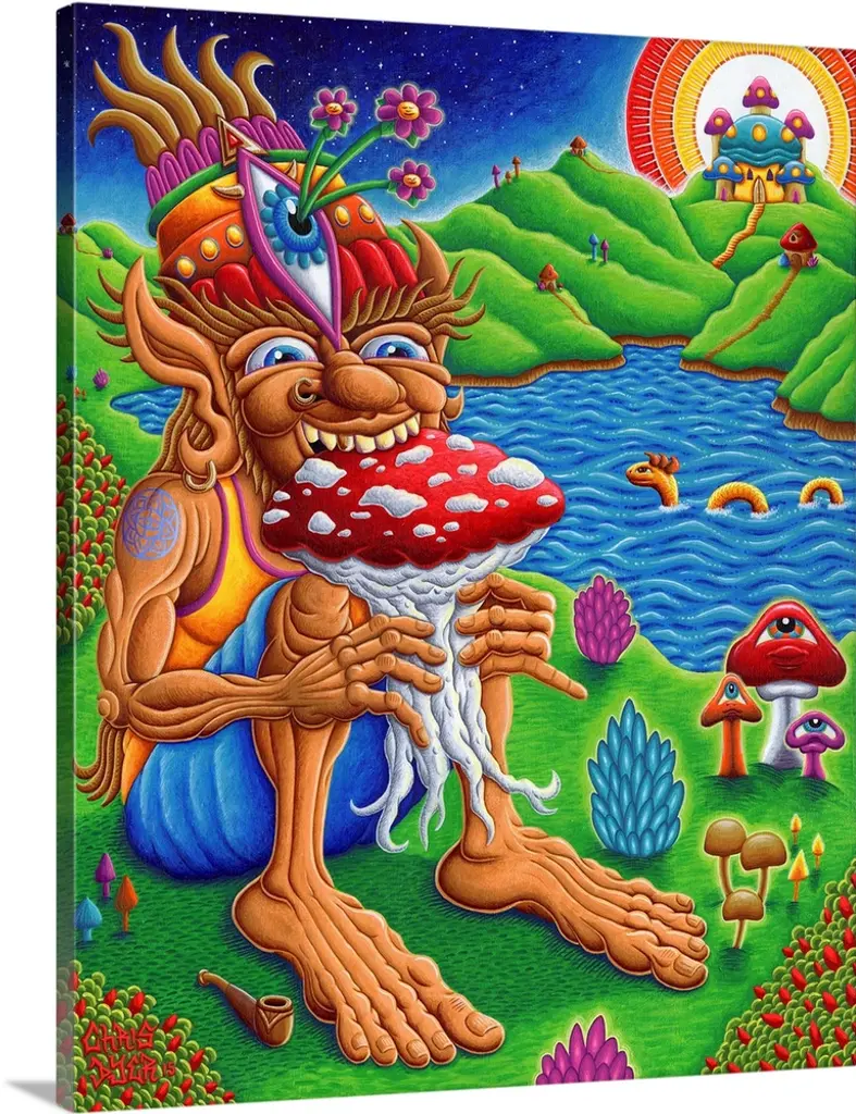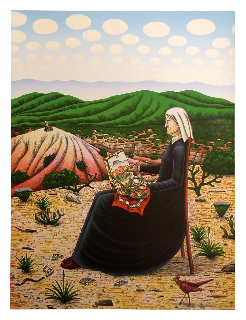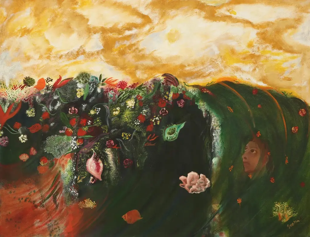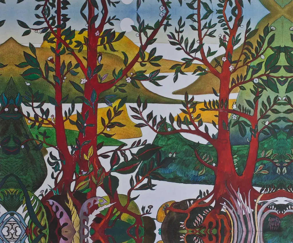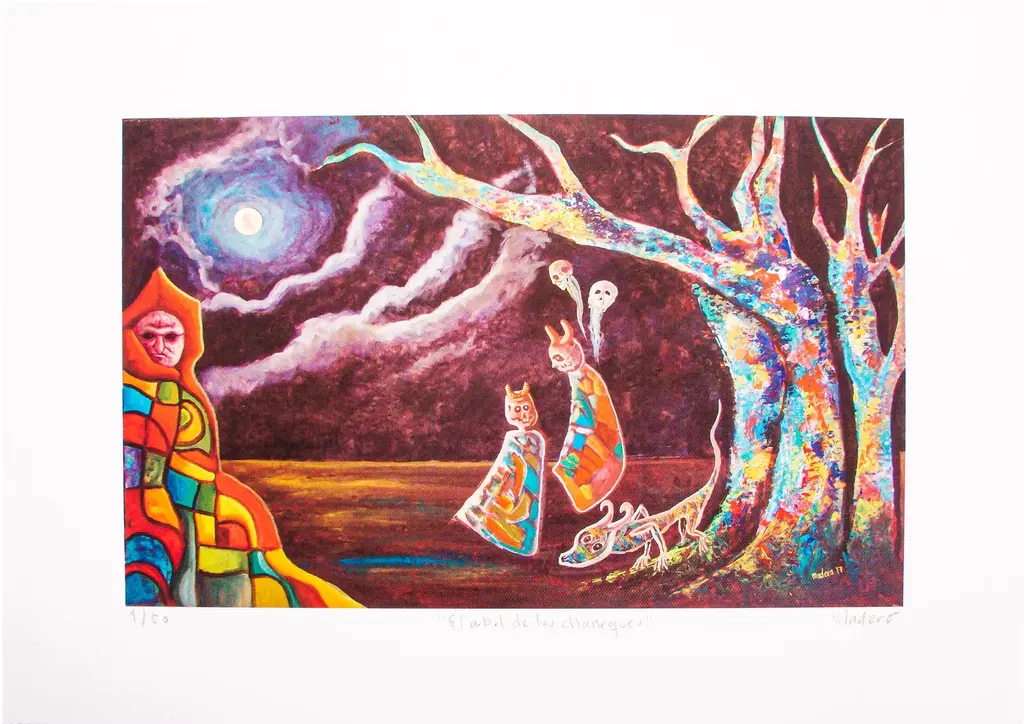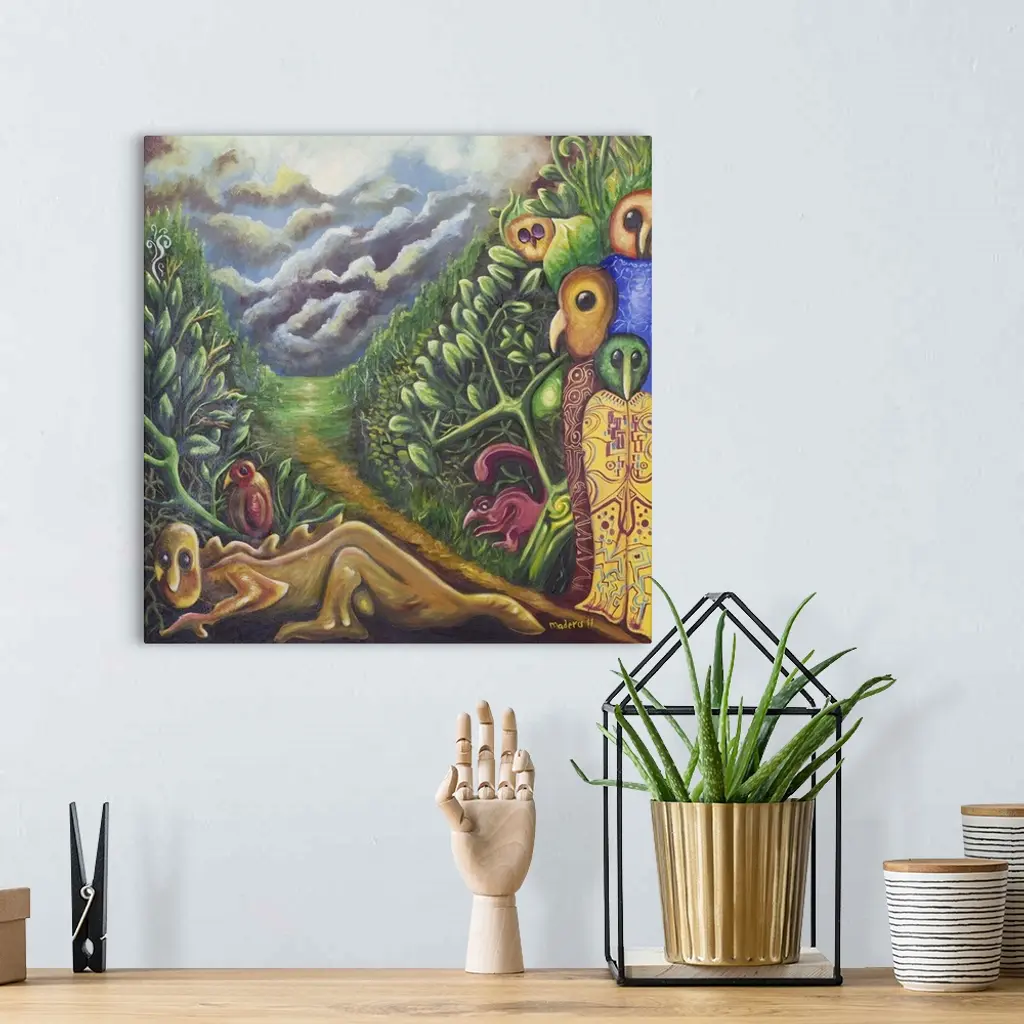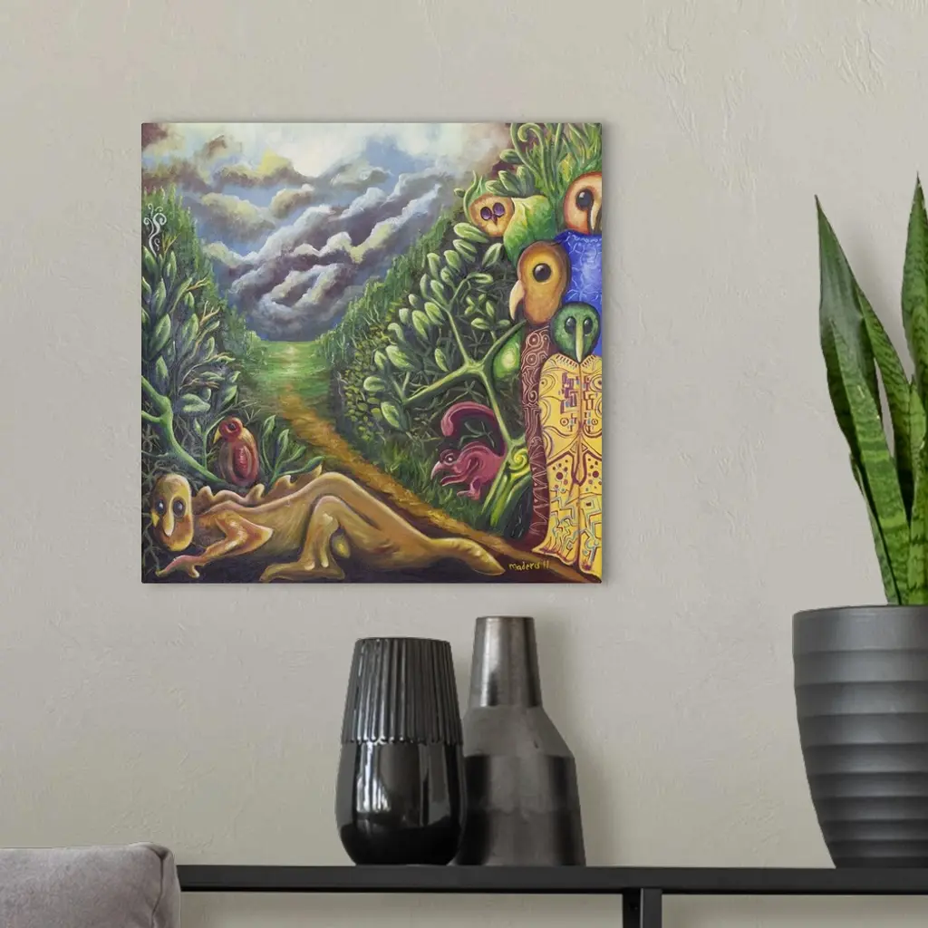 Mysterious creatures with the faces of birds emerge from amid jungle greenery. Dressed in colorful robes, they are nature's guardians. Their faces are not aggressive, as they reveal the nobleness of their work, says Mexican artist Madero. The truth is, I really wish there were large and powerful guardians who protected the natural world from the terrible hand of humans. The painting forms part of the series Secrets of the Jungle. Titled Guardianes de la jungla in Spanish.