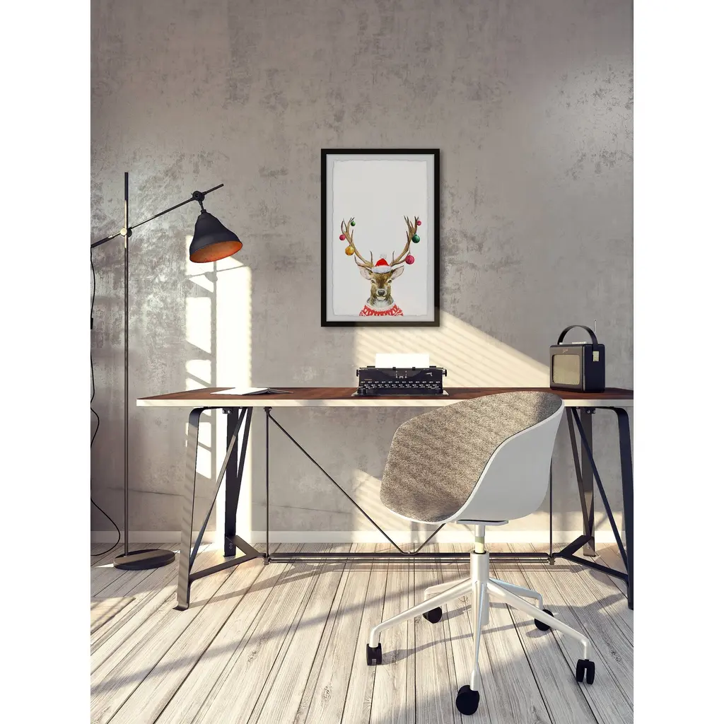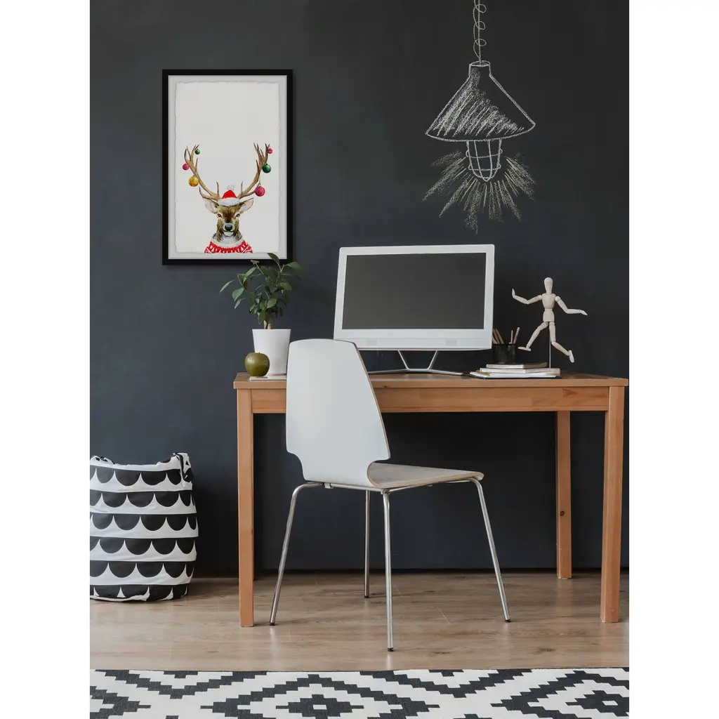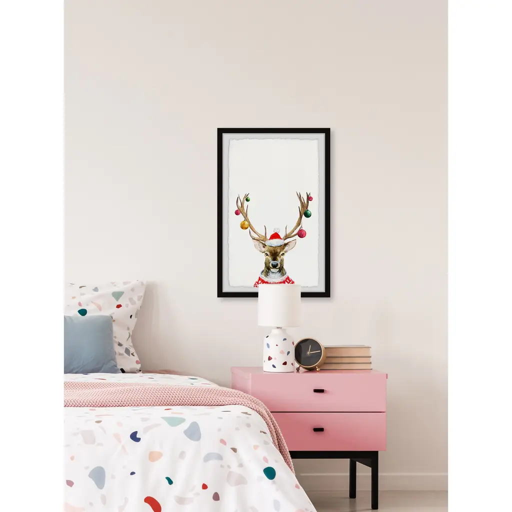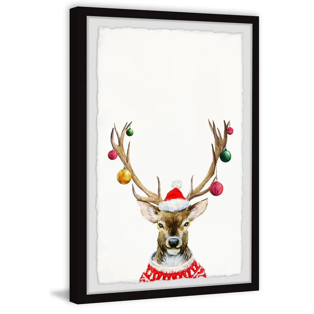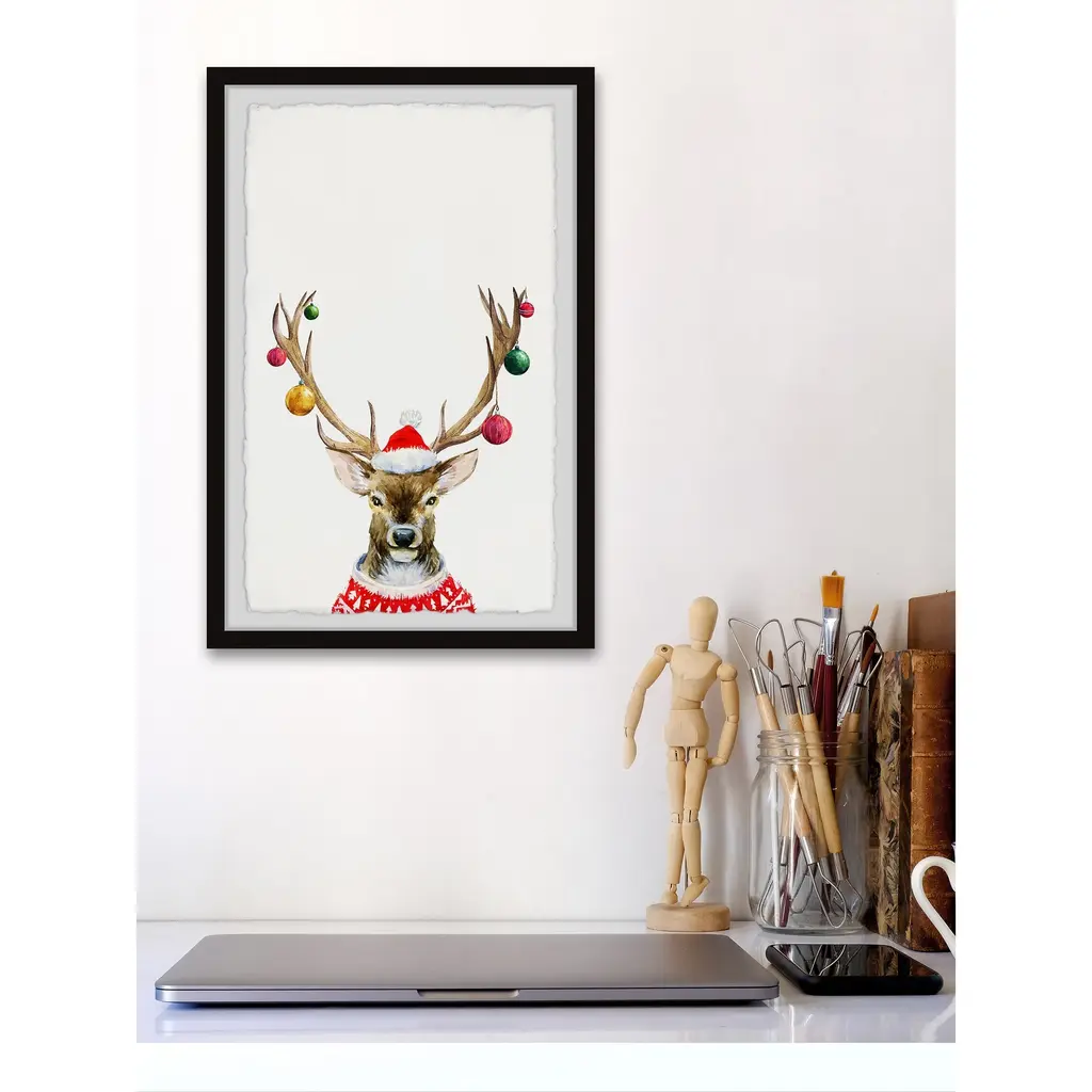 Get in the holiday mood with this watercolor painting print that features a deer with antlers that are decorated with Christmas ornaments and a fun Christmas outfit complete with a Christmas cap! Proudly printed in the USA, this piece is printed on high quality archive paper and professionally hand-framed. With wall-mounting hooks included, this artful accent is ready to hang up as soon as it reaches your front door. • Top quality Giclee print on high resolution Archive Paper • Hand cut deckled edges • High quality durable non-warping frame • Finished under shatter resistant plexiglass • Arrives ready to hang • Includes a certificate of authenticity • Printed in the USA