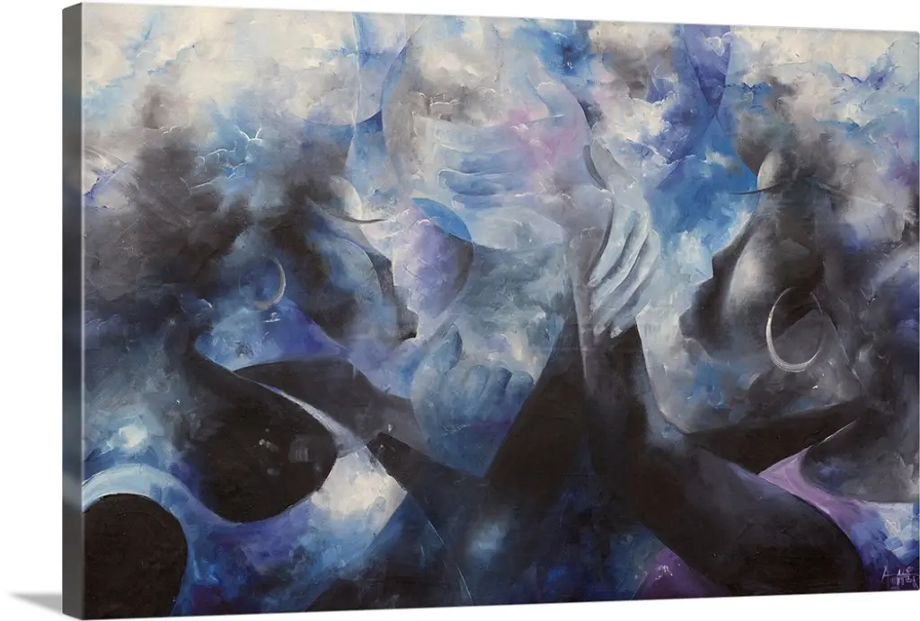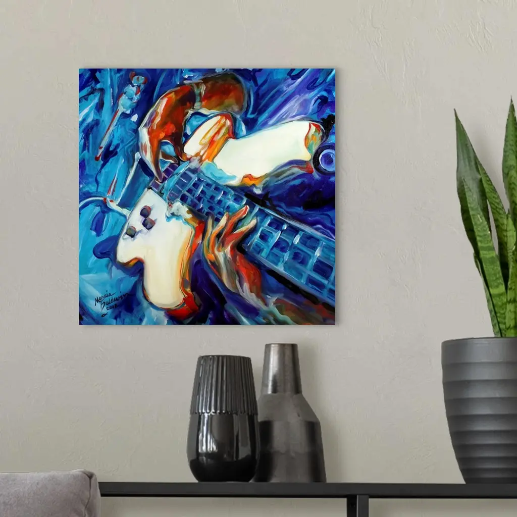 Abstract painting of a guitarist from a unique point of view made with blue, red, and orange hues on a square background.