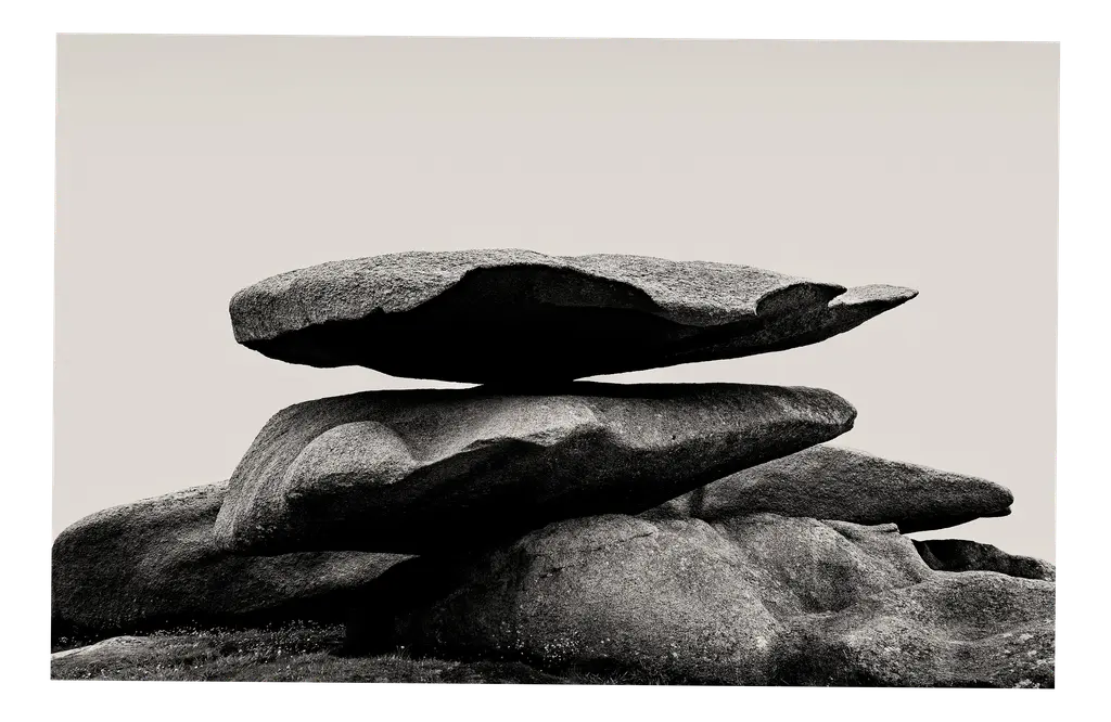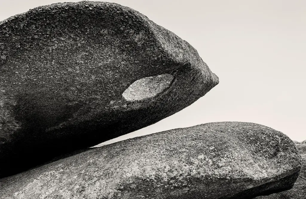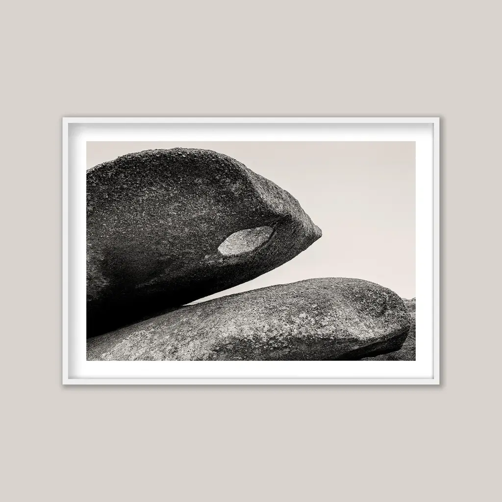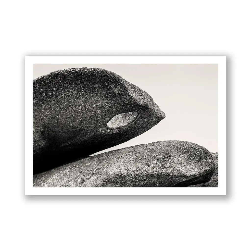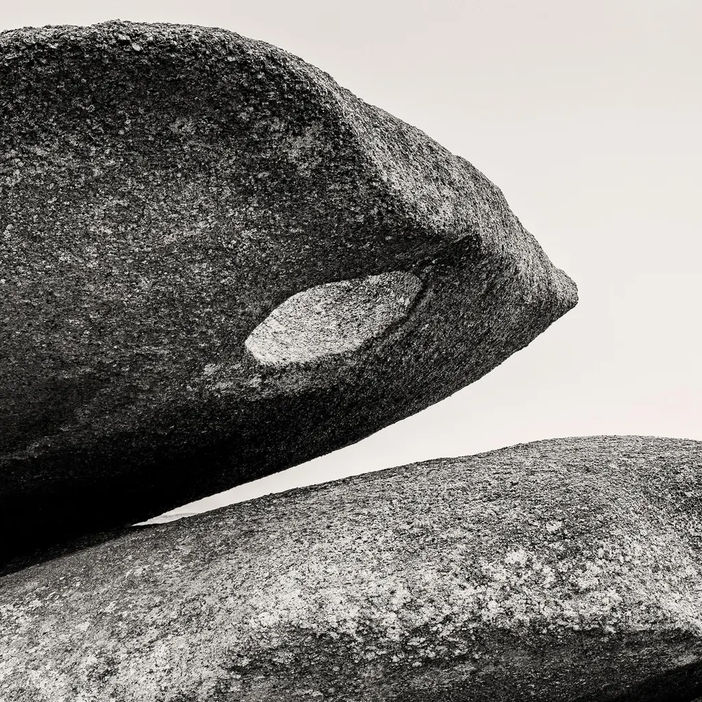 Abstract Balance IV. A sepia-toned black and white photograph capturing the otherworldly rock formations of the Côte de Granite Rose in Brittany, northwest France. This particular composition subtly echoes the harmony of the Yin & Yang symbol, reflecting the natural balance within the landscape. Stretching for miles, this remarkable coastline is scattered with pink-orange granite formations, sculpted by time into smooth, weathered boulders that appear to defy gravity - creating a scene both serene and surreal. Limited Edition Archival Inkjet Giclée Print on Matte Photo Rag Paper. 19 3/4" x 27 1/2" - 50cm x 70cm (Includes border). Limited Edition of 20 - Signed. Print only, no frame included. Signed by Maker