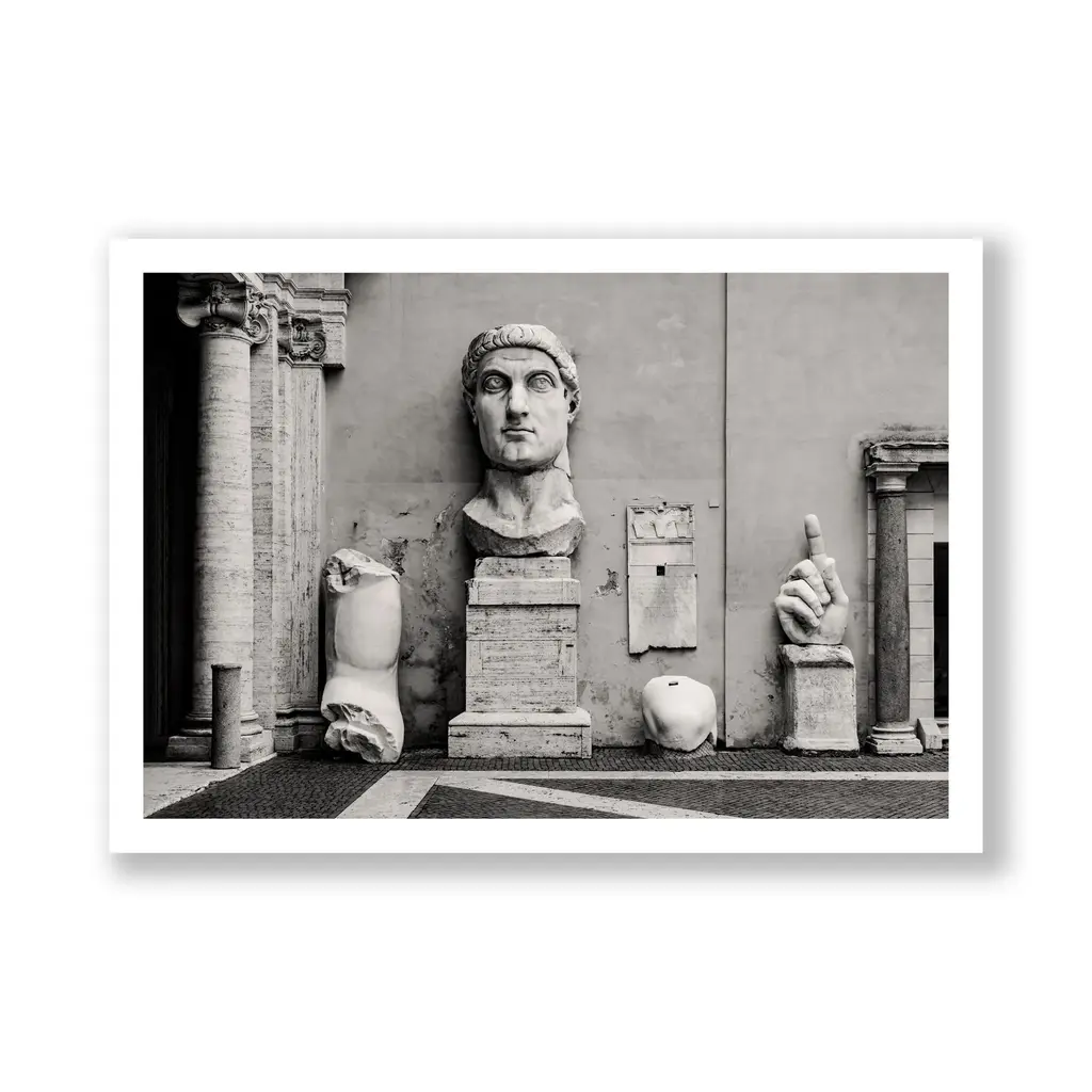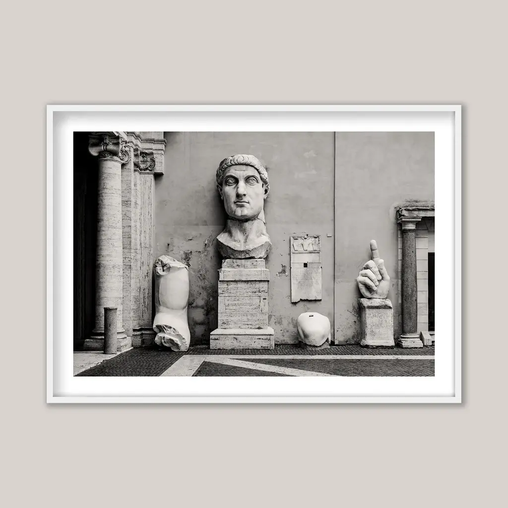 A black-and-white photograph of Constantine, the beautiful and monumental sculpted head of the Roman Emperor Constantine I, situated in the courtyard of the Capitoline Museum in Rome, Italy. Taken in 2023 as an update to a previous version, this image captures the open-air setting, where the sculpture endures the full effects of weather. The surrounding plastered wall is frequently repaired and freshly painted, a quiet reminder of the passage of time. Limited Edition Archival Inkjet Giclée Print on Matte Photo Rag Paper. 19" x 26 1/2" - 48cm x 67cm (Includes border). Limited Edition of 25 - Signed. Print only, no frame included. Signed by Maker