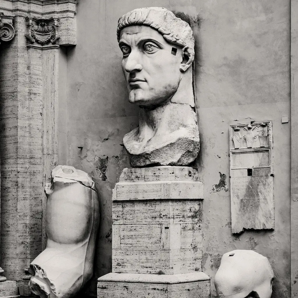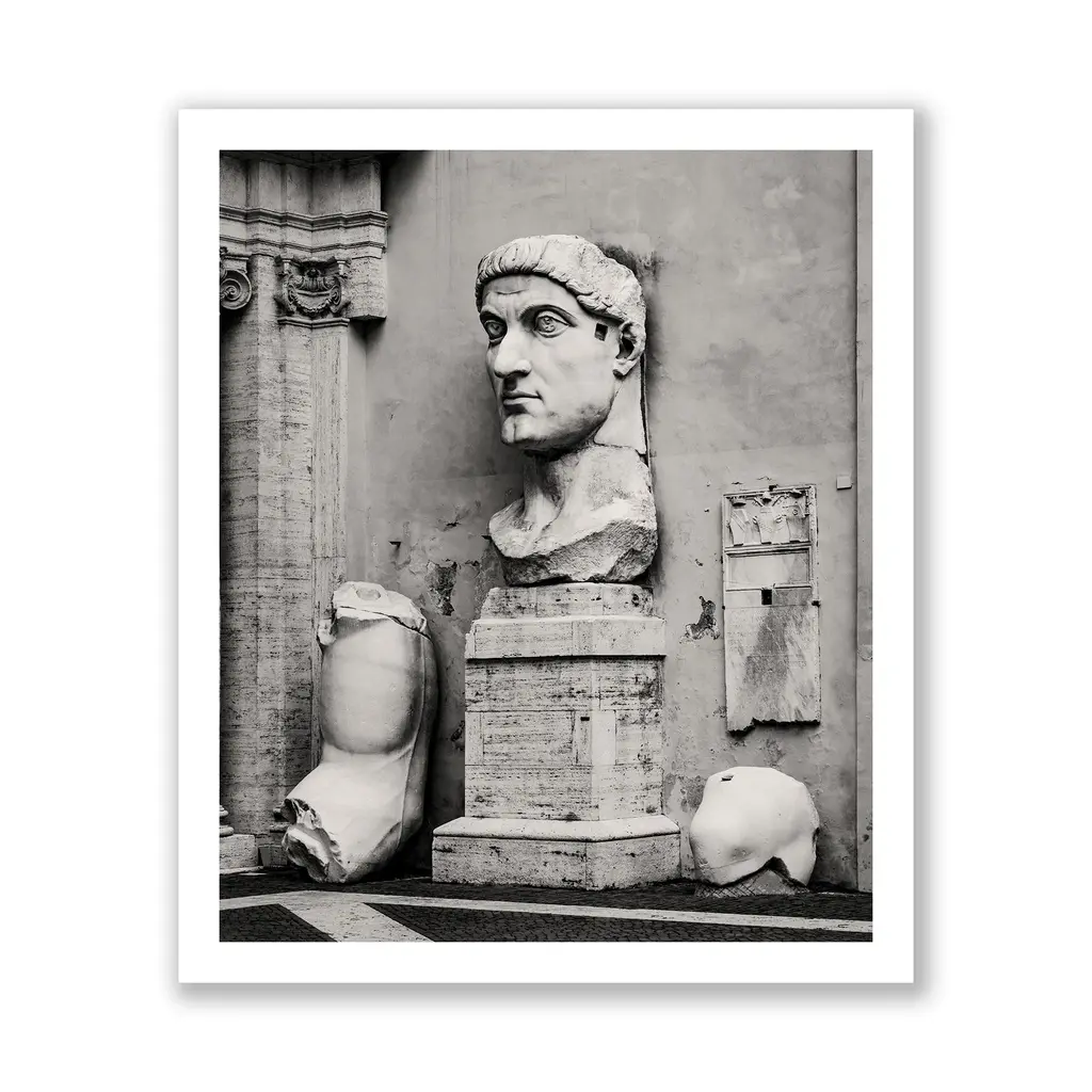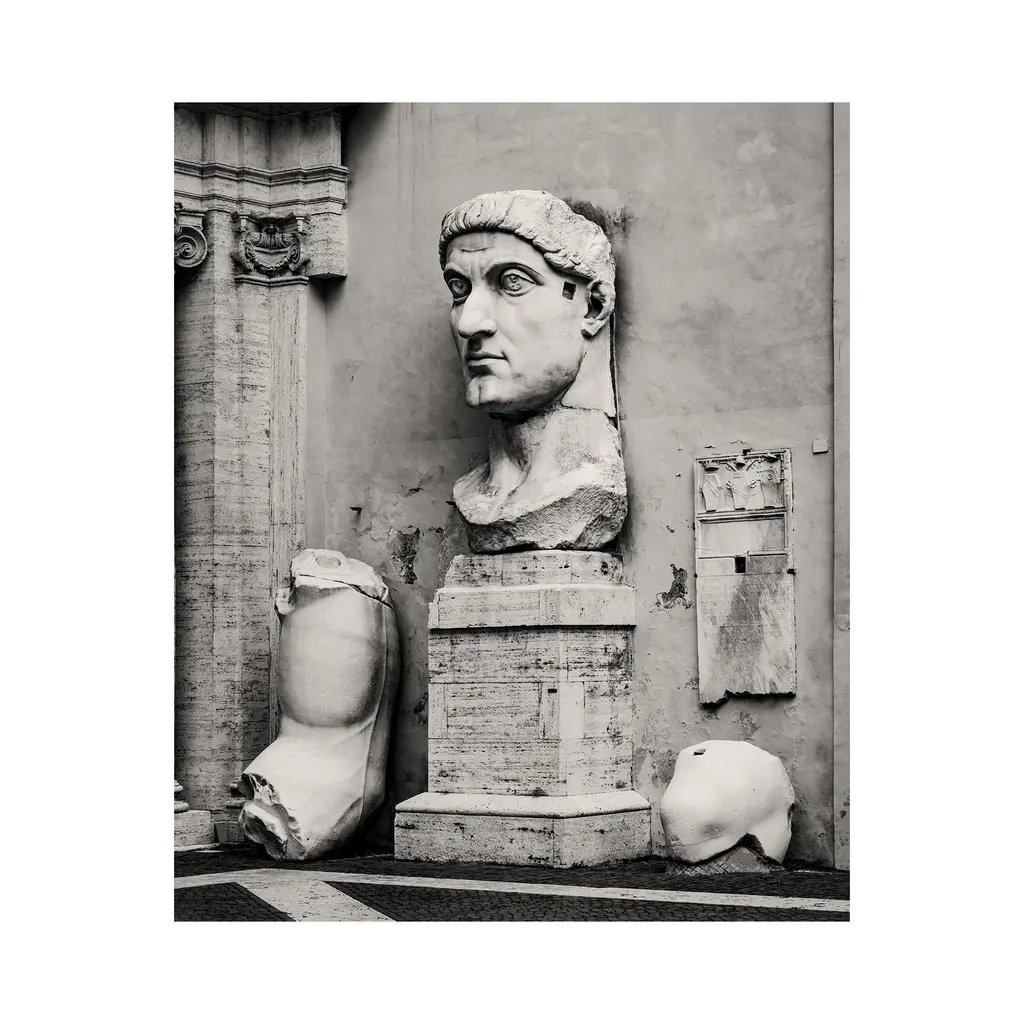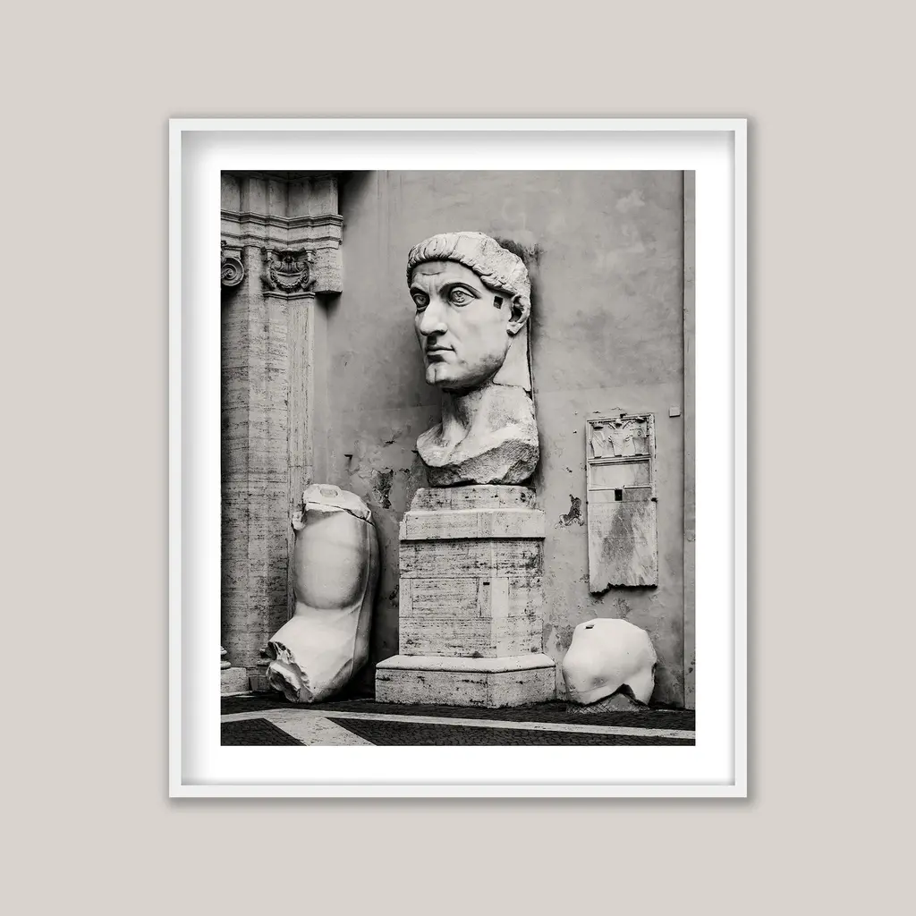 A sepia-toned black-and-white photograph of Constantine the Great, the beautiful and monumental sculpted head of the Roman Emperor Constantine I, shown in profile. It stands in the open-air courtyard of the Capitoline Museum in Rome, Italy. Limited Edition Archival Inkjet Giclée Print on Matte Photo Rag Paper. 18" x 21 1/2" - 46cm x 54.5cm (Includes border). Limited Edition of 20 - Signed. Print only, no frame included. Signed by Maker