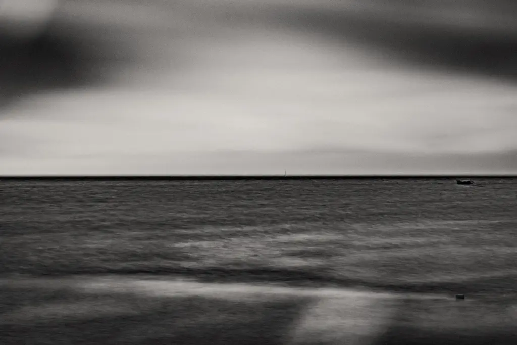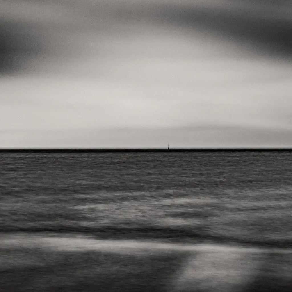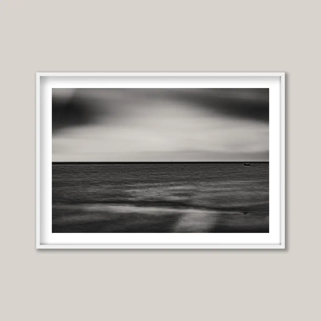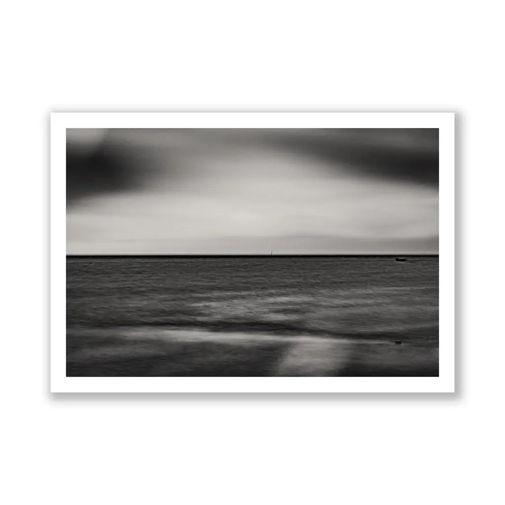 Ether II, a long-exposure photograph in black and white - English Channel, Summer 2025. A meditation on time and transformation, captured in a single long exposure, Ether reveals the subtle motion of clouds and sea — a quiet, continuous shift as the earth turns. This fleeting moment invites the viewer to pause, to witness time slowed, where sky and water become molten, transient forms. Limited Edition Archival Inkjet Giclée Print on Matte Photo Rag Paper. 19 3/4" x 27 1/2" - 48cm x 68cm (Includes border). Limited Edition of 25 - Signed. Print only, no frame included. Signed by Maker