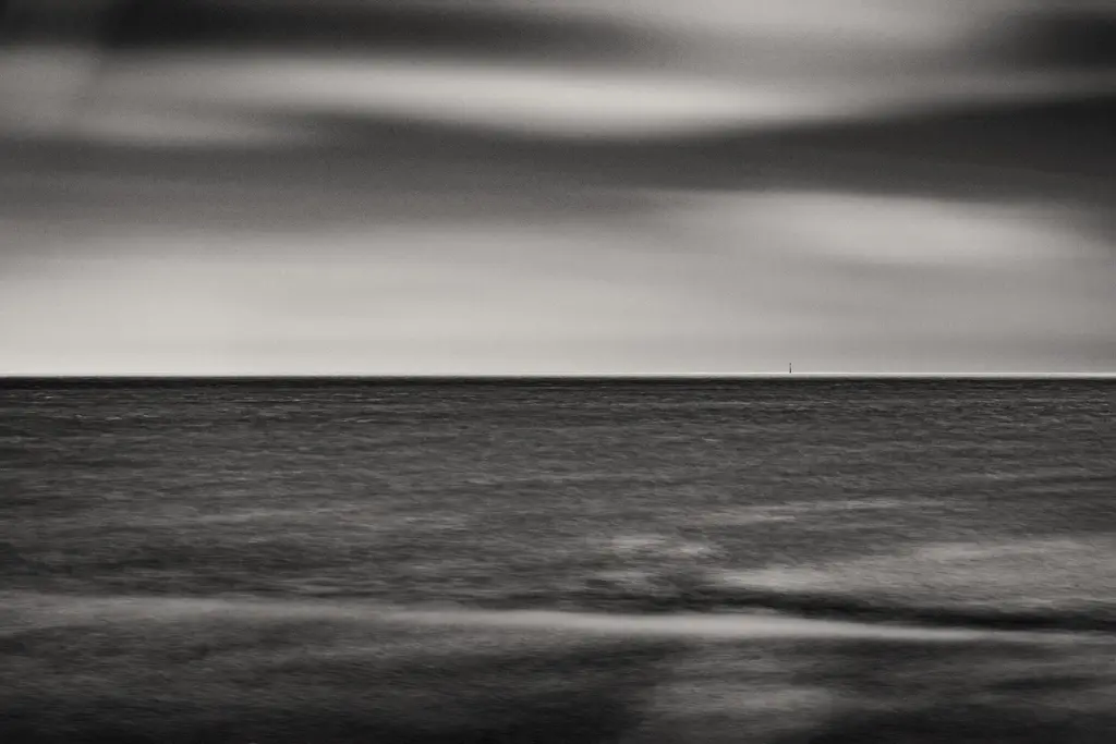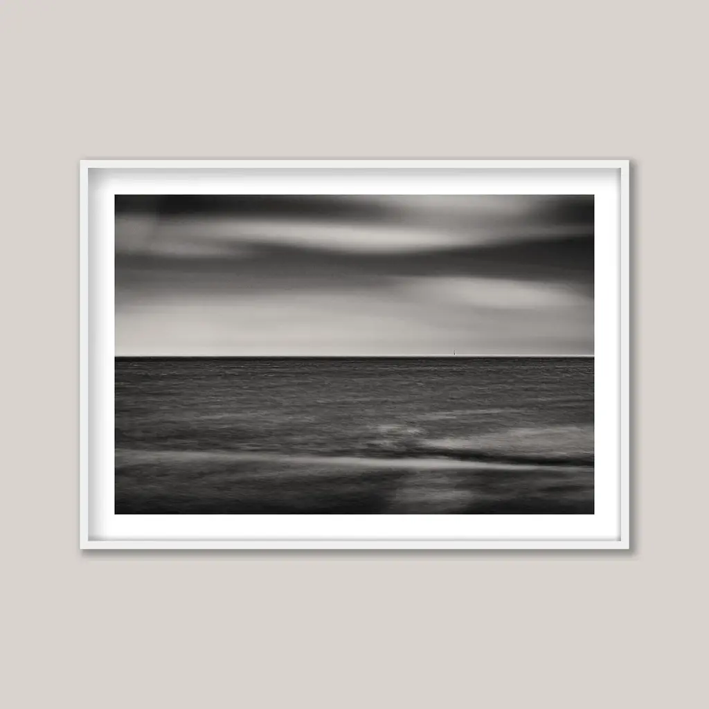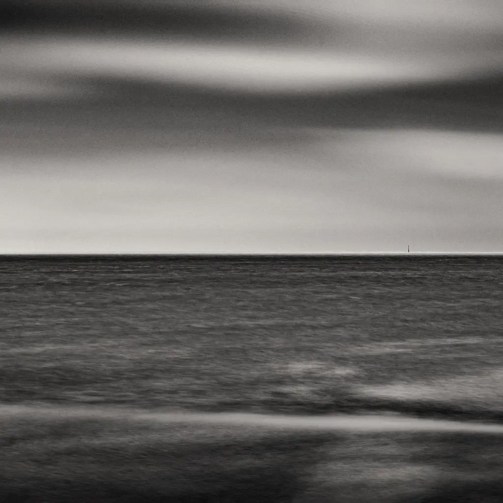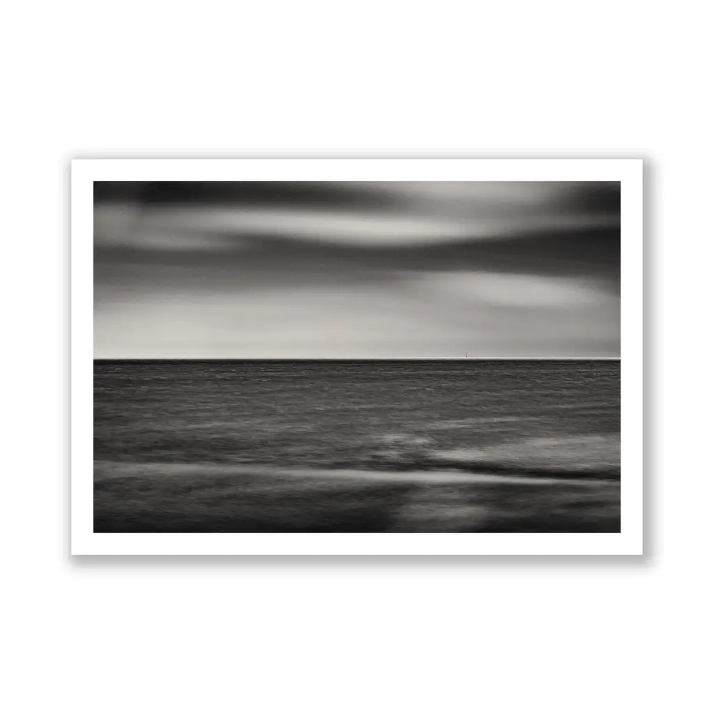 Ether, a long-exposure photograph in black and white - English Channel, Summer 2025. A meditation on time and transformation, captured in a single long exposure, Ether reveals the subtle motion of clouds and sea — a quiet, continuous shift as the earth turns. This fleeting moment invites the viewer to pause, to witness time slowed, where sky and water become molten, transient forms. Limited Edition Archival Inkjet Giclée Print on Matte Photo Rag Paper. 19 3/4" x 27 1/2" - 48cm x 68cm (Includes border). Limited Edition of 25 - Signed. Print only, no frame included. Signed by Maker