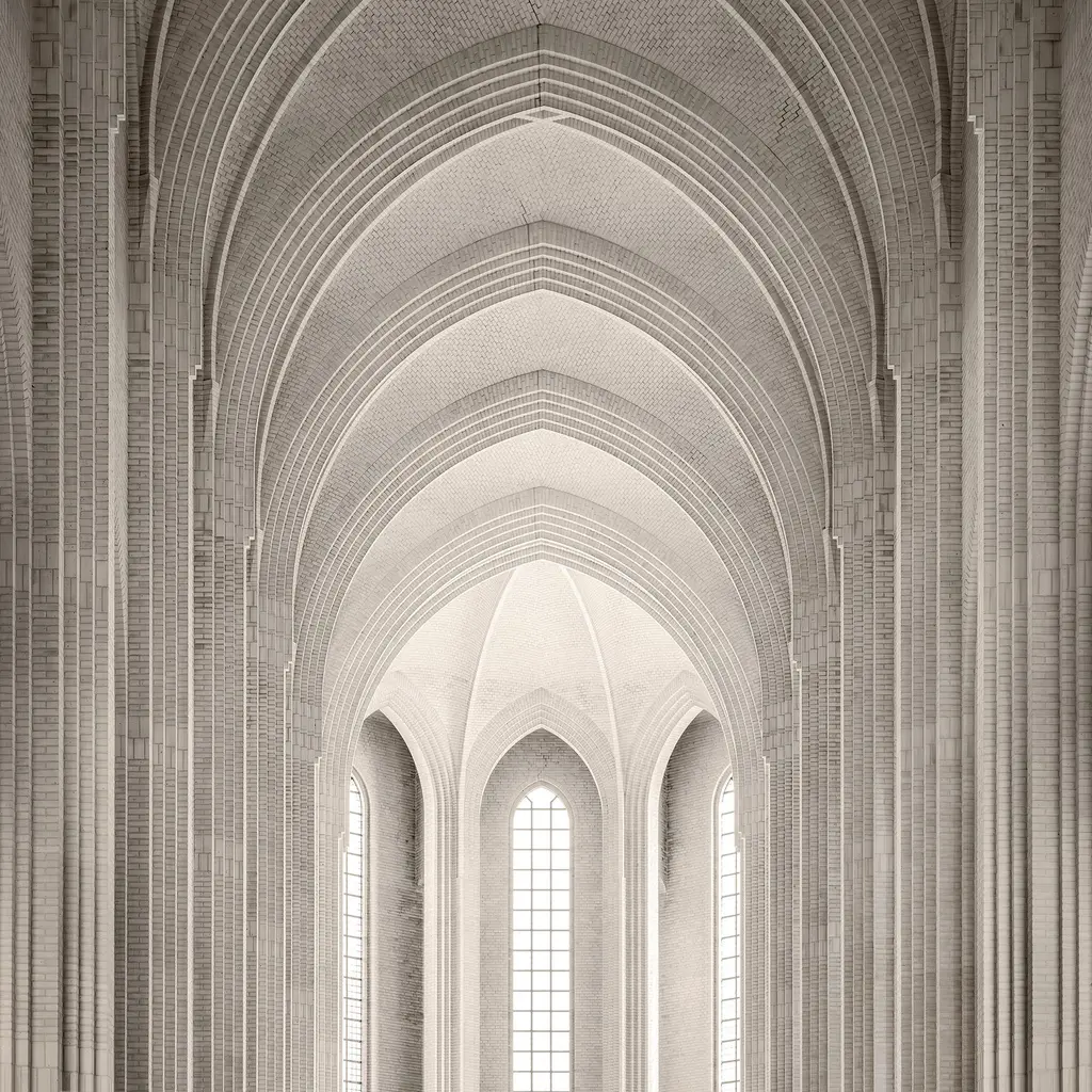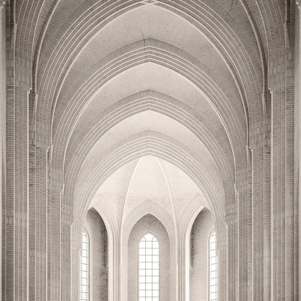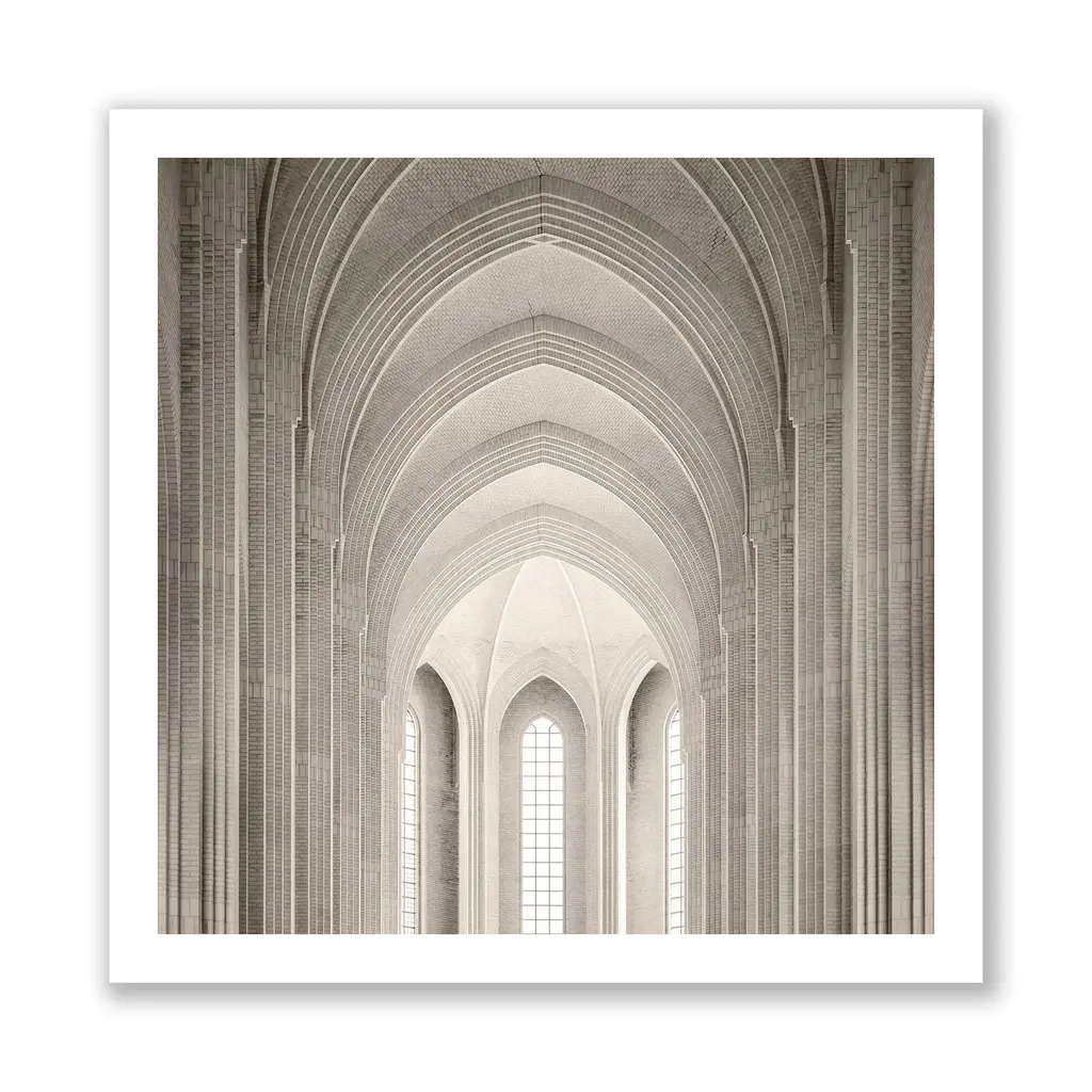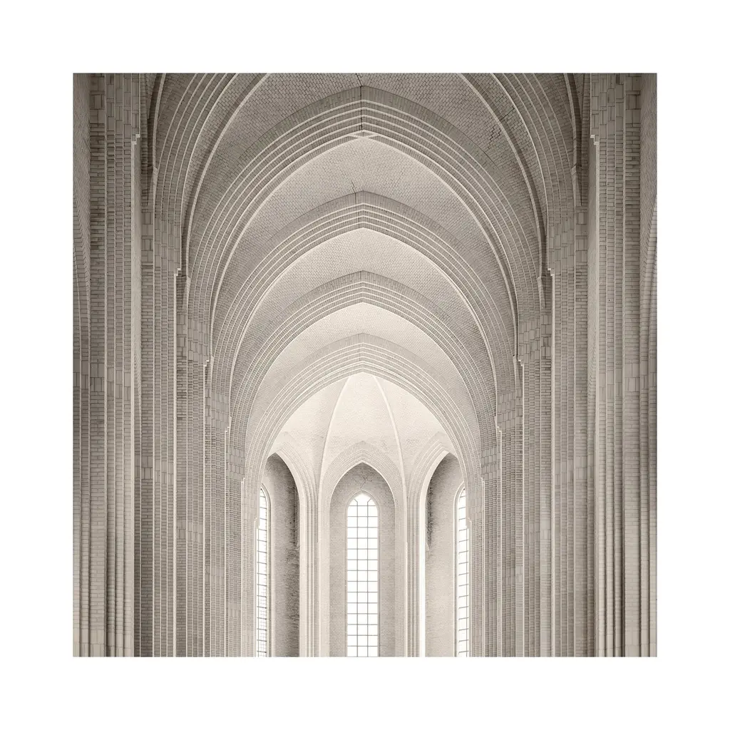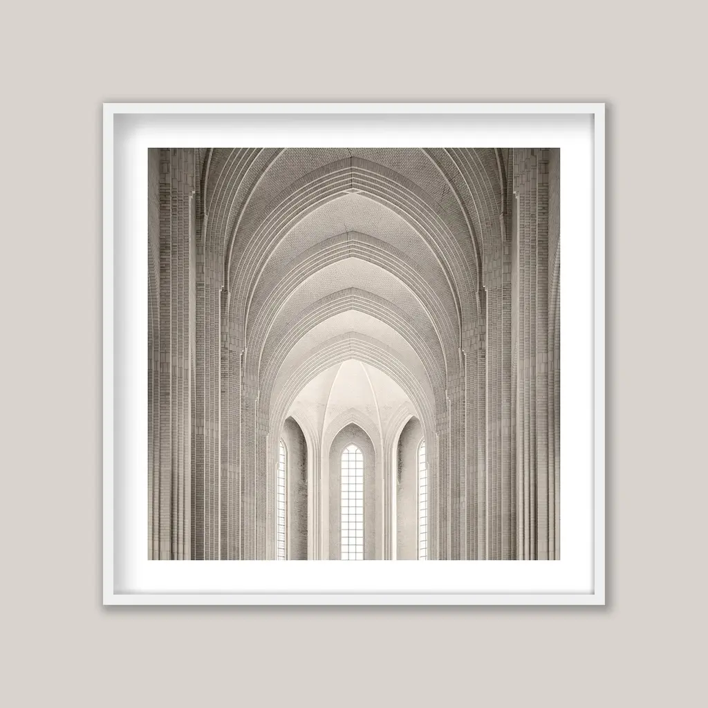 A square format, monotone photograph of Grundtvig’s Church in Copenhagen’s Bispebjerg district. Built from five million pale yellow bricks, it blends Gothic grandeur with Nordic simplicity. Designed by architect Peder Vilhelm Jensen-Klint it has a striking visual elegance and restraint both inside and out. It was completed in 1940. Inside, the space is austere but luminous - soaring vaults, endless verticals, and soft light create a sense of calm reverence. There is no ornament, only pure form and silence, where light becomes the decoration and space itself feels sacred. Limited Edition Archival Inkjet Giclée Print on Matte Photo Rag Paper. 19" x 19" - 48cm x 48cm (Includes border). Limited Edition of 25 - Signed. Print only, no frame included. Signed by Maker