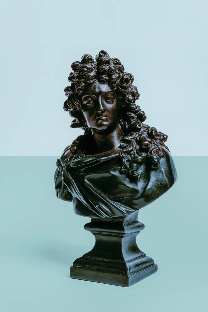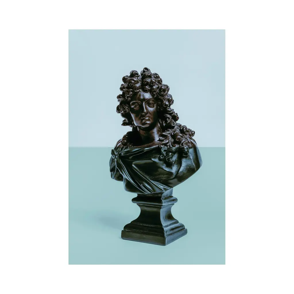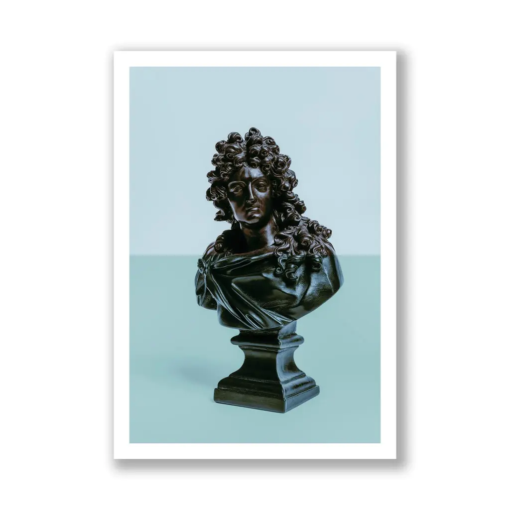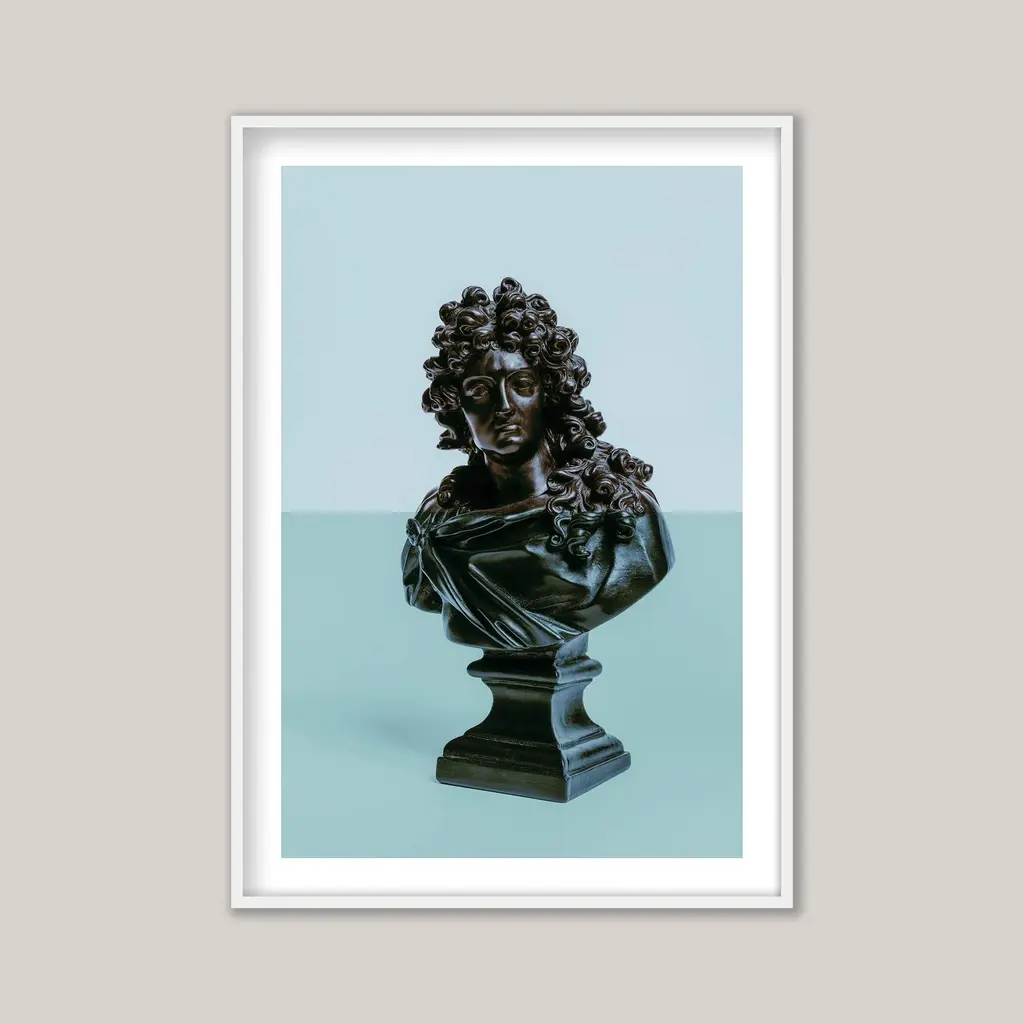 A colour-blocked photograph of a wax bust of King Louis XIV of France. A stark, monotone study of an ornate figure, captured in the style of minimalist product imagery. The composition leans towards silhouette, emphasising form and contrast with a refined, graphic approach. Limited Edition Archival Inkjet Giclée Print on Matte Photo Rag Paper. 19" x 26 3/4" - 48cm x 68cm (Includes border). Limited Edition of 25 - Signed. Print only, no frame included. Signed by Maker