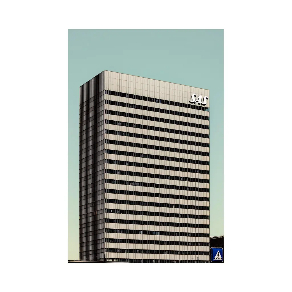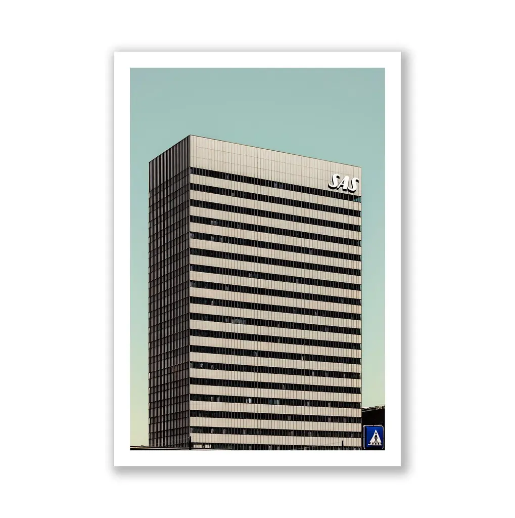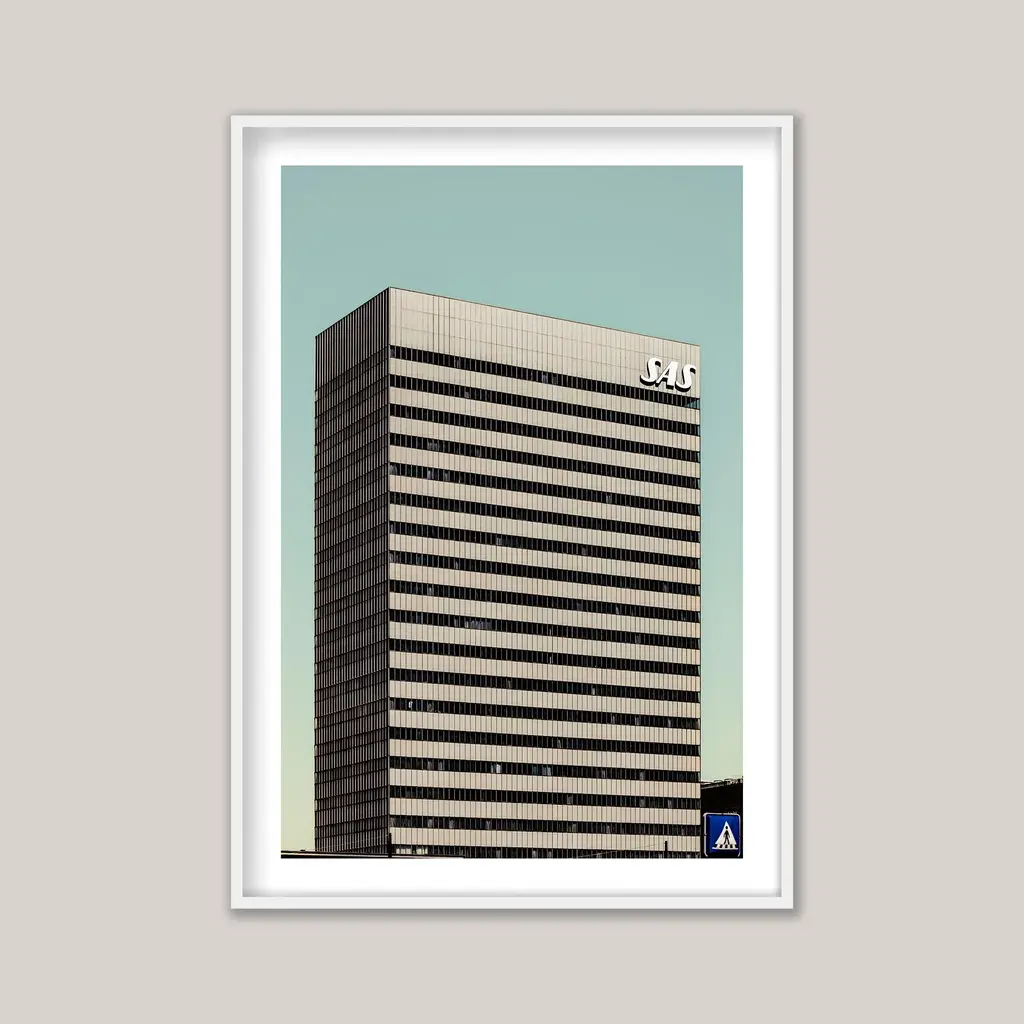 The SAS Royal Hotel in Copenhagen - commissioned by Scandinavian Airlines System - is a truly iconic piece of architecture by renowned Danish architect and designer Arne Jacobsen. Opened in 1960, it was conceived as a multi-purpose facility: both a luxury hotel and an airline terminal, a concept that may seem unusual given that the airport lies over 8 km (5 miles) to the south. A dedicated shuttle bus once connected guests directly to the airport. Jacobsen not only designed the building’s striking modernist form - Copenhagen’s first skyscraper - but also crafted its interiors and furnishings, including now-iconic pieces like the Egg and Swan chairs. Today, this landmark lives on as the Radisson Collection Royal Hotel, a testament to mid-century Scandinavian design at its most ambitious and holistic. Limited Edition Archival Inkjet Giclée Print on Matte Photo Rag Paper. 19 3/4" x 27 1/2" - 48cm x 68cm (Includes border). Limited Edition of 25 - Signed. Print only, no frame included. Signed by Maker
