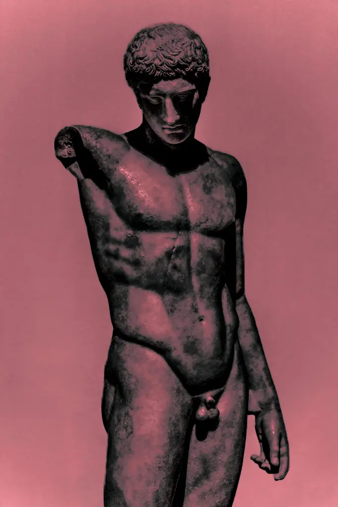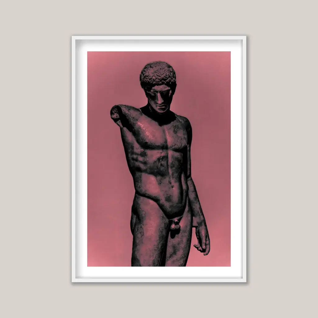 The Dark Roman. Another in the Museum Series, a crimson toned black and white photograph of a Roman Sculpture, actually a Roman copy of an original Greek Bronze Sculpture dating from 430 BC. Very softly rendered with indigo blue shadows and sepia hues. Limited Edition Archival Inkjet Giclée Print on Matte Photo Rag Paper. 19" x 26 3/4" - 48cm x 68cm (Includes border). Limited Edition of 20 - Signed. Print only, no frame included. Signed by Maker