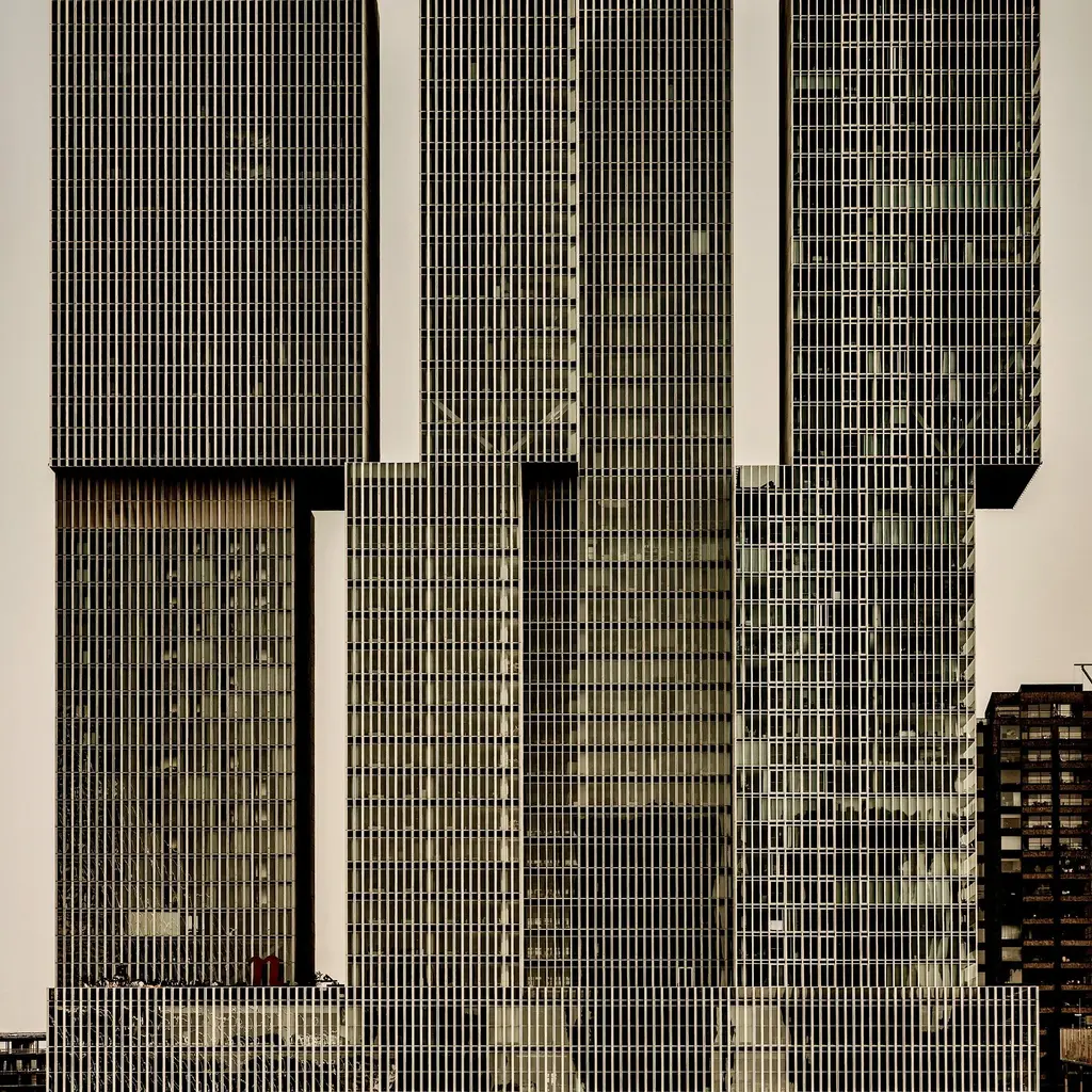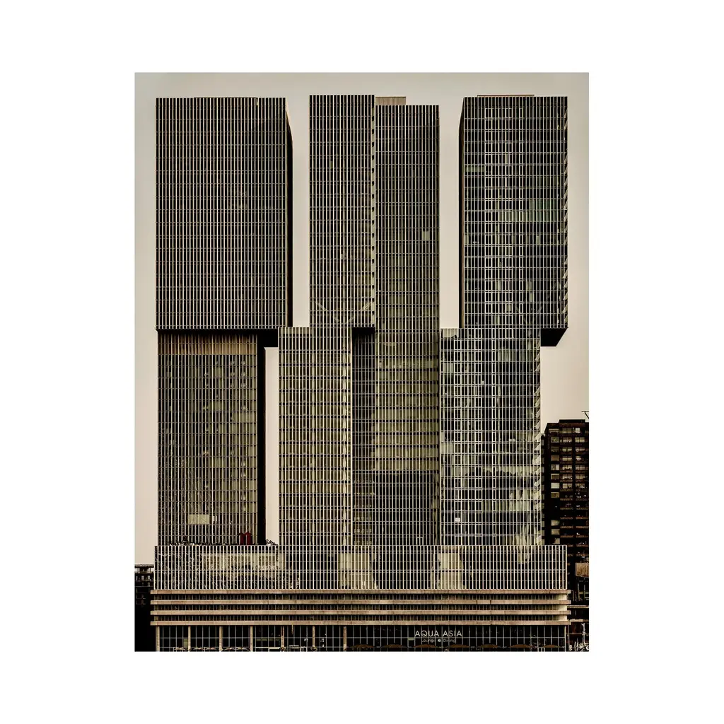 De Rotterdam. An architectural photograph of De Rotterdam, a monumental mixed-use complex on the banks of the Maas in the Netherlands. Designed by OMA Architects, this vast structure is at once abstract and minimal—yet incredibly complex. with its improbable juxtapositions of stacked volumes and interlocking functions—residential, office, hotel, and more—it offers a visually stunning study in scale and density. Encompassing 160,000 m² of floor space, it is the largest building in the Netherlands. Limited Edition Archival Inkjet Giclée Print on Matte Photo Rag Paper. 18" x 22 1/2" - 46cm x 57cm (Includes border). Limited Edition of 25 - Signed. Print only, no frame included. Signed by Maker