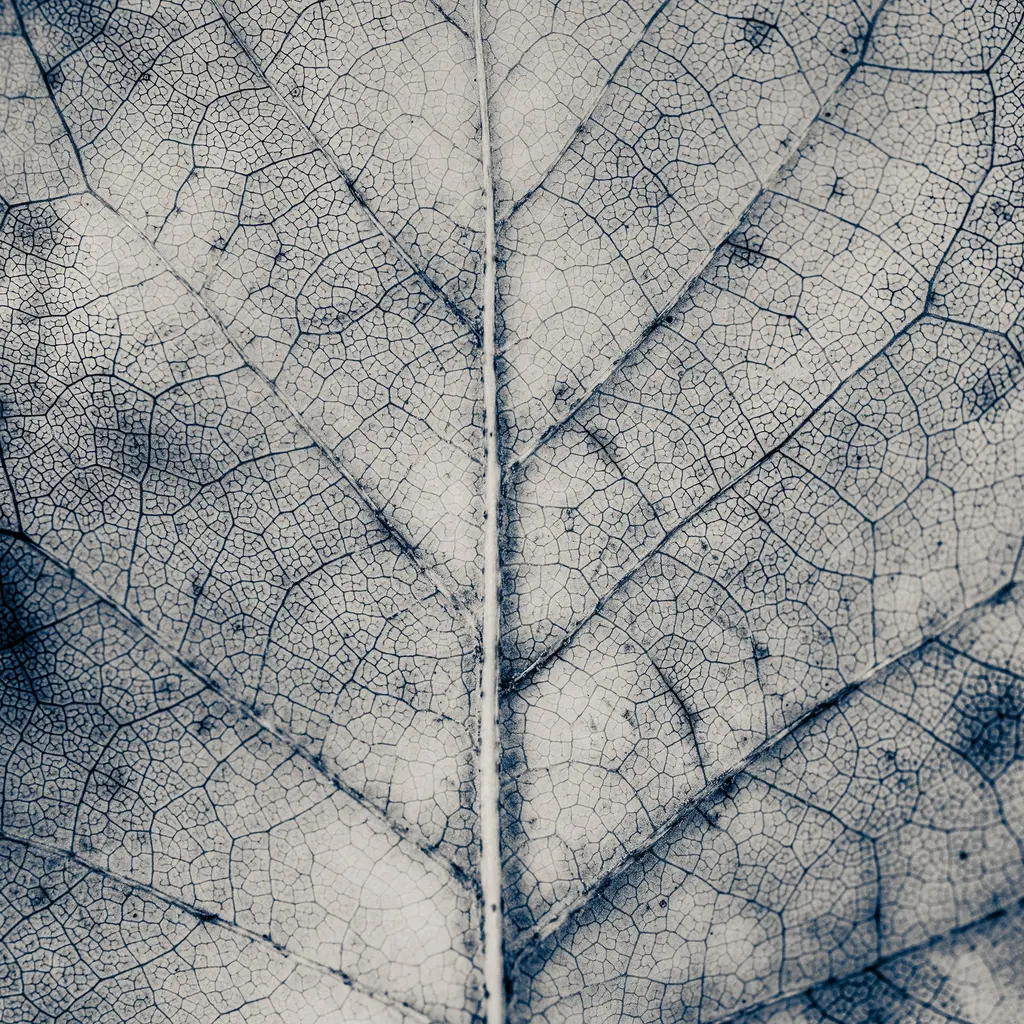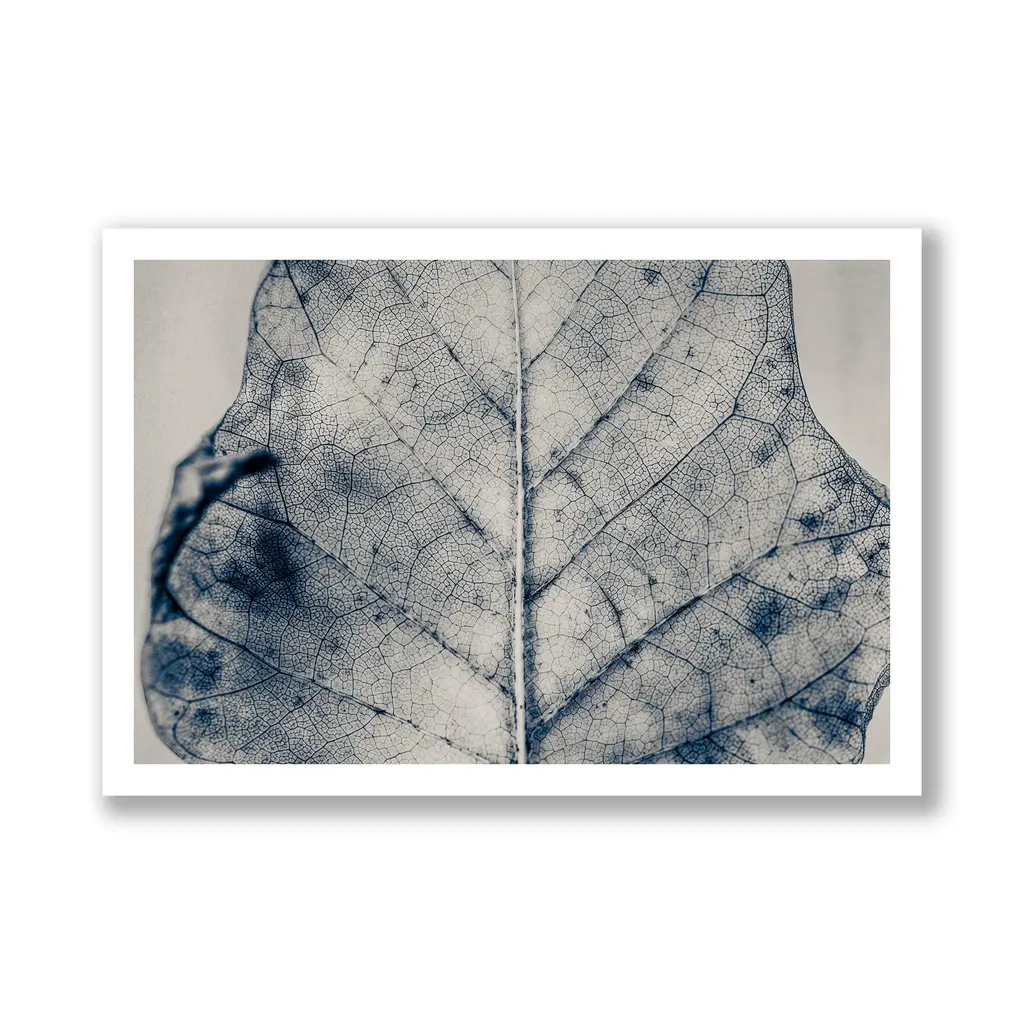 A close-up, monotone study—blue and sepia-toned—of a fallen leaf, revealing its stunning, intricate network of capillaries. Limited Edition Archival Inkjet Giclée Print on Matte Photo Rag Paper. 19 3/4" x 27 1/2" - 48cm x 680cm (Includes border). Limited Edition of 20 - Signed. Print only, no frame included. Signed by Maker