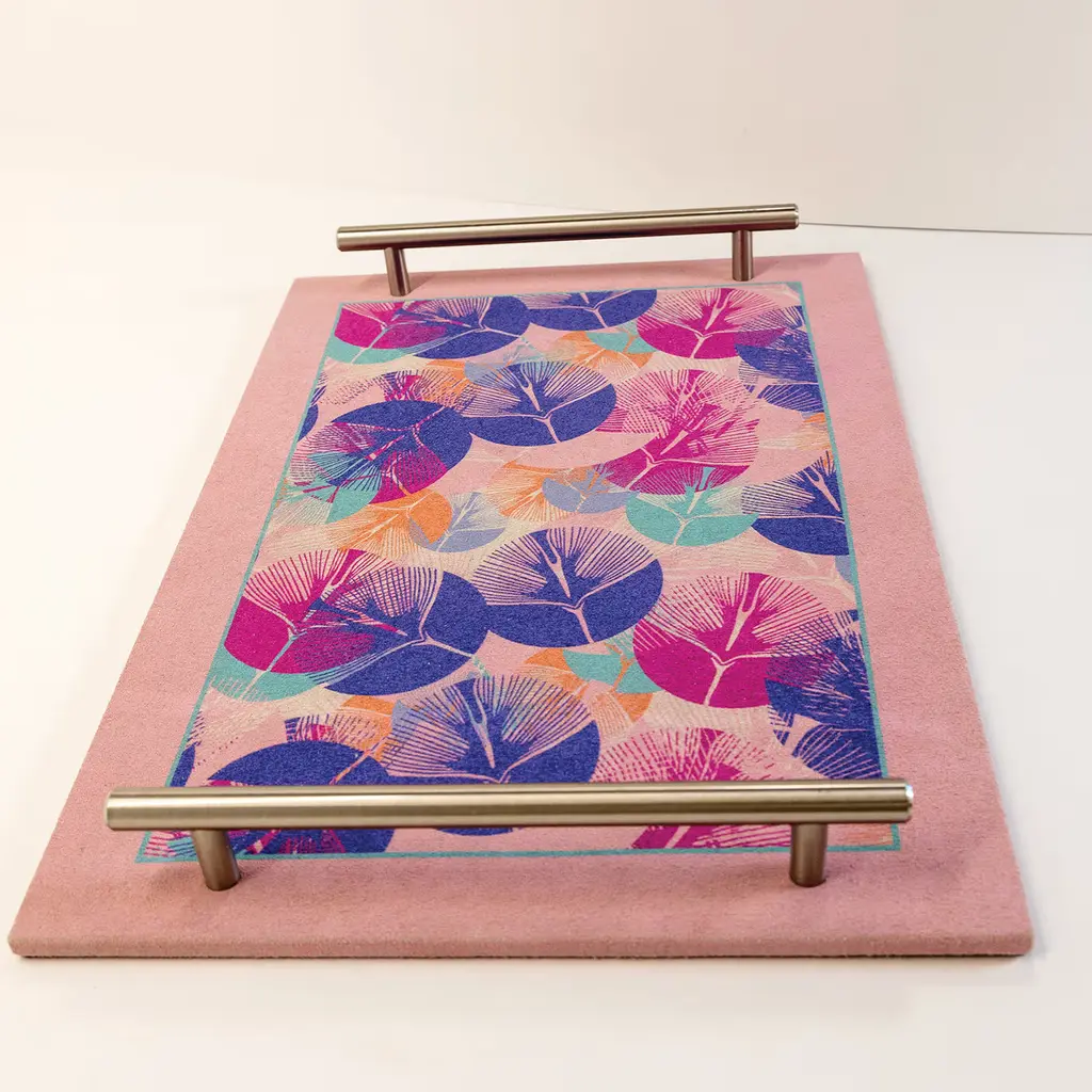This stunning rectangular tray, entirely handmade and covered in fine printed leather and complete with two side handles, is a perfect blend of elegance and practicality. The tray gives off an almost oriental vibe with a printed floral motif that is sure to catch the eye in any of the variety of colours it is available in.