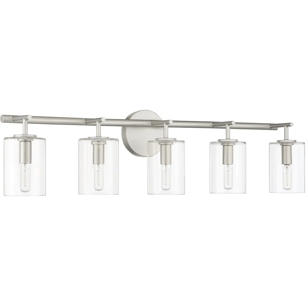 The elevated clear glass cylinder globes and slender arms enhance the simplistic beauty of the Hailie interior lighting collection by Craftmade. The Hailie collection includes a full array of chandeliers, semi and flushmounts, pendant and several sizes of vanity bath bars.
