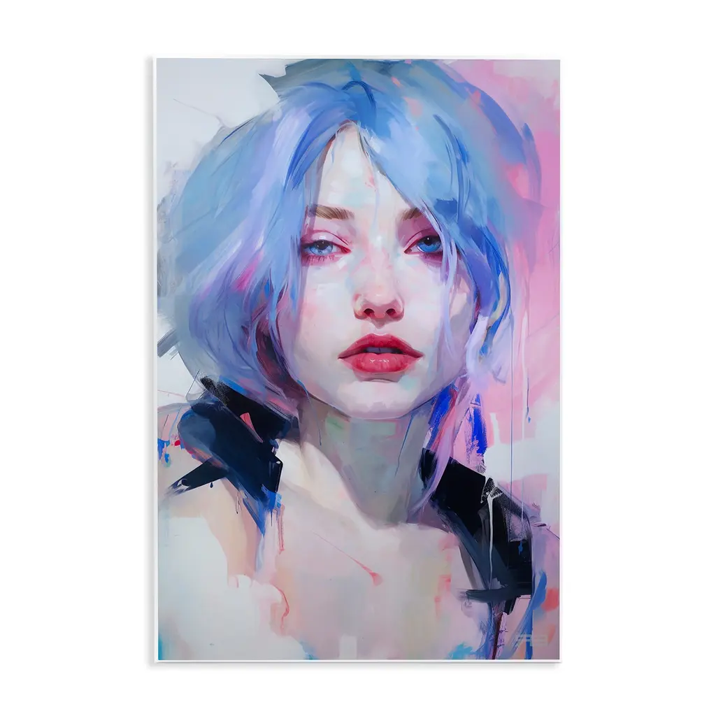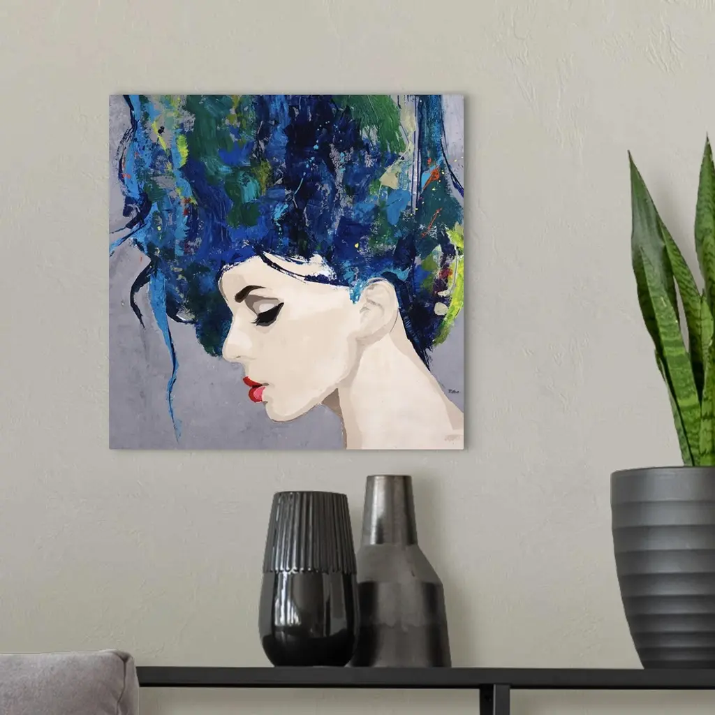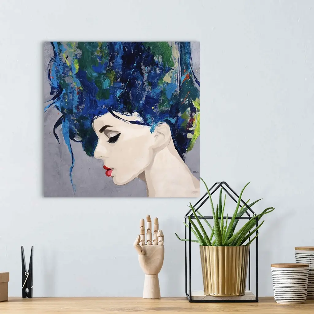 Square painting of a woman with playful hair flowing towards the top of the canvas in shades of blue and green with bright small pops of orange.