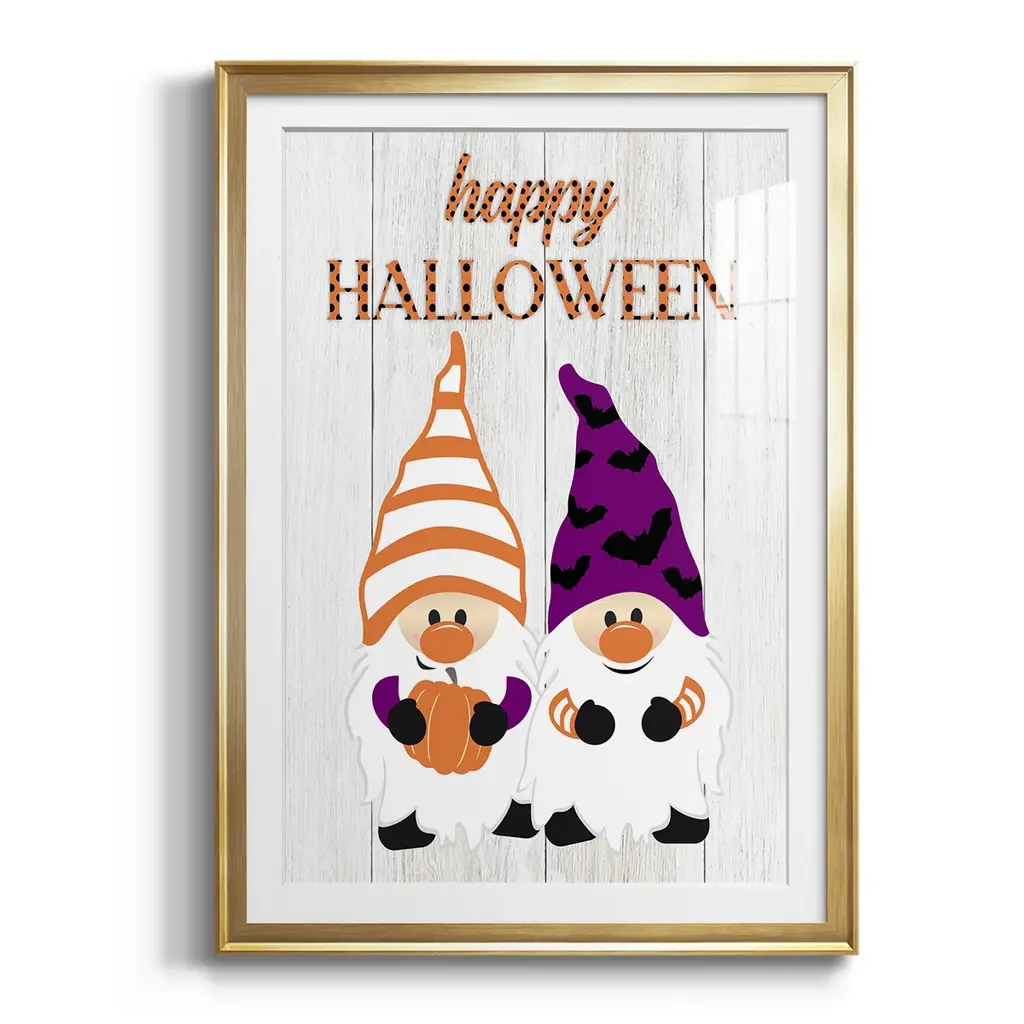 Halloween Gnomes Premium Framed Print - Ready to Hang A Premium Framed Print created to last. Framed in distressed wood and available in an array of sizes and colors Featuring a beveled a solid wood stretcher bar, each piece comes ready to hand 4 SIZES AVAILABLE 30.5''X42.5'' - Overall Size 26.5'X36.5'' - Overall Size 22.5''x30.5'' - Overall Size 18.5''x24.5'' - Overall Size Each piece is made to order. Each piece comes with hanging hardware. Made in the USA Ready to Hang Giclee Paper Print Acrylic Glass Beveled Matt Board