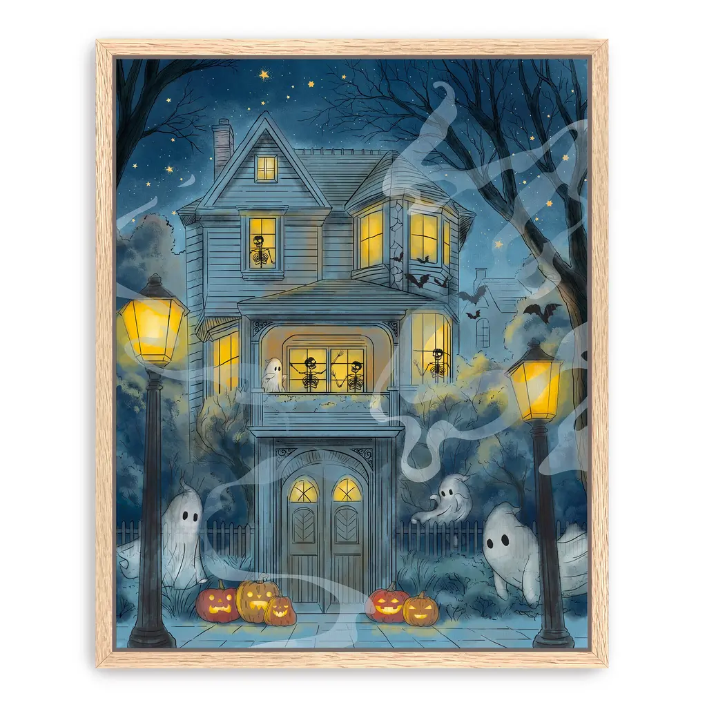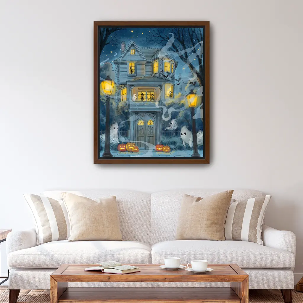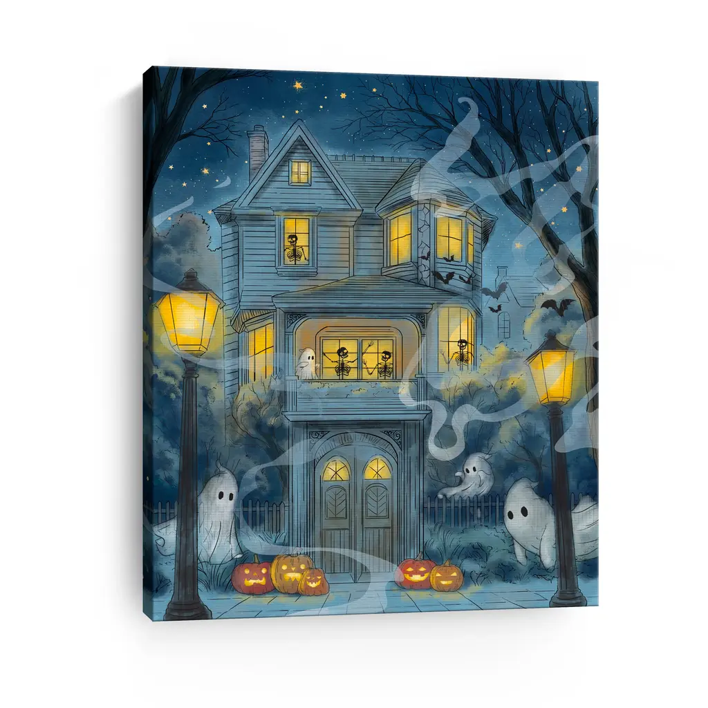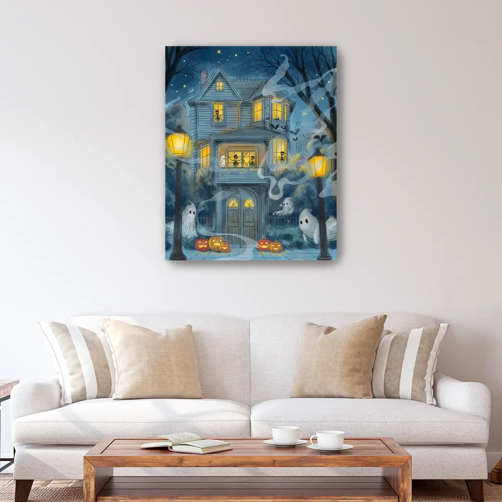 This eerie haunted house canvas captures the spirit of Halloween with shadowy silhouettes and glowing orange windows. Rich hues of midnight blue, charcoal, and pumpkin spice create a chilling yet captivating focal point for your seasonal decor. Our Gallery Wrap Canvas Prints are proudly assembled with high quality materials in California, USA. Each piece is printed on a thick, archival grade canvas using Giclee technology. It is then hand-stretched by our experienced artisans over solid wood bars, which will not warp over time. The final product is a piece personally crafted for you to confidently display on your wall. Care and Assembly: Ensure that the location of your piece has little to no exposure to heat, sunlight, and moisture. Wipe clean, only if needed. Each piece includes hanging hardware to hang on your wall vertically.