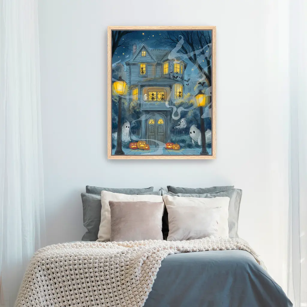 This eerie haunted house canvas captures the spirit of Halloween with shadowy silhouettes and glowing orange windows. Rich hues of midnight blue, charcoal, and pumpkin spice create a chilling yet captivating focal point for your seasonal decor. Our Gallery Wrap Canvas Prints are proudly assembled with high quality materials in California, USA. Each piece is printed on a thick, archival grade canvas using Giclee technology. It is then hand-stretched by our experienced artisans over solid wood bars, which will not warp over time. The final product is a piece personally crafted for you to confidently display on your wall. Care and Assembly: Ensure that the location of your piece has little to no exposure to heat, sunlight, and moisture. Wipe clean, only if needed. Each piece includes hanging hardware to hang on your wall vertically.