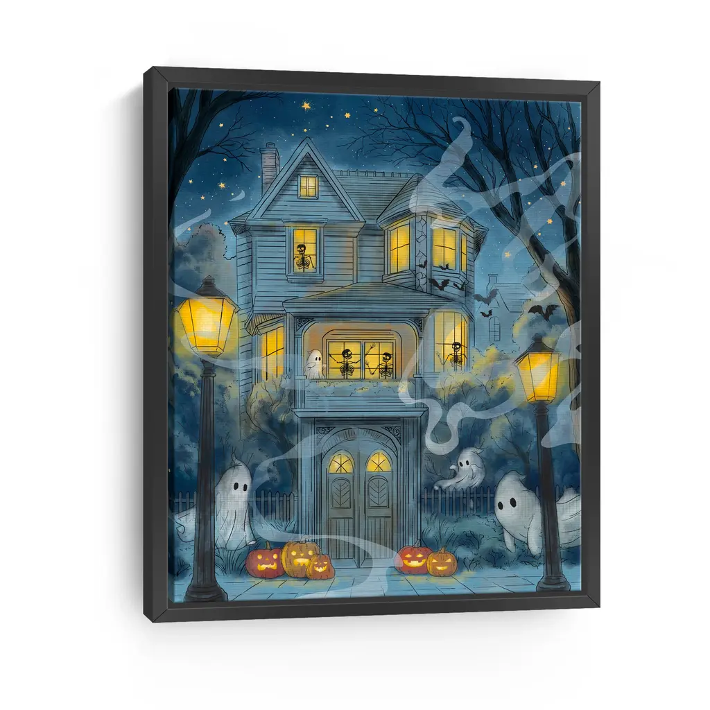 This eerie haunted house canvas captures the spirit of Halloween with shadowy silhouettes and glowing orange windows. Rich hues of midnight blue, charcoal, and pumpkin spice create a chilling yet captivating focal point for your seasonal decor. Our Gallery Wrap Canvas Prints are proudly assembled with high quality materials in California, USA. Each piece is printed on a thick, archival grade canvas using Giclee technology. It is then hand-stretched by our experienced artisans over solid wood bars, which will not warp over time. The final product is a piece personally crafted for you to confidently display on your wall. Care and Assembly: Ensure that the location of your piece has little to no exposure to heat, sunlight, and moisture. Wipe clean, only if needed. Each piece includes hanging hardware to hang on your wall vertically.