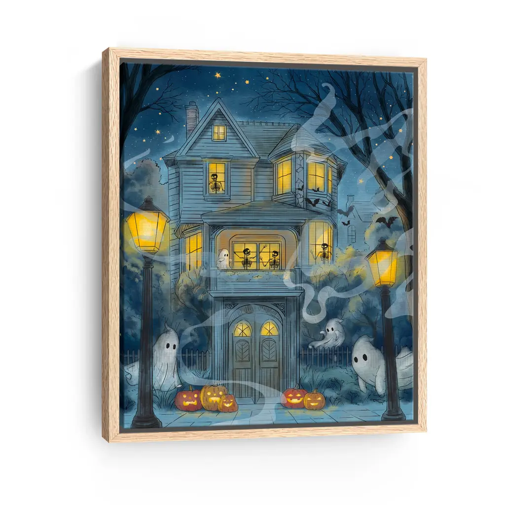This eerie haunted house canvas captures the spirit of Halloween with shadowy silhouettes and glowing orange windows. Rich hues of midnight blue, charcoal, and pumpkin spice create a chilling yet captivating focal point for your seasonal decor. Our Gallery Wrap Canvas Prints are proudly assembled with high quality materials in California, USA. Each piece is printed on a thick, archival grade canvas using Giclee technology. It is then hand-stretched by our experienced artisans over solid wood bars, which will not warp over time. The final product is a piece personally crafted for you to confidently display on your wall. Care and Assembly: Ensure that the location of your piece has little to no exposure to heat, sunlight, and moisture. Wipe clean, only if needed. Each piece includes hanging hardware to hang on your wall vertically.