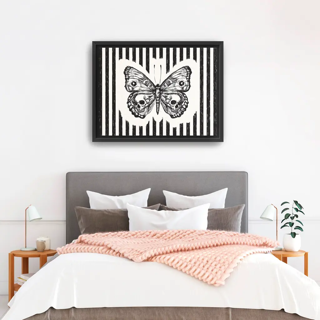 Set against striking black-and-white stripes, the Halloween butterfly flutters with quiet power. Each delicate curve plays off the rhythm of shadow and light Our Gallery Wrap Canvas Prints are proudly assembled with high quality materials in California, USA. Each piece is printed on a thick, archival grade canvas using Giclee technology. It is then hand-stretched by our experienced artisans over solid wood bars, which will not warp over time. The final product is a piece personally crafted for you to confidently display on your wall. Care and Assembly: Ensure that the location of your piece has little to no exposure to heat, sunlight, and moisture. Wipe clean, only if needed. Each piece includes a sawtooth hanger to hang on your wall horizontally.
