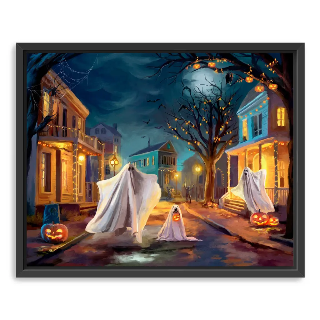 A group of sheet-draped spirits dances joyfully through a quiet street, surrounded by glowing jack-o-lanterns and swirling mist. Hues of white, charcoal, and pumpkin orange add warmth and whimsy to your Halloween decor. Our Gallery Wrap Canvas Prints are proudly assembled with high quality materials in California, USA. Each piece is printed on a thick, archival grade canvas using Giclee technology. It is then hand-stretched by our experienced artisans over solid wood bars, which will not warp over time. The final product is a piece personally crafted for you to confidently display on your wall. Care and Assembly: Ensure that the location of your piece has little to no exposure to heat, sunlight, and moisture. Wipe clean, only if needed. Each piece includes hanging hardware to hang on your wall horizontally.
