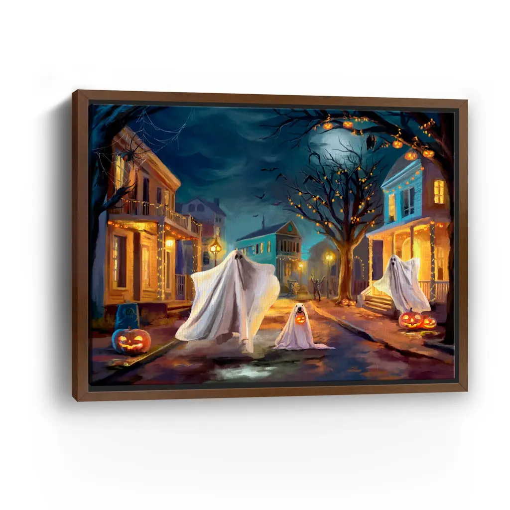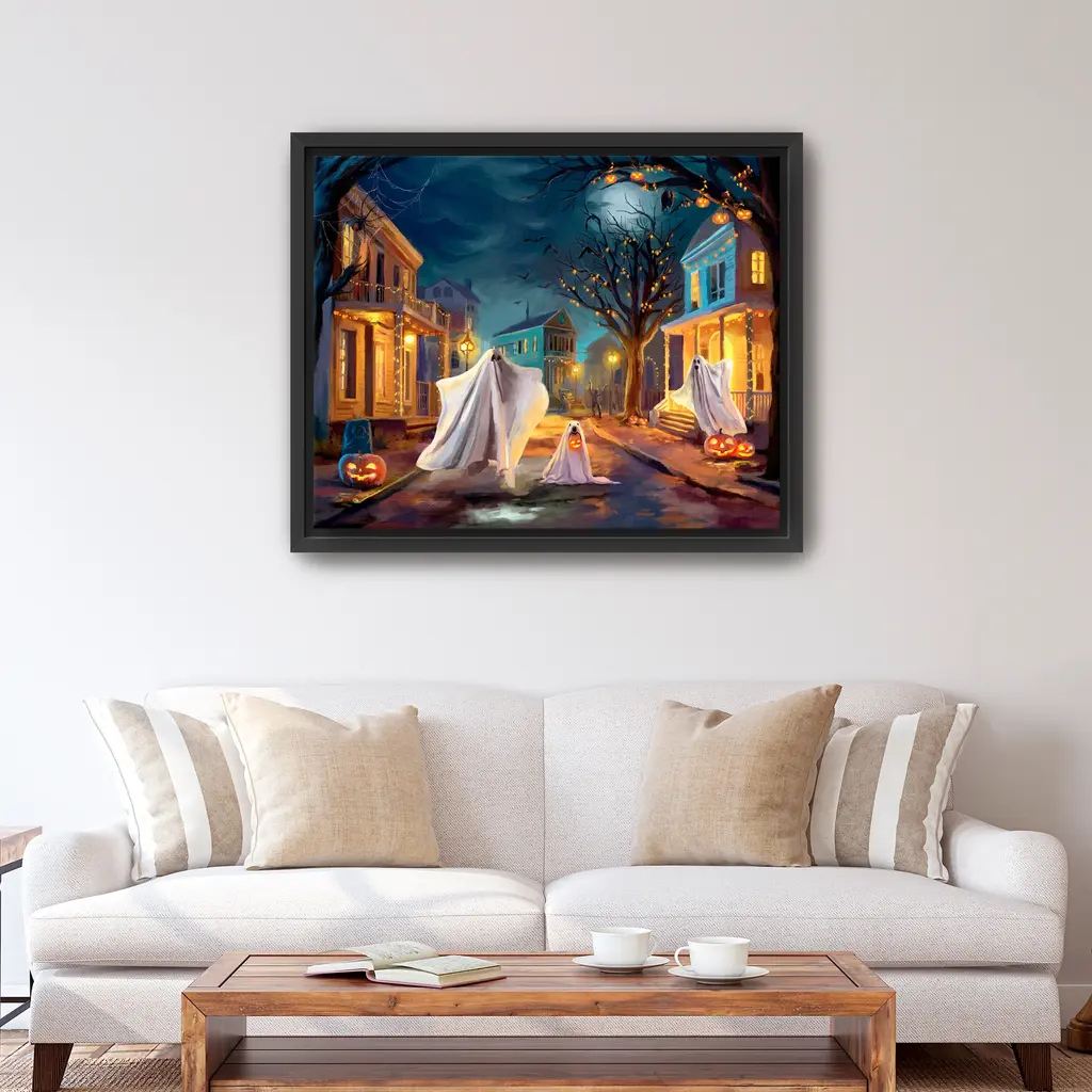 A group of sheet-draped spirits dances joyfully through a quiet street, surrounded by glowing jack-o-lanterns and swirling mist. Hues of white, charcoal, and pumpkin orange add warmth and whimsy to your Halloween decor. Our Gallery Wrap Canvas Prints are proudly assembled with high quality materials in California, USA. Each piece is printed on a thick, archival grade canvas using Giclee technology. It is then hand-stretched by our experienced artisans over solid wood bars, which will not warp over time. The final product is a piece personally crafted for you to confidently display on your wall. Care and Assembly: Ensure that the location of your piece has little to no exposure to heat, sunlight, and moisture. Wipe clean, only if needed. Each piece includes hanging hardware to hang on your wall horizontally.