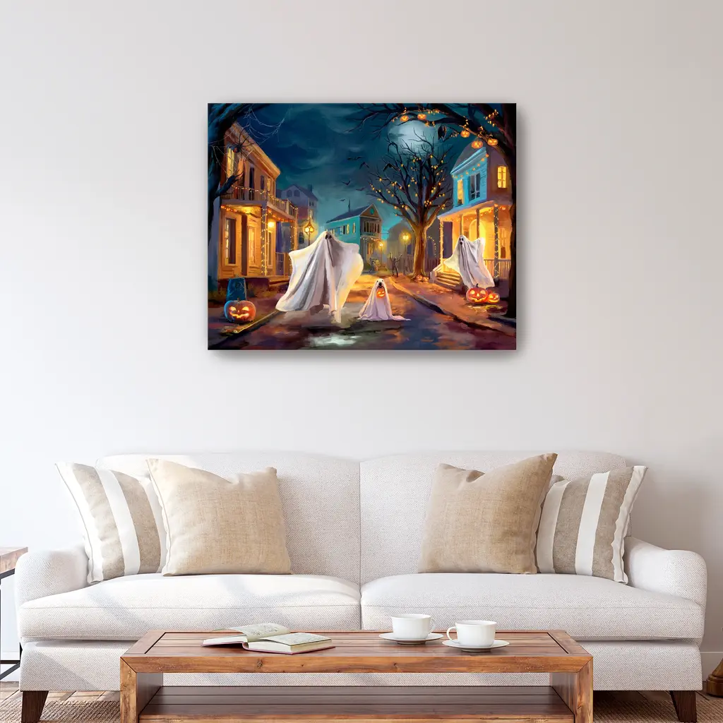 A group of sheet-draped spirits dances joyfully through a quiet street, surrounded by glowing jack-o-lanterns and swirling mist. Hues of white, charcoal, and pumpkin orange add warmth and whimsy to your Halloween decor. Our Gallery Wrap Canvas Prints are proudly assembled with high quality materials in California, USA. Each piece is printed on a thick, archival grade canvas using Giclee technology. It is then hand-stretched by our experienced artisans over solid wood bars, which will not warp over time. The final product is a piece personally crafted for you to confidently display on your wall. Care and Assembly: Ensure that the location of your piece has little to no exposure to heat, sunlight, and moisture. Wipe clean, only if needed. Each piece includes hanging hardware to hang on your wall horizontally.