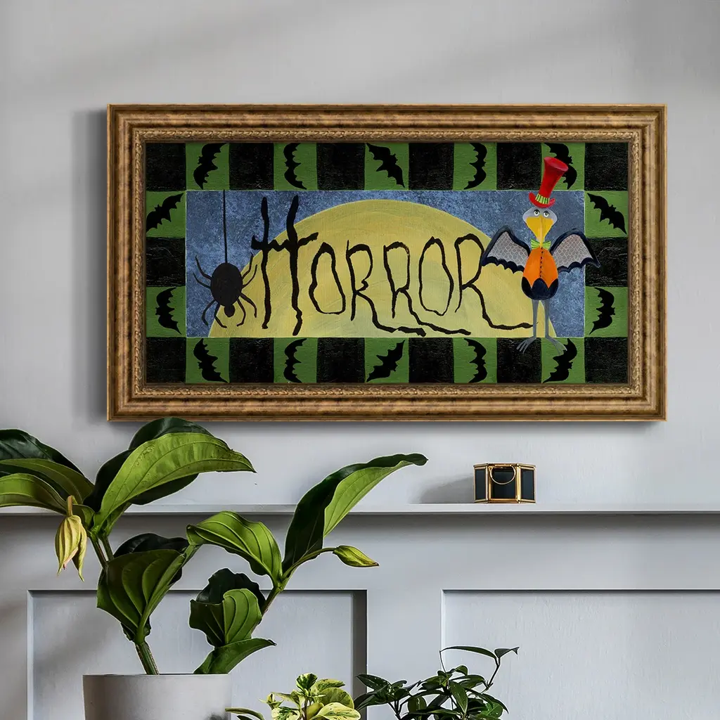 Halloween Trick or Treaters Collection D Premium Framed Canvas- Ready to Hang A Premium Framed Canvas created to last. Framed in distressed wood and available in an array of sizes and colors Featuring a beveled a solid wood stretcher bar, each piece comes ready to hand 3 SIZES AVAILABLE 21''X37'' - Overall Size 25''X45'' - Overall Size 29''x53'' - Overall Size Each piece is made to order. Each piece comes with hanging hardware. Made in the USA Ready to Hang Giclee Paper Print Acrylic Glass Beveled Matt Board