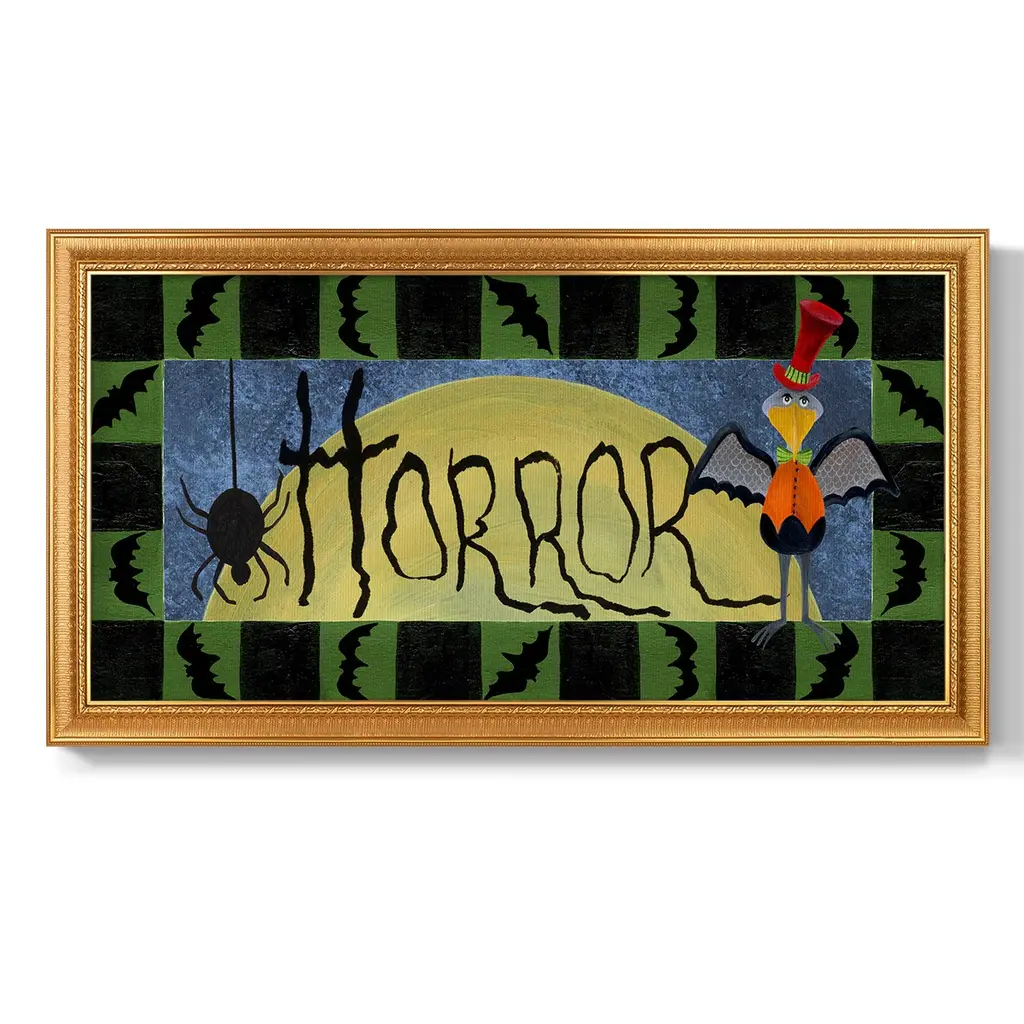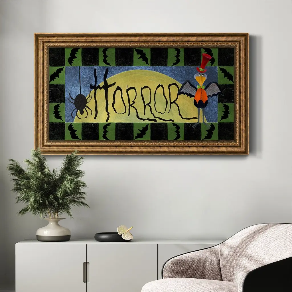 Halloween Trick or Treaters Collection D Premium Framed Canvas- Ready to Hang A Premium Framed Canvas created to last. Framed in distressed wood and available in an array of sizes and colors Featuring a beveled a solid wood stretcher bar, each piece comes ready to hand 3 SIZES AVAILABLE 21''X37'' - Overall Size 25''X45'' - Overall Size 29''x53'' - Overall Size Each piece is made to order. Each piece comes with hanging hardware. Made in the USA Ready to Hang Giclee Paper Print Acrylic Glass Beveled Matt Board