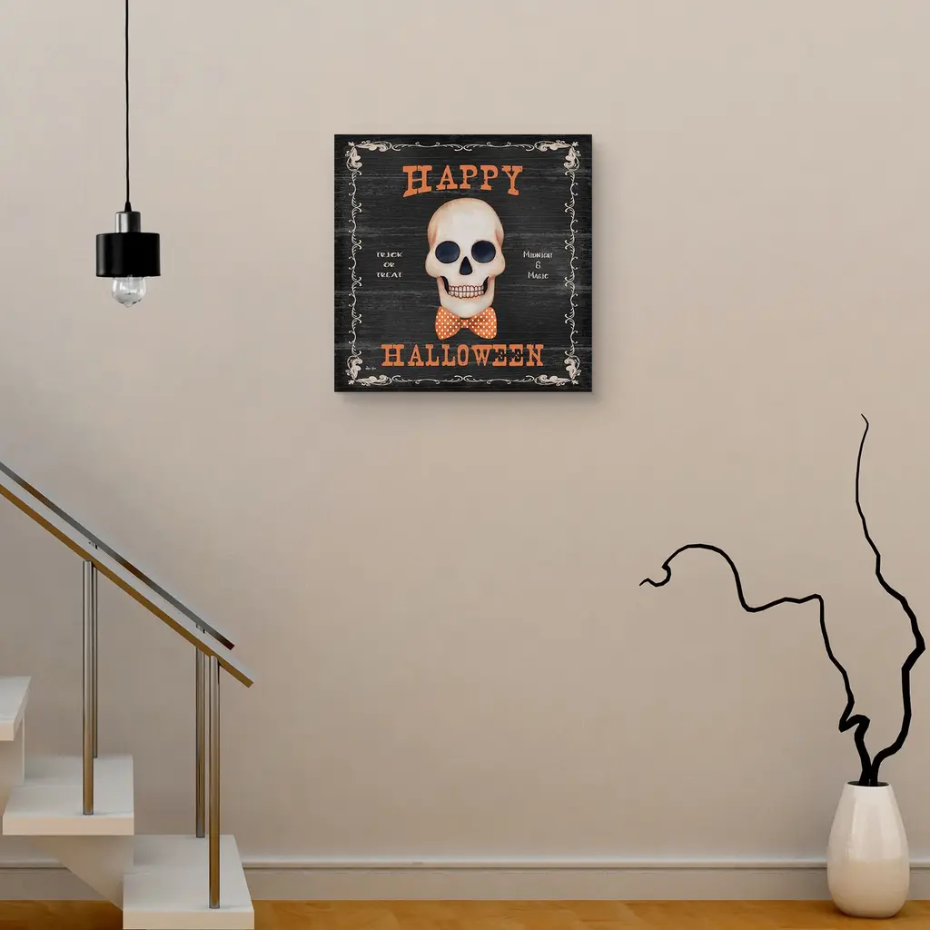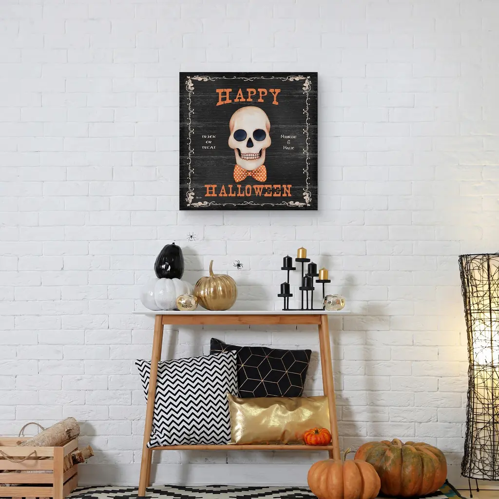 This ghoulish vintage-inspired sign by artist Sheri Hart features a dapper skeleton complete with an orange polka-dotted bowtie and sweet Halloween wishes. Perfectly embellished with swirls and distressed details, this Halloween canvas print is perfect for turning your home sweet home into a true haunted house!