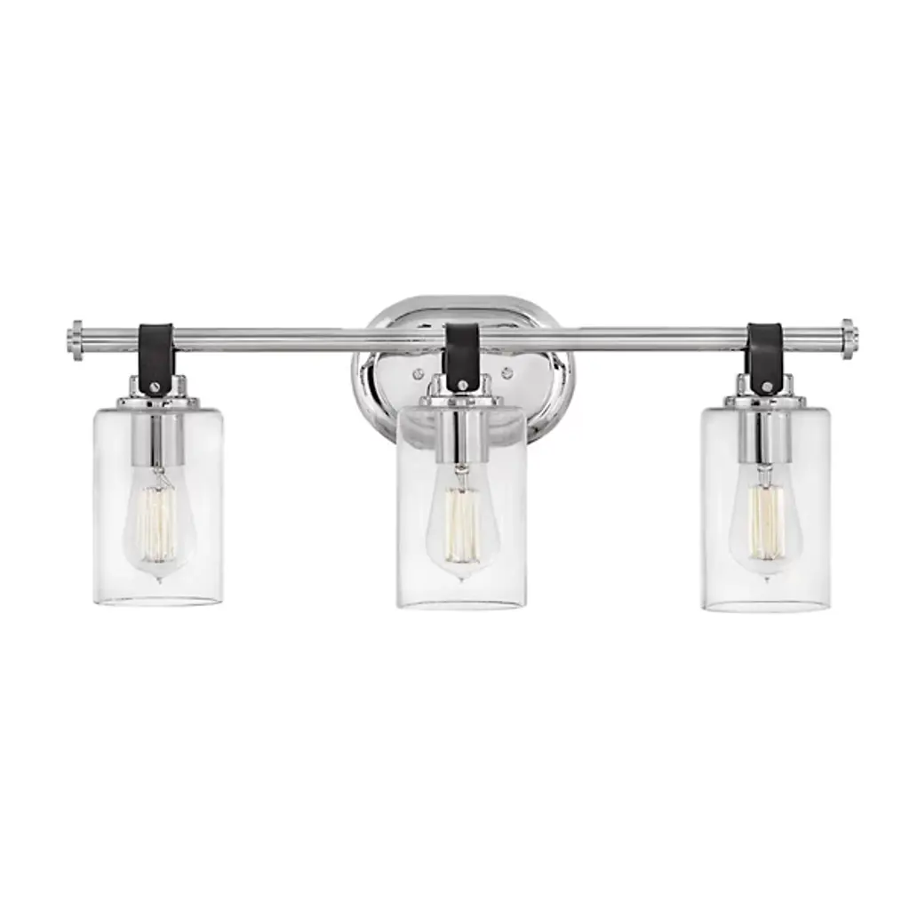 Complete a modern bathroom with the addition of the Halstead Vanity Light by Hinkley Lighting. Blending textures and finishes while remaining simple and versatile, this fixture is anchored in place by an oval-shaped backplate in a sleek polished finish. A set of clear cylindrical glass shades are held in evenly spaced intervals along a slender bar, each one containing a glowing incandescent lamp. When illuminated, this fixture creates an inviting atmosphere while providing practical bathroom light.