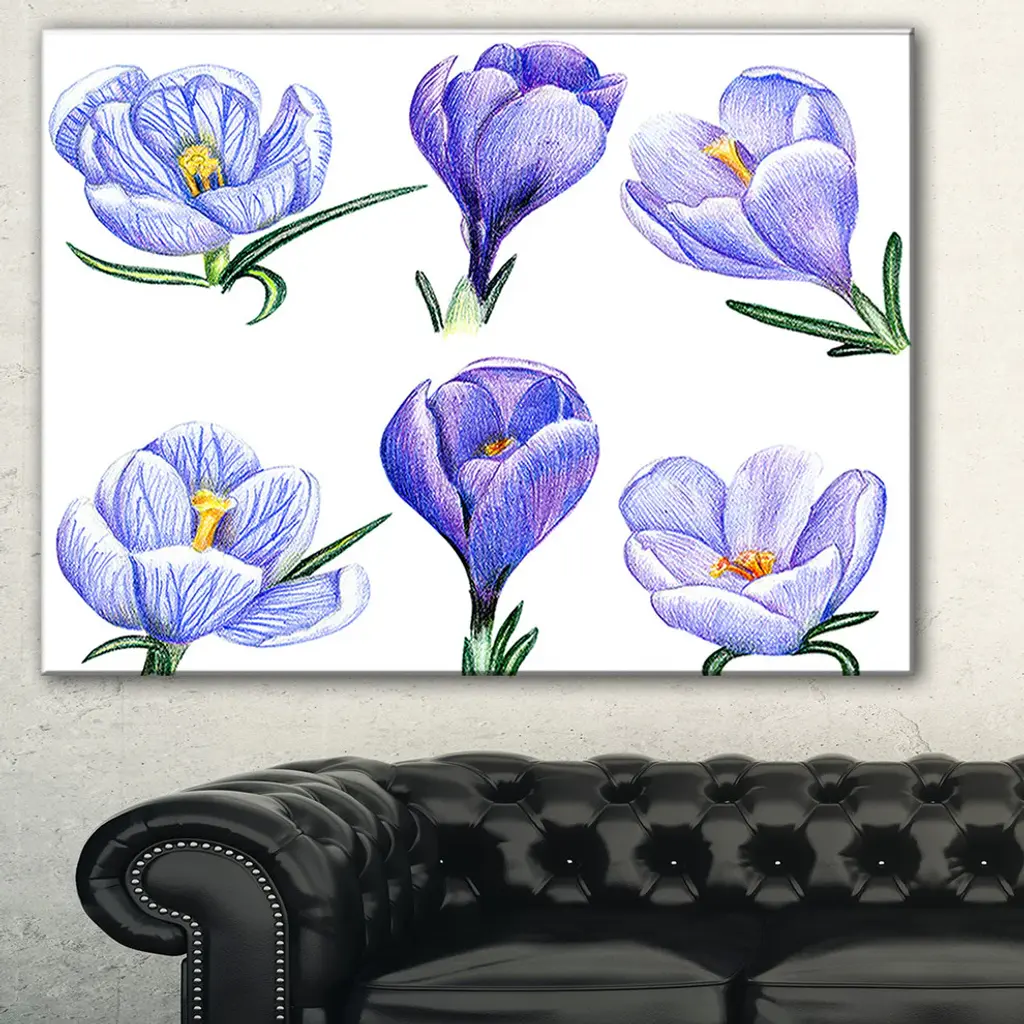 The Hand-drawn Crocuses canvas art print is sure to make an impression on anyone who sees it. This artwork is gallery wrapped around a 1-inch solid wood frame and arrives carefully packaged and entirely ready to hang on the wall. Design Art only uses the highest resolution and pigments to ensure a crisp colorful print that is never faded or pixelated. This artwork is sure to be a conversation starter in any home or office.