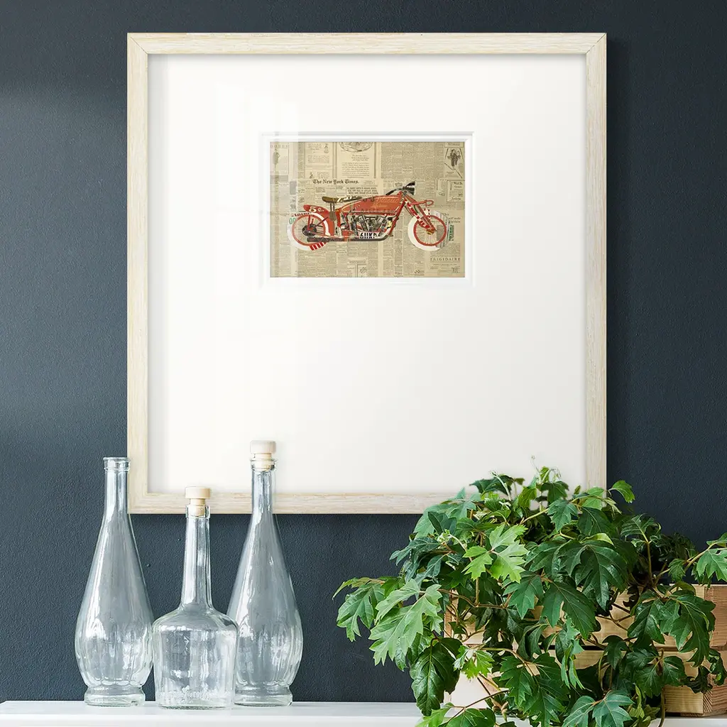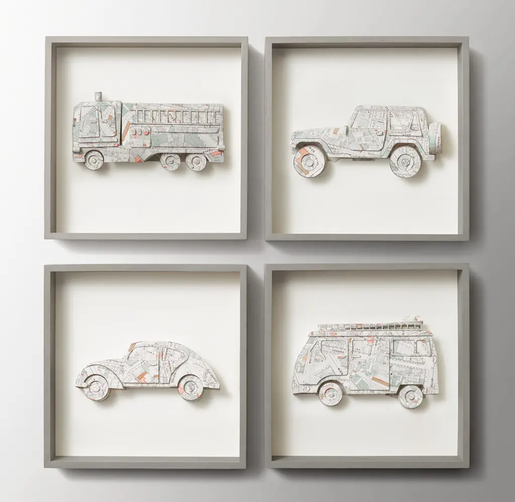 Vintage maps are carefully hand-folded to create dimensional classic cars in our artwork. Set against white linen, each vehicle is detailed with bumpers, windows and tires to delight aspiring motorists for years to come.