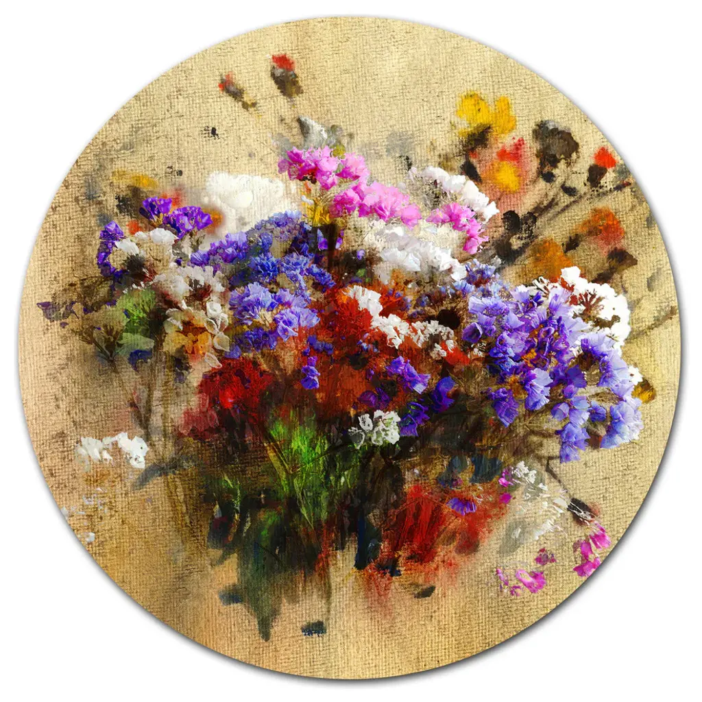 Bring Contemporary Abstraction to your home with this large Circle Metal wall art. This Hand-painted Bouquet of Flowers Metal Artwork makes it the focal point of any room or office. - White Gloss Coating ensures colors are extra vibrant with light reflection.- Aluminum grade Sheet Metal with 1 inch mounting frame on the back giving the illusion that the artwork is floating on the wall..- Mounting Brackets are included along with instructions.- High Quality Digital images are created directly into a glossy aluminum panel producing a stunning and captivating print into the glossy finish of the metal.- Water, Fire and Scratch resistant HD Aluminum panels.- Looks better than any photo paper and guaranteed to last at least 20 years- Easy to clean with a microfiber cloth. Colors are far superior to regular Canvas Art. - Easy to Hang