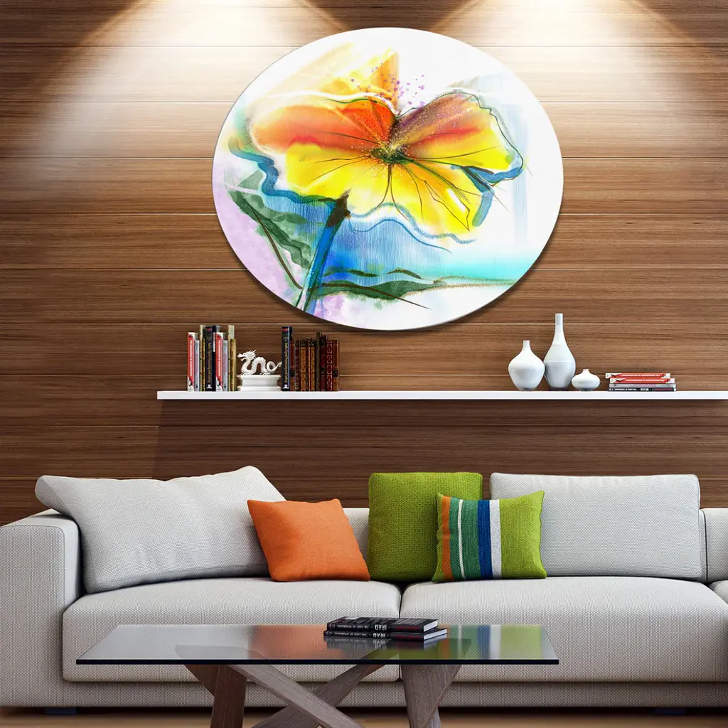 Bring Contemporary Abstraction to your home with this large Circle Metal wall art. This Hand Painted Yellow Pink Red Daisies Metal Artwork makes it the focal point of any room or office. - White Gloss Coating ensures colors are extra vibrant with light reflection.- Aluminum grade Sheet Metal with 1 inch mounting frame on the back giving the illusion that the artwork is floating on the wall..- Mounting Brackets are included along with instructions.- High Quality Digital images are created directly into a glossy aluminum panel producing a stunning and captivating print into the glossy finish of the metal.- Water, Fire and Scratch resistant HD Aluminum panels.- Looks better than any photo paper and guaranteed to last at least 20 years- Easy to clean with a microfiber cloth. Colors are far superior to regular Canvas Art. - Easy to Hang