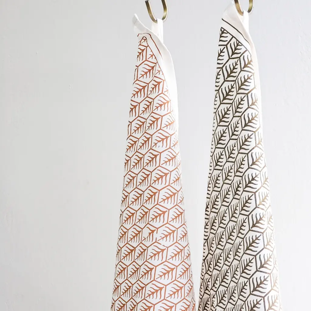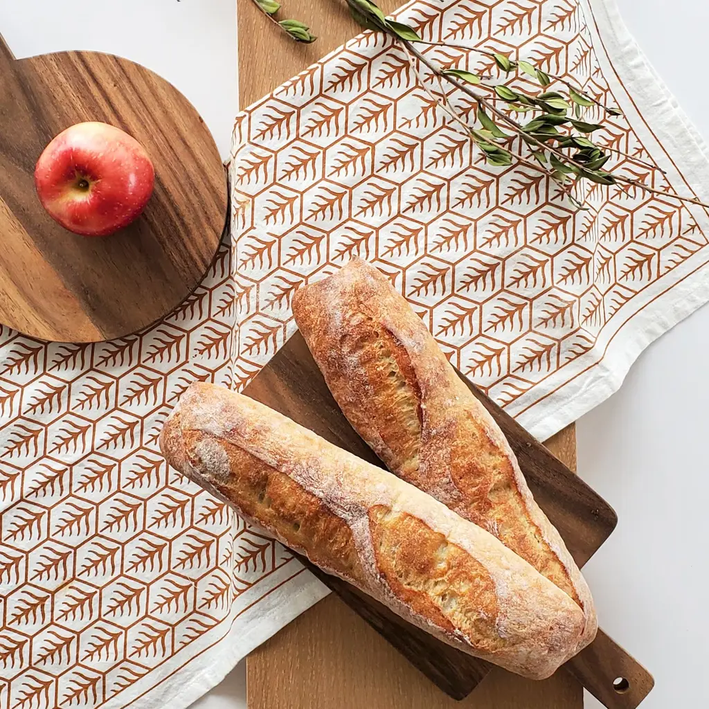 Add a bit of artisan-inspired style to the kitchen with hand screen-printed tea towels, printed in two colors on natural cotton. Tea towels come with a hanging loop for hanging up! Great for drying dishes or hands in the kitchen, lining a bread basket, or to be used as waste-free wrapping for a special gift.