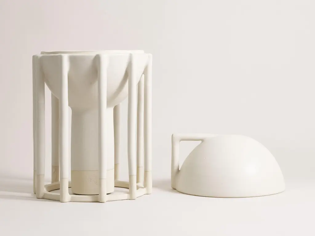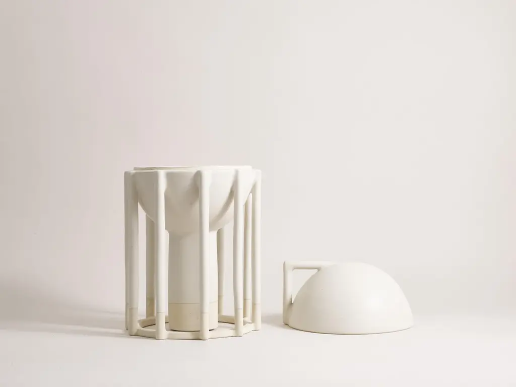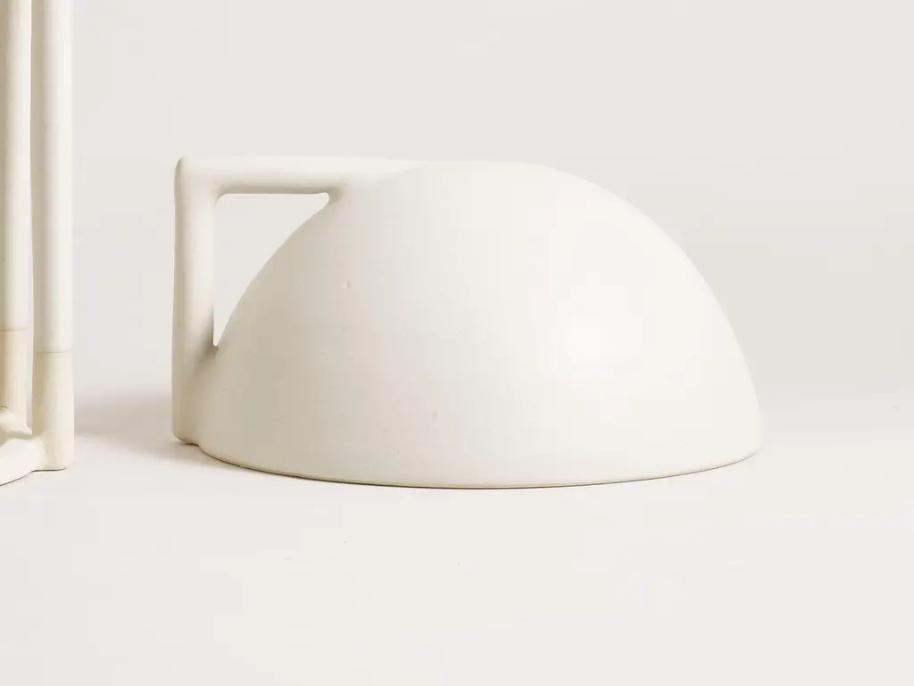 Handcrafted hilla 001 by LovebuchDimensions: Ø 23 x H 36 cmMaterials: Sandstone, handcrafted pieceKatia works with wood and clay, these raw, powerfully expressive materials are shaped to create a poetry of objects that inhabit our daily lives. Sculptural ceramics are also functional, they are made of stoneware modeled and turned in an artisanal way. Cooking them at 1250 ° C gives them resistance and permanence that has become rare.In the Lovebuch series (2015-2019) extracts from trees chosen from the Jurassian forest are cut, dried and polished at length. Their primitive, massive and organic presence is adorned with delicate paintings around a heart that has grown over time.