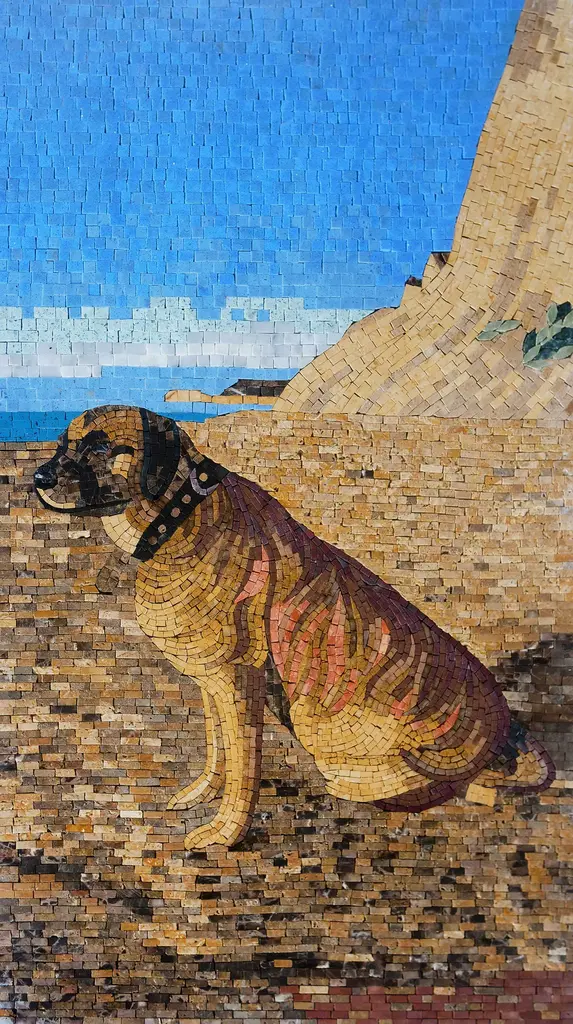 Discover the enchanting beauty of our Handcrafted Mosaic Art Featuring a Dog, a stunning piece that celebrates the loyalty and companionship of man's best friend. This exquisite mosaic depicts a loyal dog gazing out at the ocean, offering a glimpse into the heartwarming bond between pets and their humans. Each element of the artwork is meticulously crafted, showcasing the intricate details of the dog's fur, the soft sandy beach, and the majestic cliffs that frame a serene coastal landscape.This mosaic is not just a decoration; it is a statement piece that transforms any space into a tranquil sanctuary. The vibrant colors and varied textures of the stones used in this artwork create a captivating visual experience that draws the eye and sparks conversation. Imagine this piece adorning your living room, hallway, or office, bringing warmth and a touch of nature indoors.Handcrafted with love and precision, our mosaic art is made from high-quality stones, selected for their beauty and durability. Each mosaic is unique, with no two pieces identical, ensuring that your artwork is truly one-of-a-kind. This makes it a perfect gift for dog lovers, art enthusiasts, or anyone who appreciates the charm of handcrafted décor.Bring home a piece that not only enhances your surroundings but also tells a story of loyalty and love. Our Handcrafted Mosaic Art Featuring a Dog is more than just décor—it's a tribute to the special connection you share with your furry friend. Elevate your space today with this breathtaking mosaic masterpiece that captures the essence of devotion and the beauty of nature.