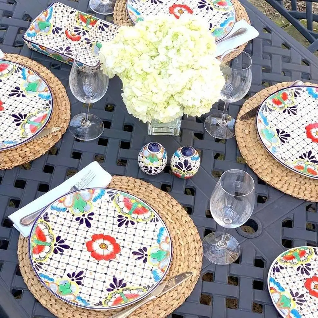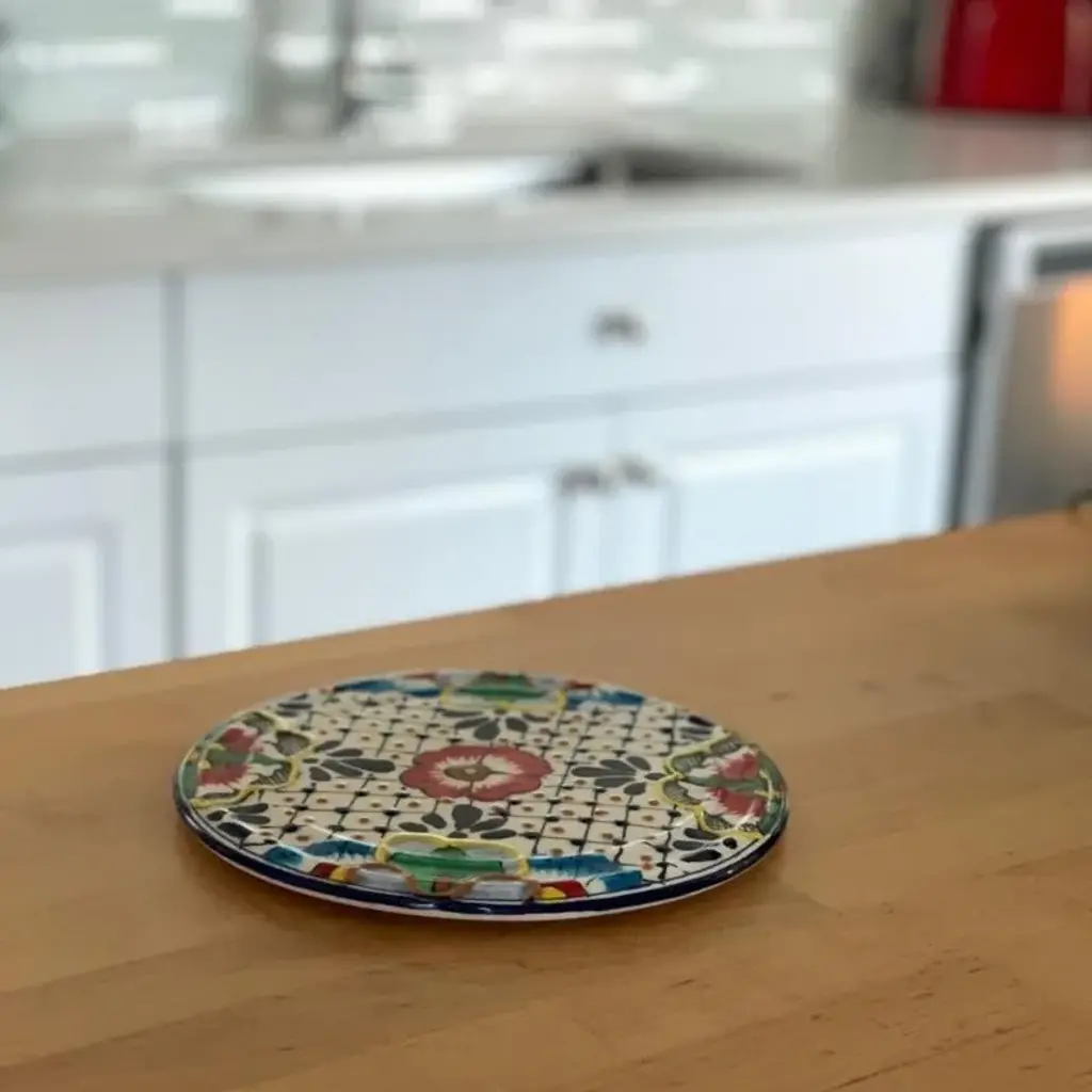 This traditional Mexican pottery is crafted and hand painted by artisans in Mexican using traditional pottery technique. Each piece is highly textured and unique -- these pieces are gorgeous, yet very functional. This piece is a functional hot plate/trivet or a beautiful wall decoration (hole on the back for hanging). Measures 8" diameter, .5" high. Handmade in Mexico. Product Features: Story Behind the Art: There is no sign to find the small family-owned ceramic workshop in the state of Guanajuato. Behind the large wooden gate, women artisans are hand painting unfired ceramics while men work the kilns, as they have since the late 70s. Each piece has personality from the dots and swirls to the handpainted logo on the bottom. And each is lead free, microwave and dishwasher safe.The handcrafted touch of artisan skill creates variations in color, size and design. If buying two of the same item, slight differences should be expected. Note: Color discrepancies may occur between this product and your computer screen. Imported