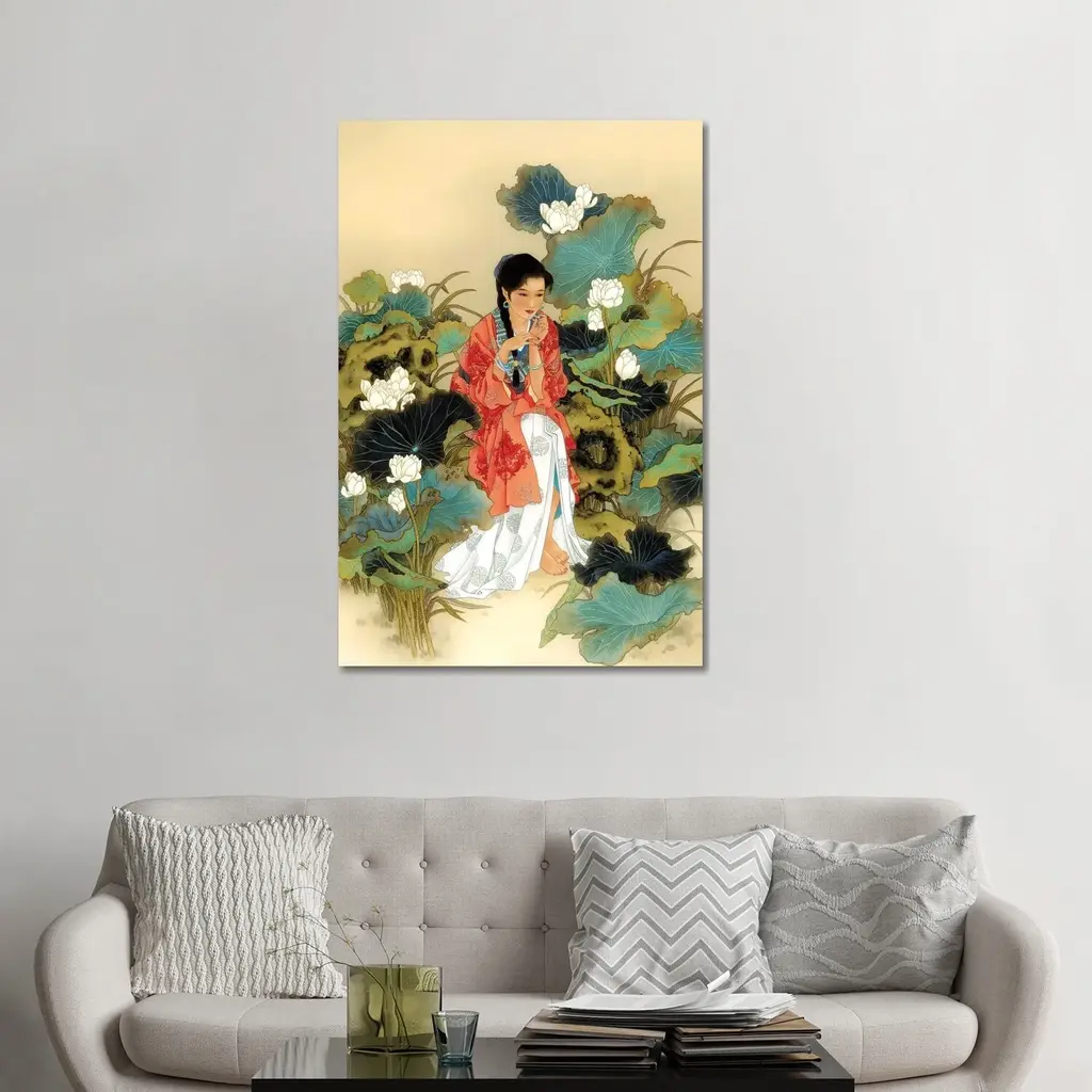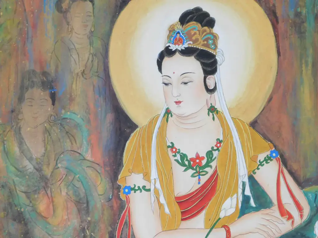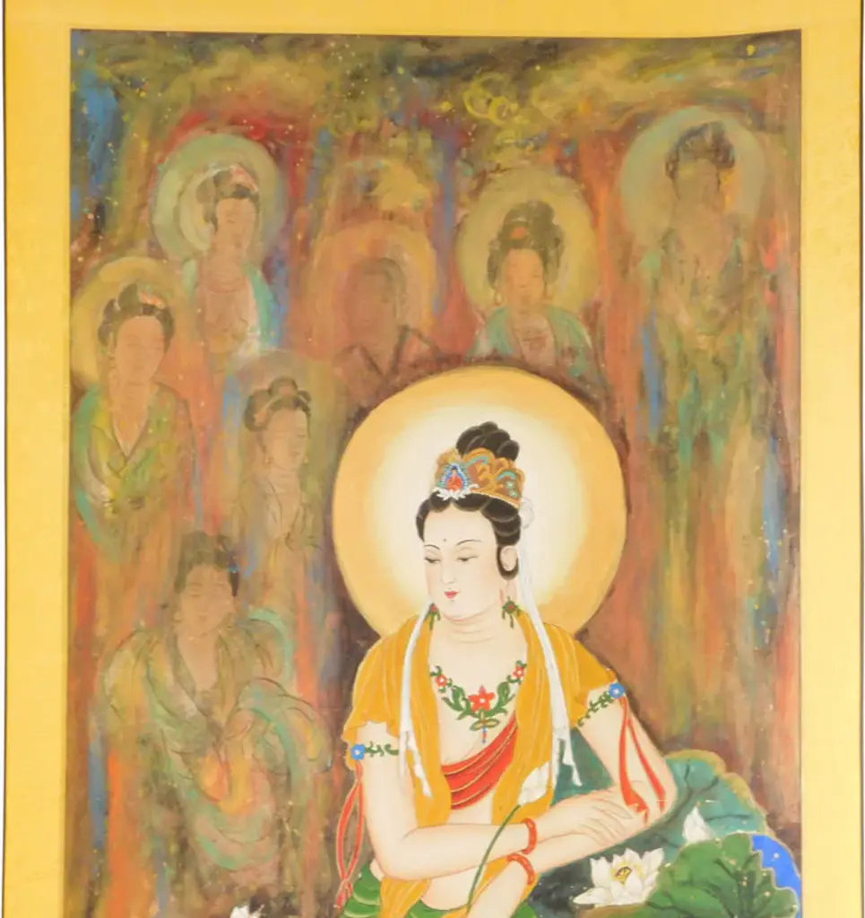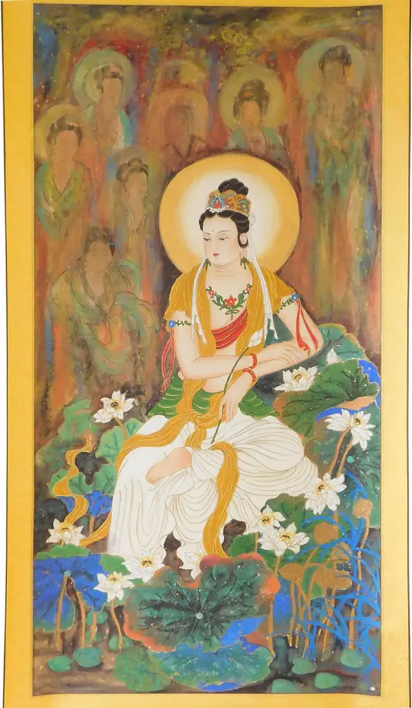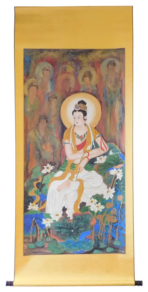 This is a watercolor hand painting statue of Kwan Yin Guanyin, Bodhisattva, Goddess of Mercy�. On this painting Kwan Yin is sitting deep meditate with lotus around the base and belivers images behind.Dimension: w30� x h70�Origin: ChinaMaterial: Paper & watercolorWork: Hand painting
