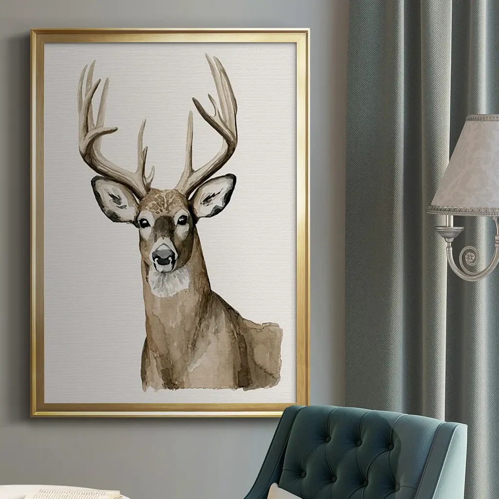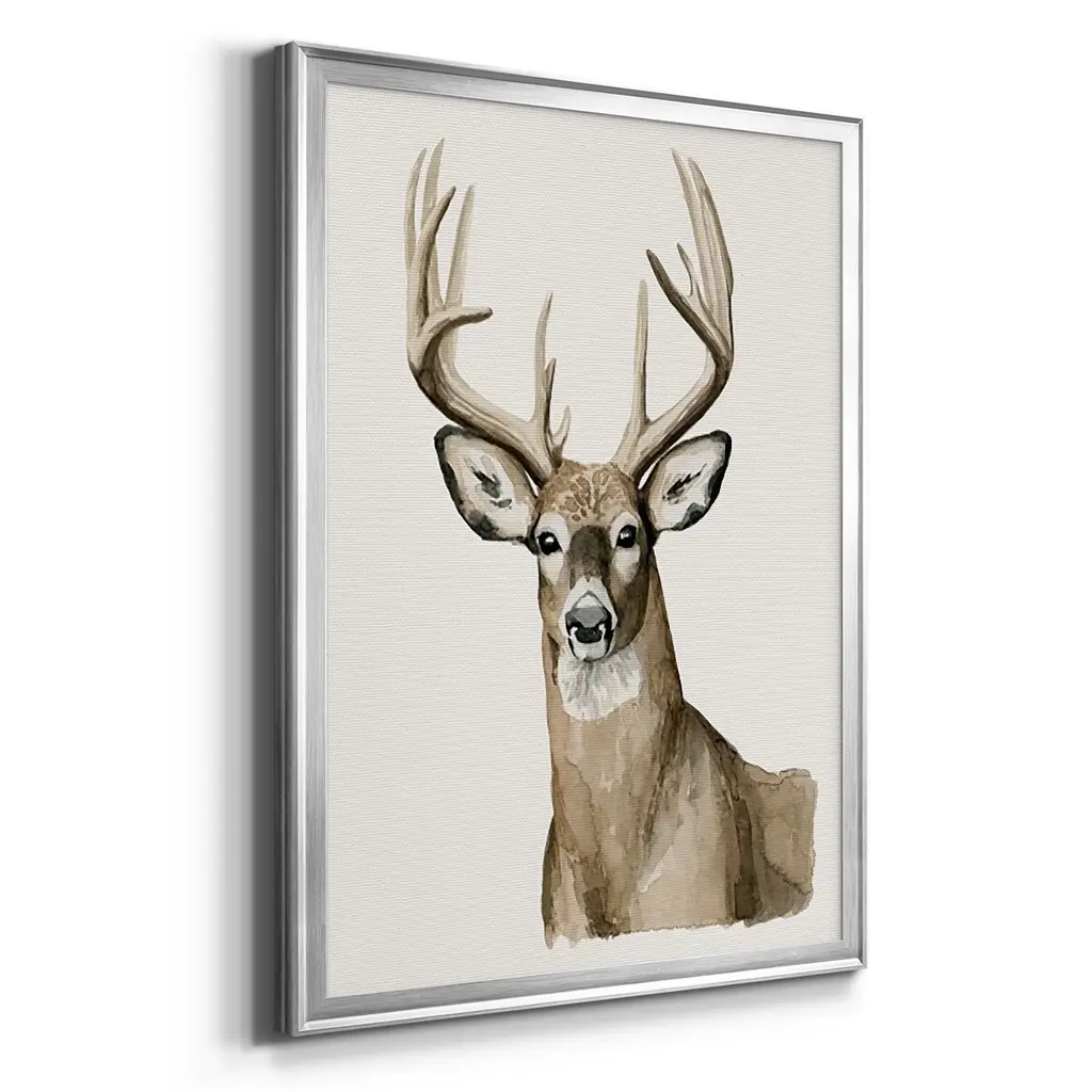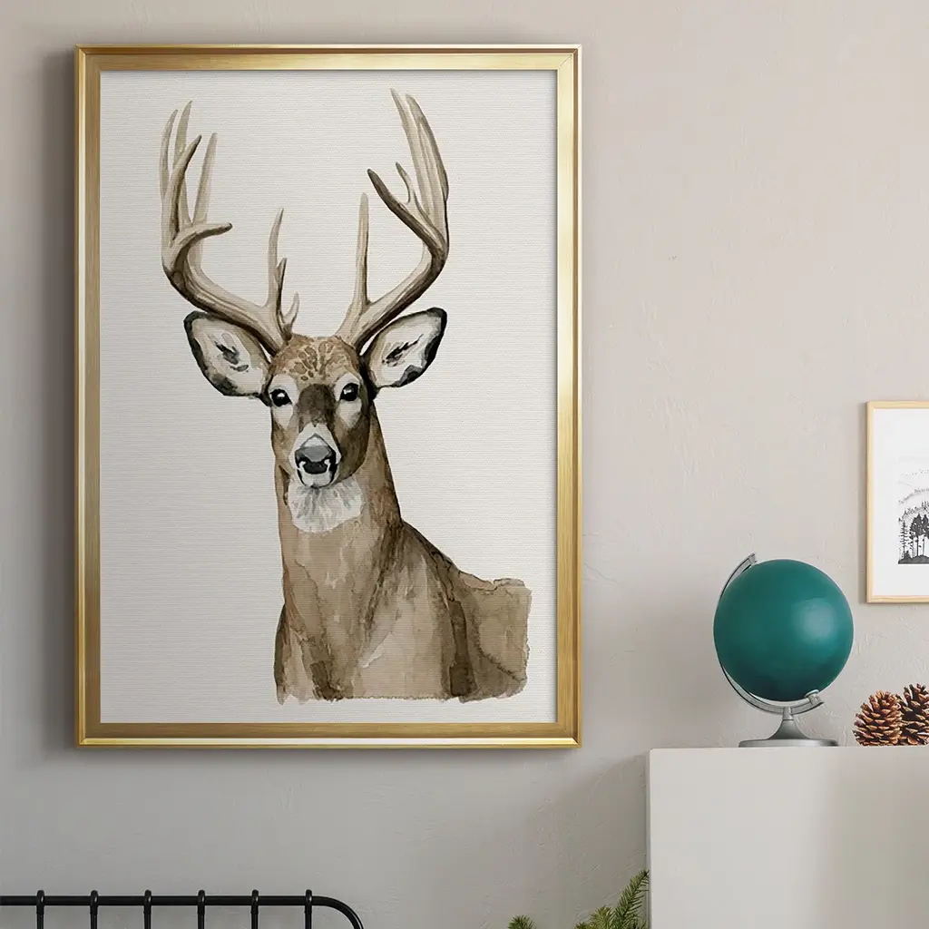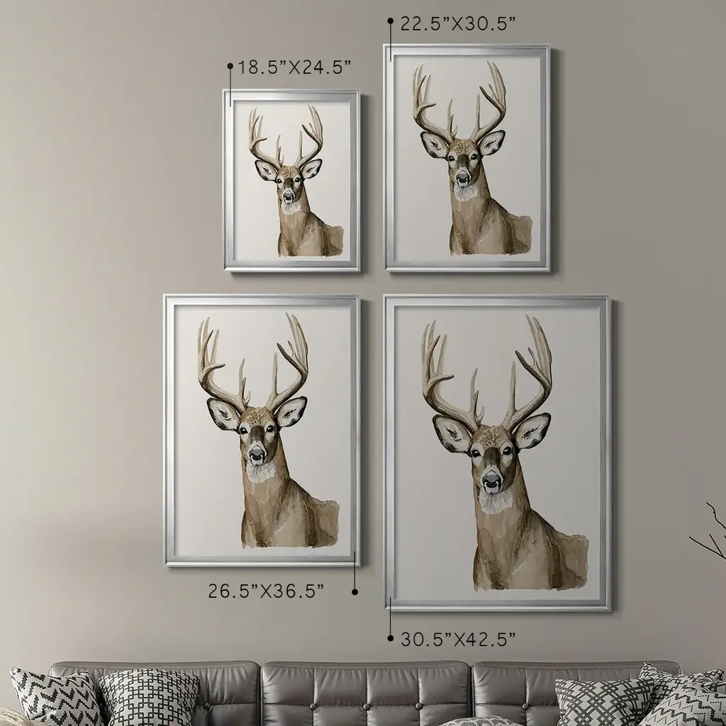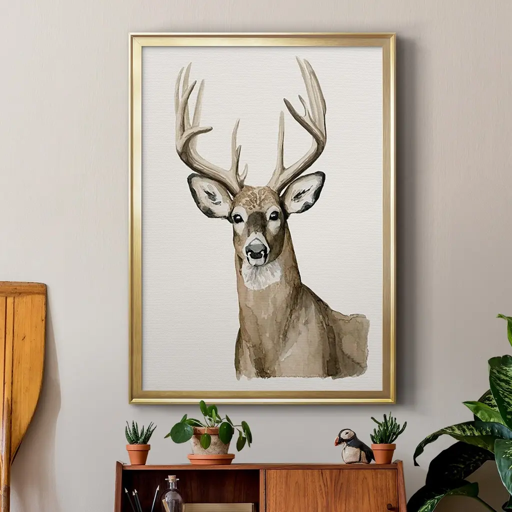 Handsome Whitetail I Premium Framed Print - Ready to Hang A Premium Framed Print created to last. Framed in distressed wood and available in an array of sizes and colors Featuring a beveled a solid wood stretcher bar, each piece comes ready to hand 4 SIZES AVAILABLE 30.5''X42.5'' - Overall Size 26.5'X36.5'' - Overall Size 22.5''x30.5'' - Overall Size 18.5''x24.5'' - Overall Size Each piece is made to order. Each piece comes with hanging hardware. Made in the USA Ready to Hang