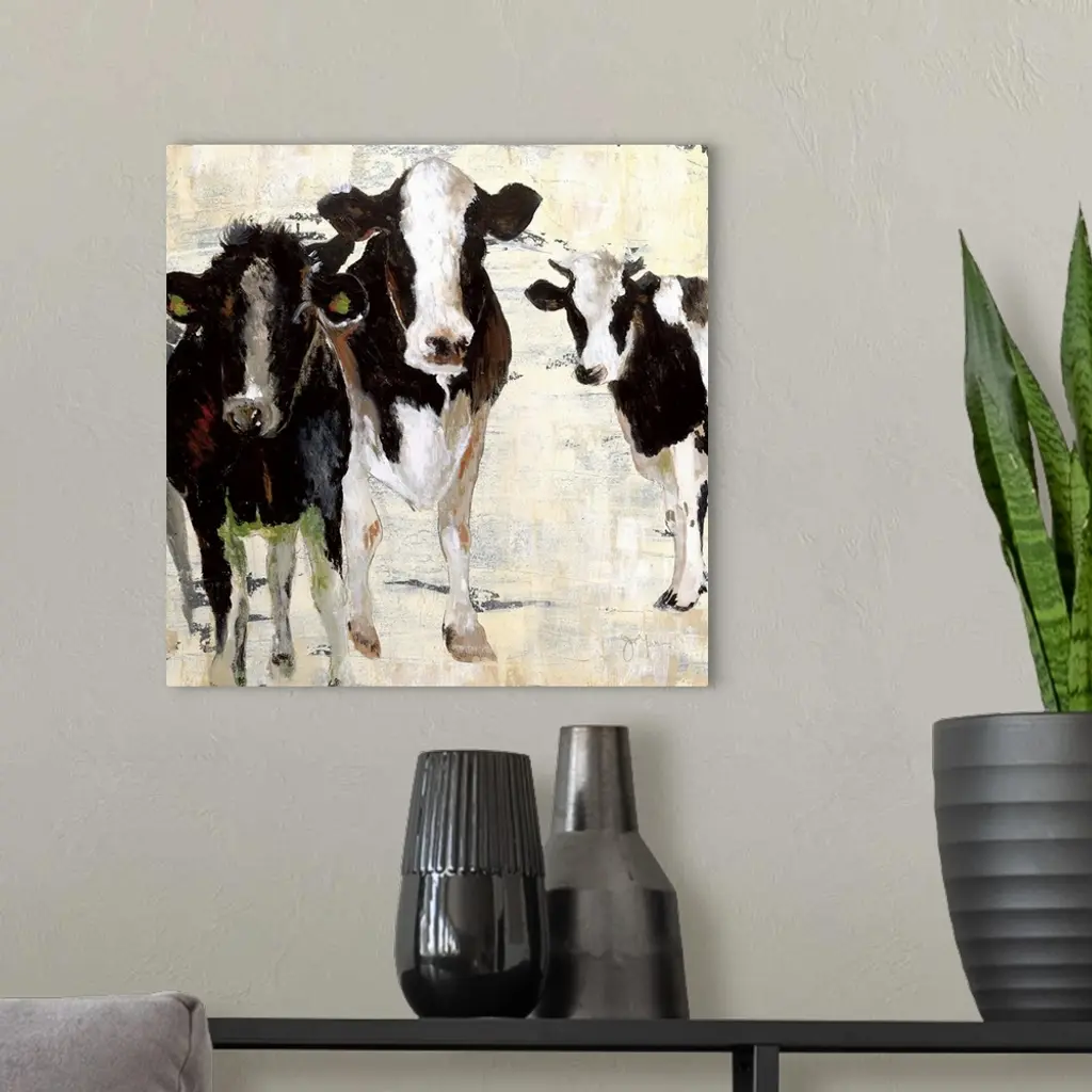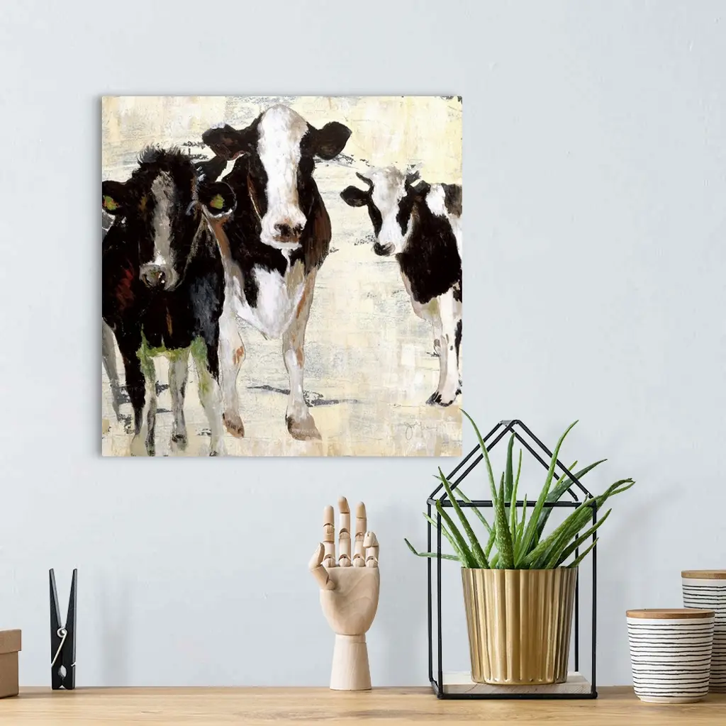 A contemporary painting of three cows standing together using all natural colors with hints of green and red.