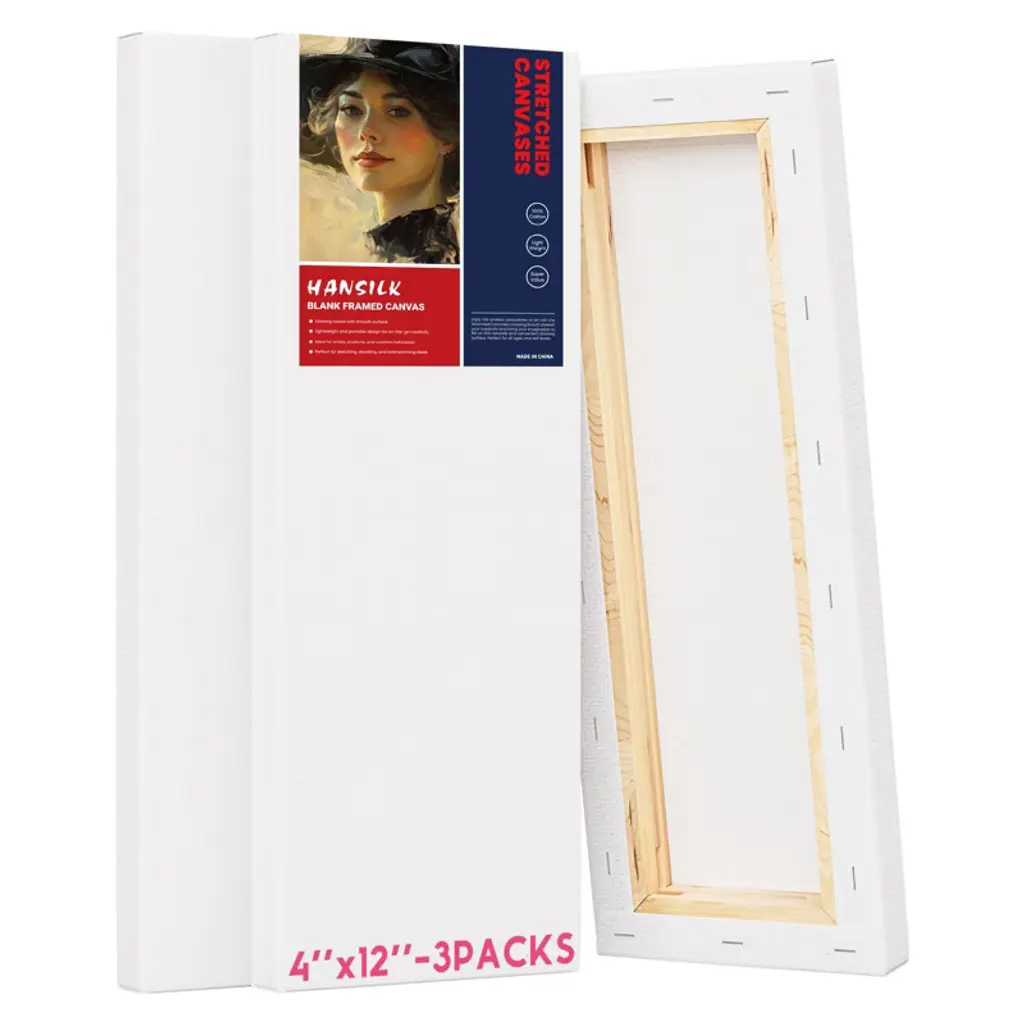Stretched White Canvas 12 Pack includes sizes of 5x7" . Each canvas is Artists Grade, triple primed, made with 100% Cotton and premium pine wood. Perfect for acrylic, oil, and other wet or dry art media. ARTIST GRADE QUALITY: Our pre-stretched canvas is made with 100% cotton and can be used with a wide variety of artist media, from oil paints and watercolor to acrylic, tempera, and gouache