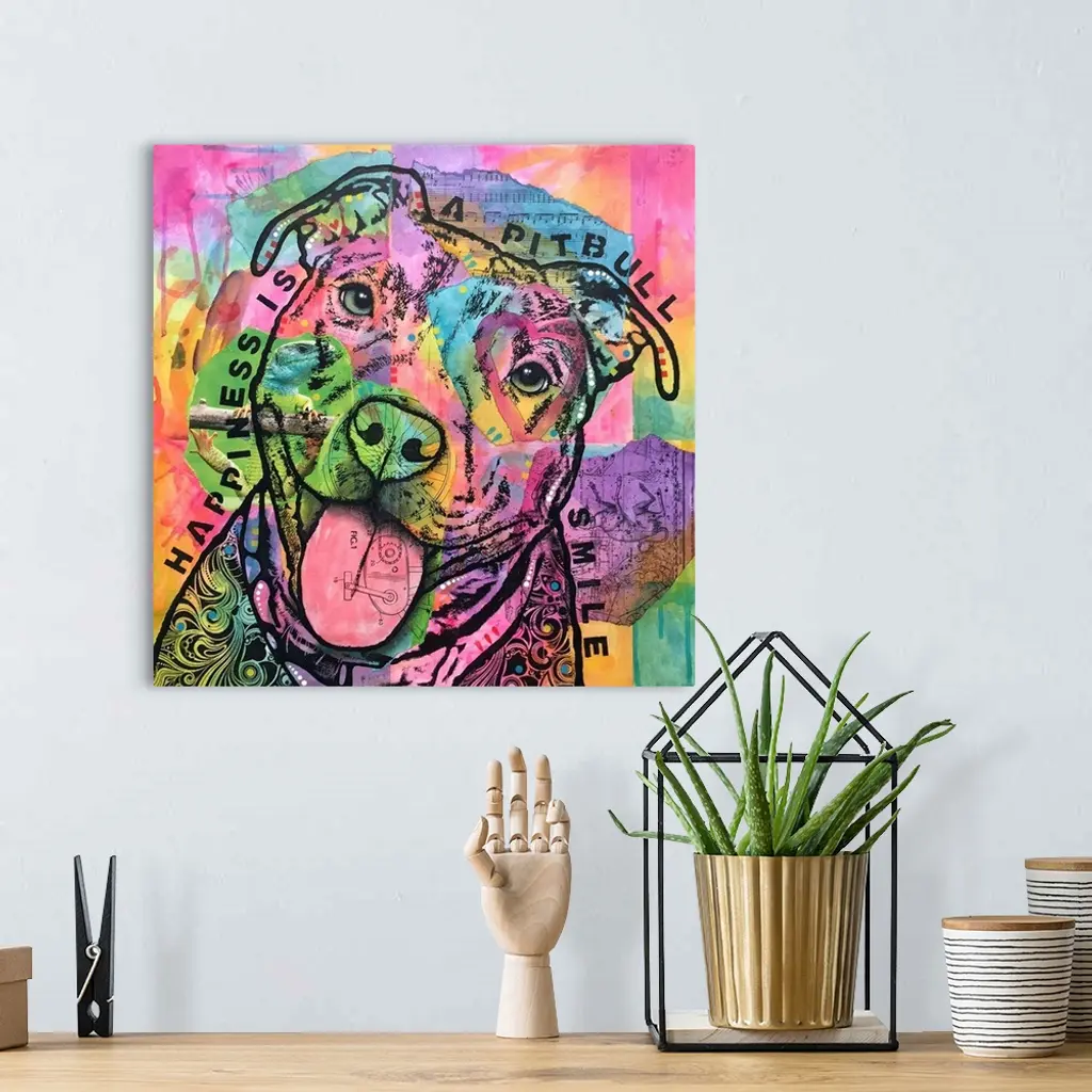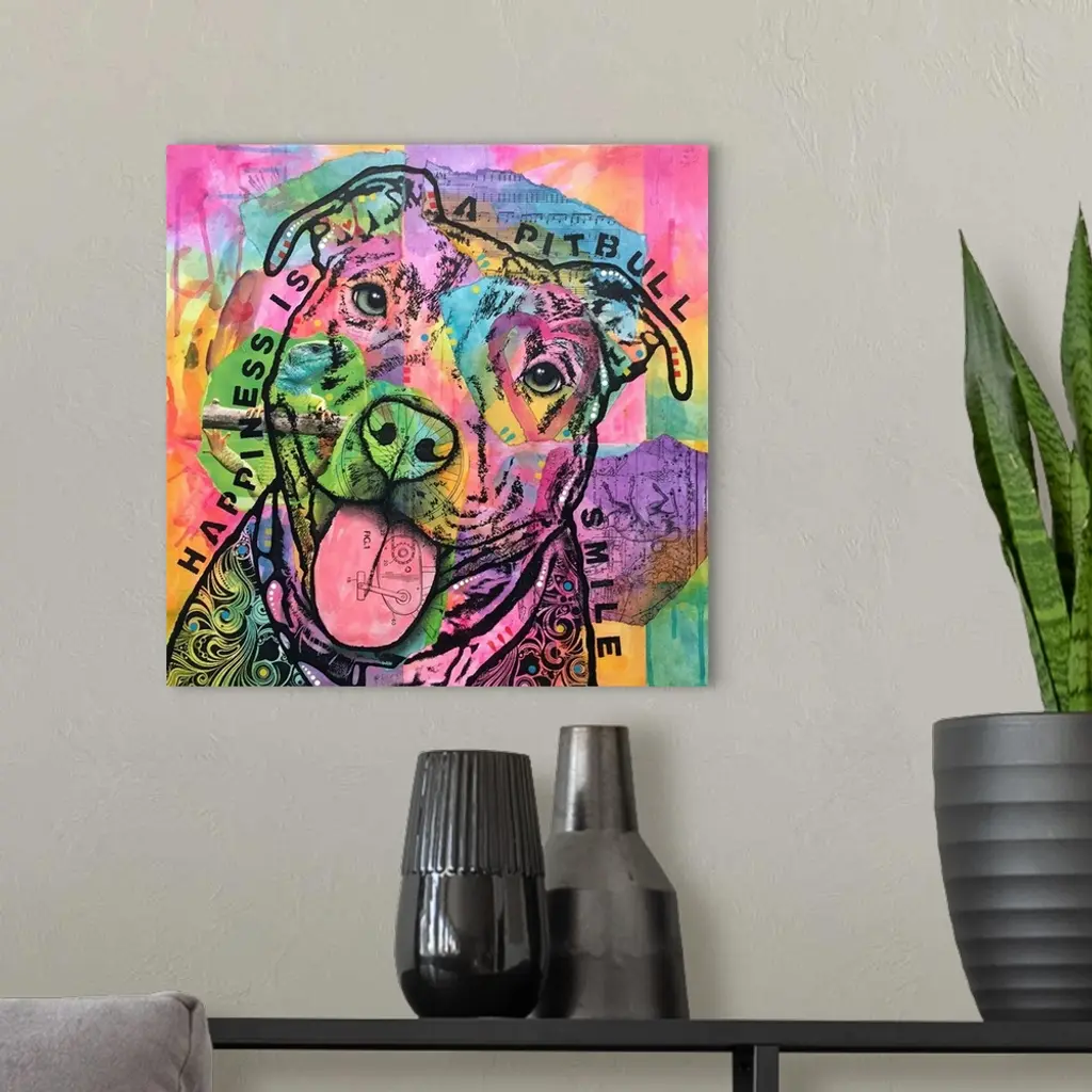 Contemporary stencil painting of a pit bull filled with various colors and patterns and the text, "Happiness is a pit bull smile."