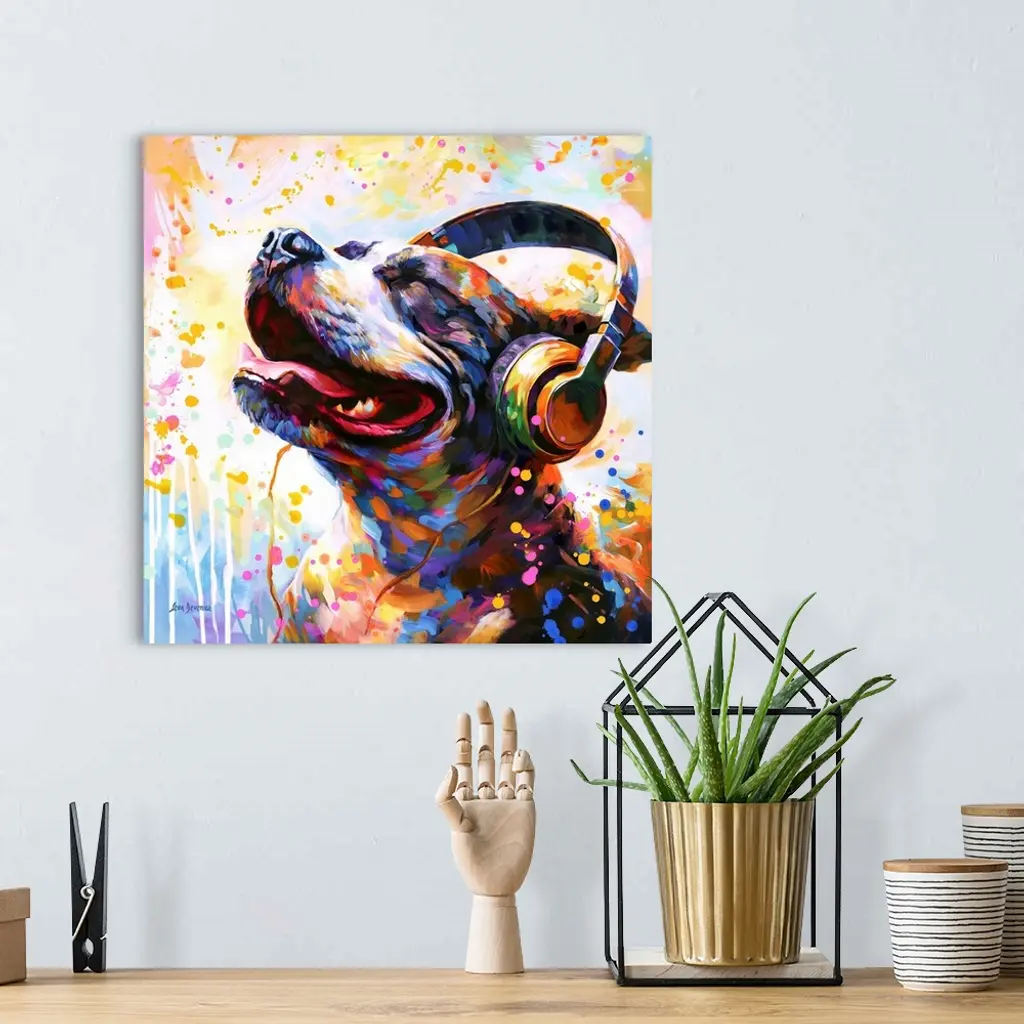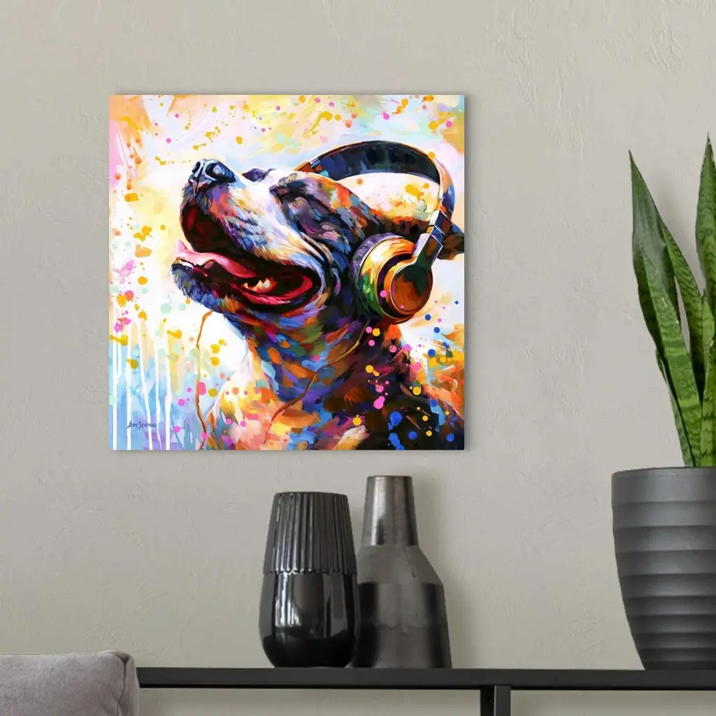 This lively artwork features a colorful dog enjoying music with headphones, set against a vibrant backdrop of colorful splatters, perfect for adding a joyful and playful ambiance to any room or music lover's retreat.