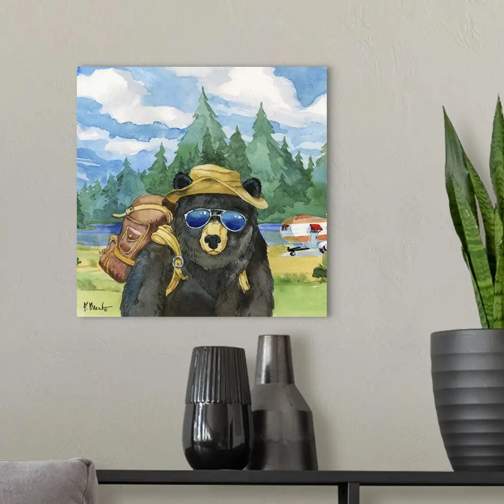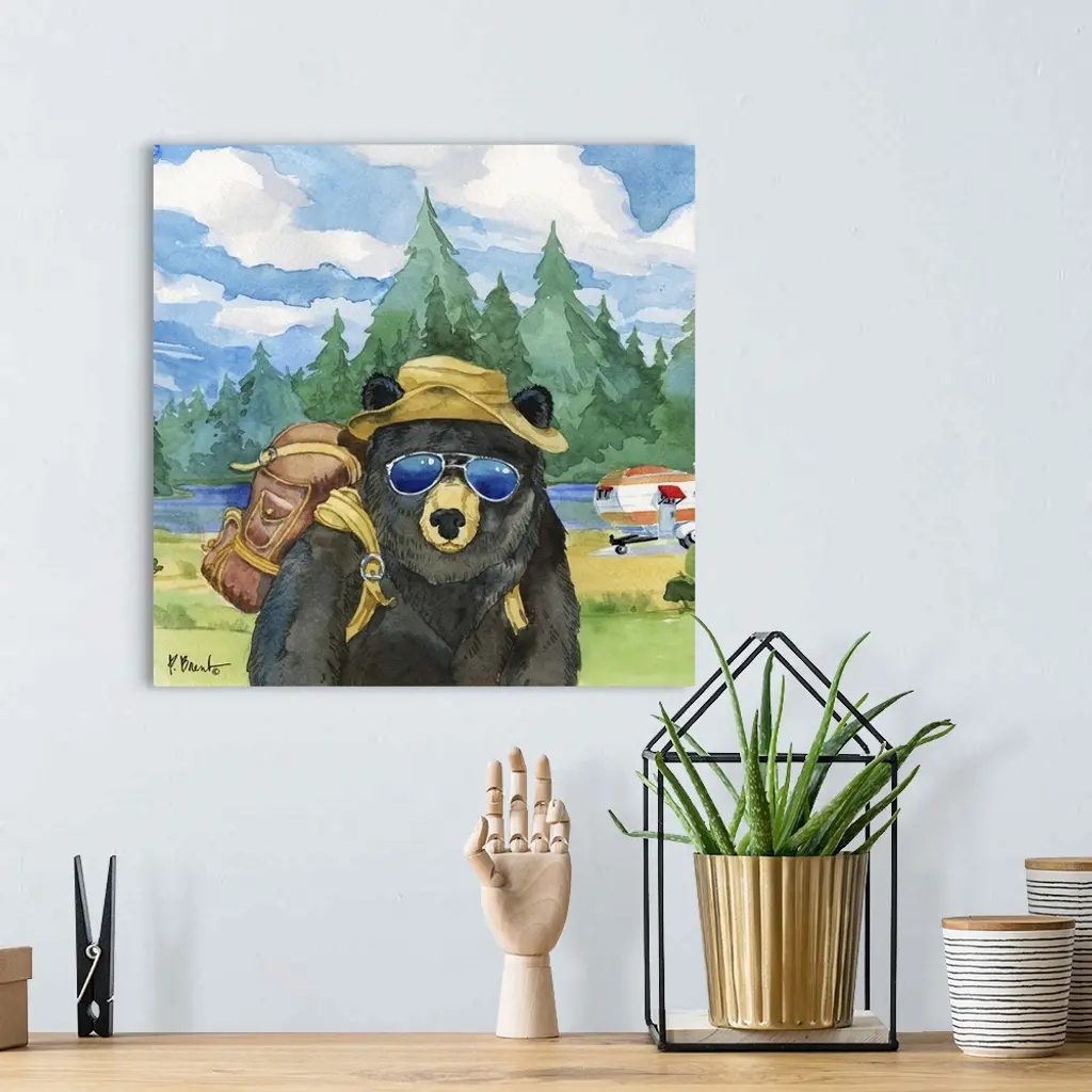 Square watercolor painting of a black bear with camping gear outside in the wilderness.