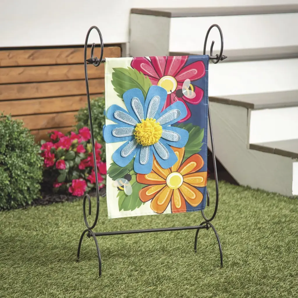 Celebrate the season with our Happy Easter Applique Garden Flag. This welcoming design features a bright Easter egg design with florals and a pink check background for a bright and cheery look. Crafted from multiple layers of 310 denier nylon that can withstand a variety of weather conditions. The artwork is heat-transferred to offer brilliant color, non-fray durability. Flag is doubled-sided so it looks great both coming and going. Our flag creation process involves combining pieces of fade-resistant fabric with tight, detailed stitching in order to create a dimensional effect. Printed ink colors are protected with a watertight seal, so you can enjoy this flag for years to come. Fits standard sized flag stands (not included).