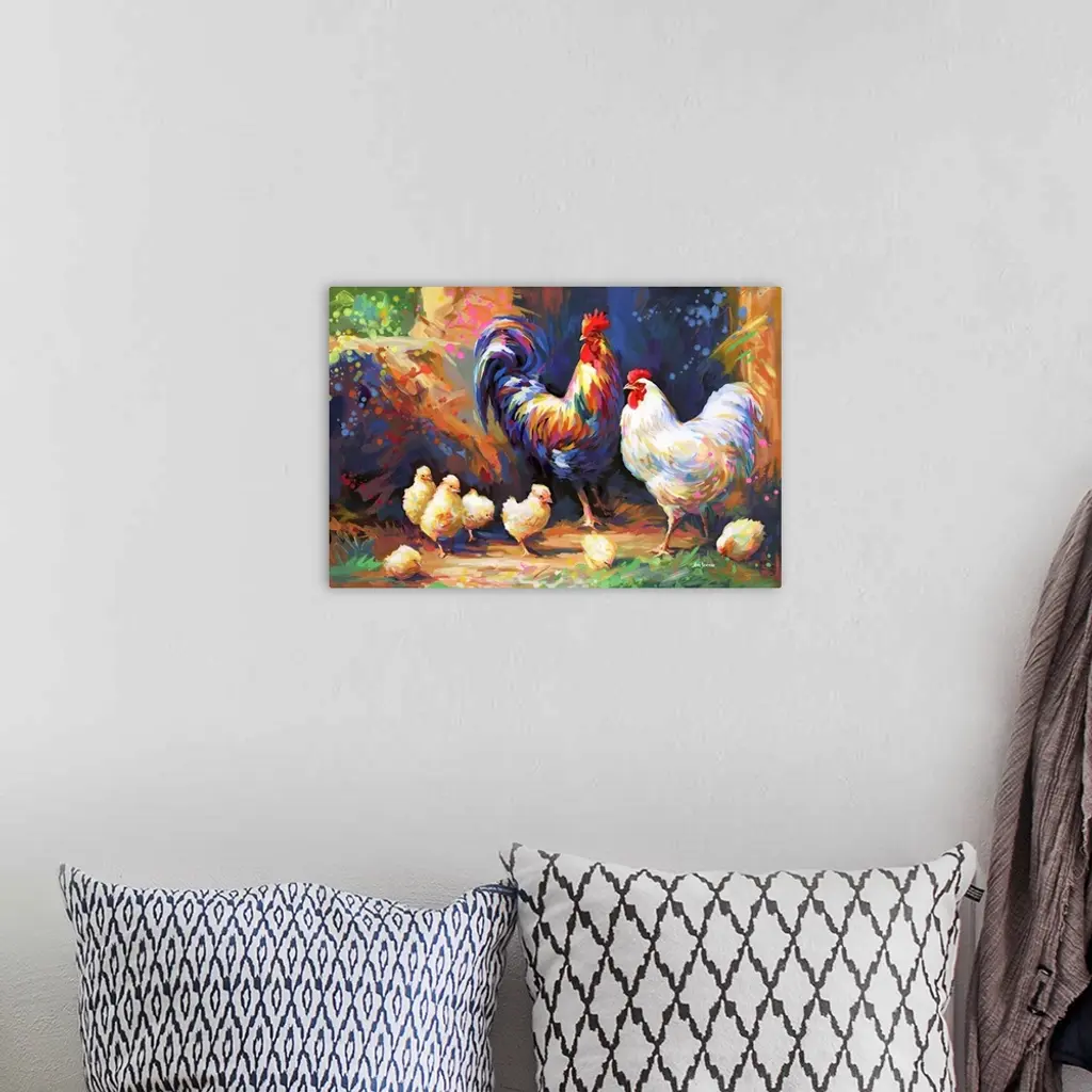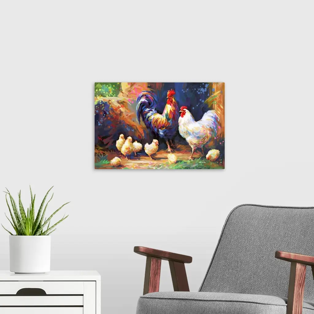 This contemporary impressionistic artwork vividly portrays a farmyard scene, capturing a colorful rooster, hen, and their chicks amidst the countryside's vibrant hues, perfect for bringing a touch of rural beauty to any setting.