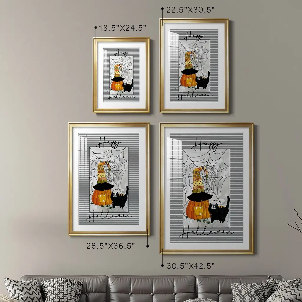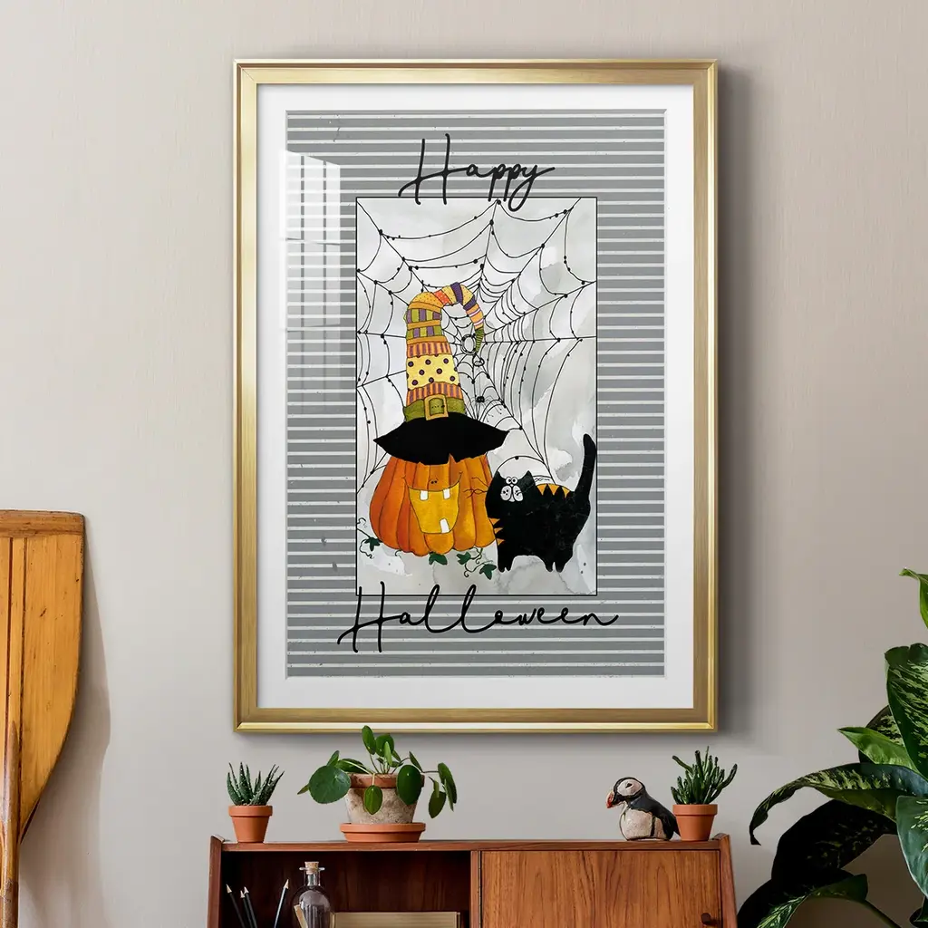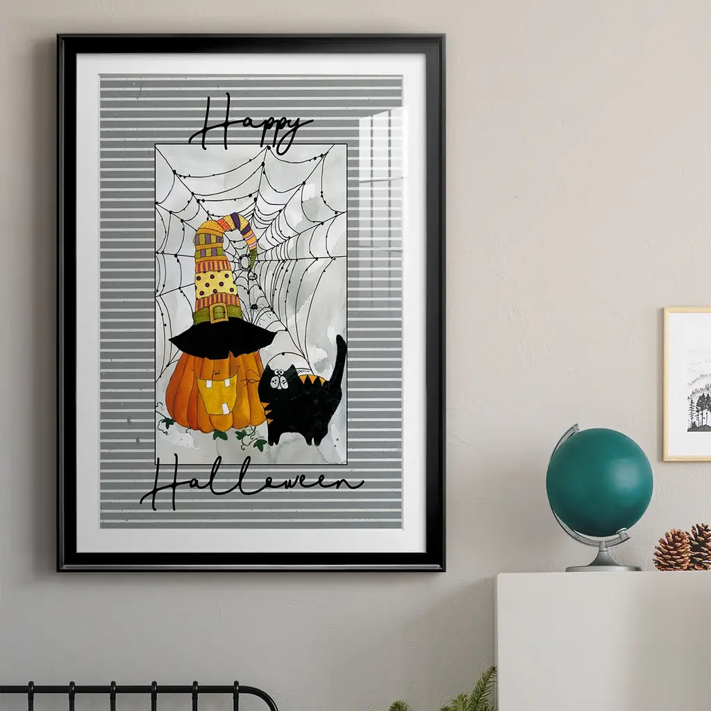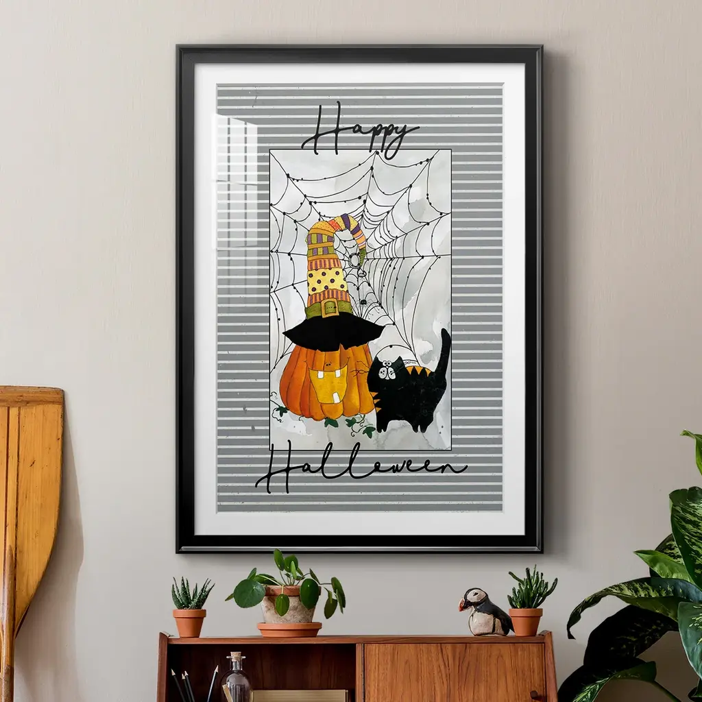 Happy Halloween Pumpkin Premium Framed Print - Ready to Hang A Premium Framed Print created to last. Framed in distressed wood and available in an array of sizes and colors Featuring a beveled a solid wood stretcher bar, each piece comes ready to hand 4 SIZES AVAILABLE 30.5''X42.5'' - Overall Size 26.5'X36.5'' - Overall Size 22.5''x30.5'' - Overall Size 18.5''x24.5'' - Overall Size Each piece is made to order. Each piece comes with hanging hardware. Made in the USA Ready to Hang Giclee Paper Print Acrylic Glass Beveled Matt Board