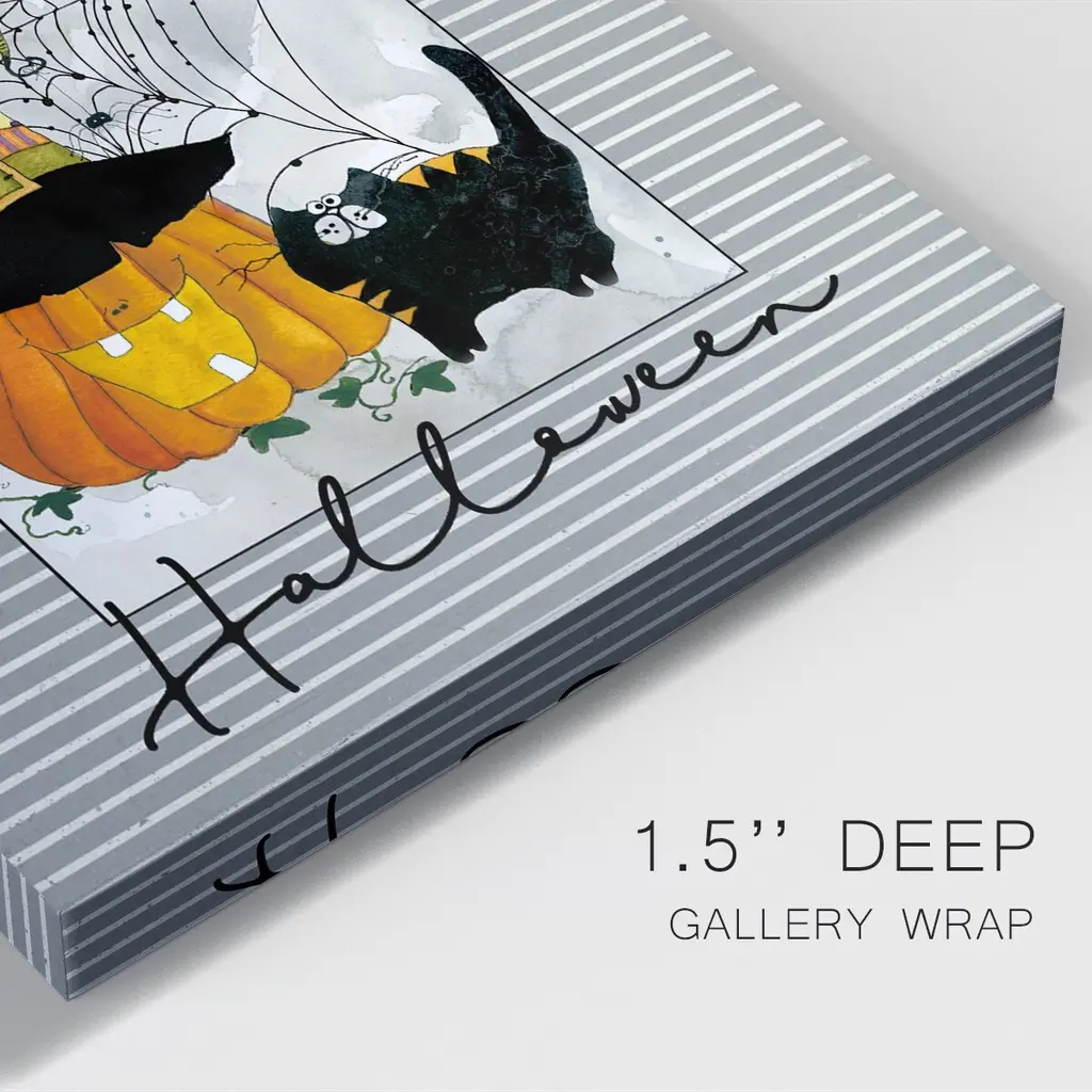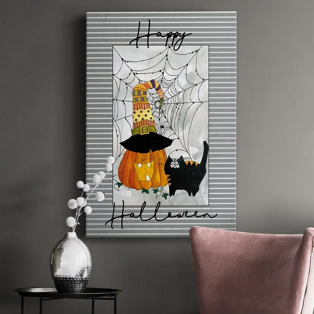 Happy Halloween Pumpkin Premium Gallery Wrapped Canvas - Ready to Hang A premium hand stretched gallery wrapped canvas print created to last. Featuring a beveled a solid wood stretcher bar, each piece comes ready to hand 6 SIZES AVAILABLE 8''X12'' - Overall Size 12''X18'' - Overall Size 18''X27'' - Overall Size 24''x36'' - Overall Size 32''x48'' - Overall Size 40''x60'' - Overall Size Each piece is made to order. Built to Last Each piece comes ready to hang Solid wood stretcher Fade and Water resistant Made domestically